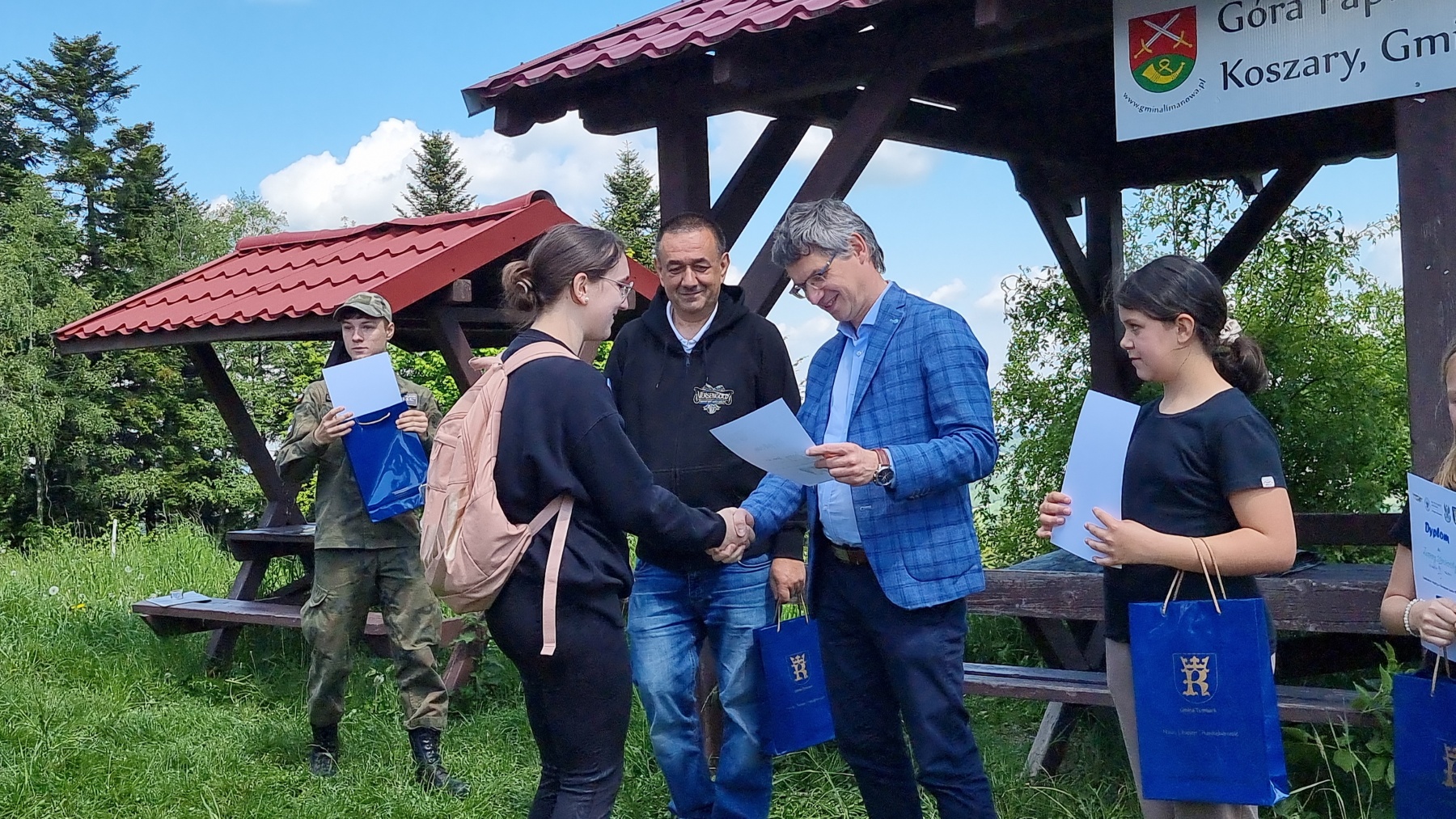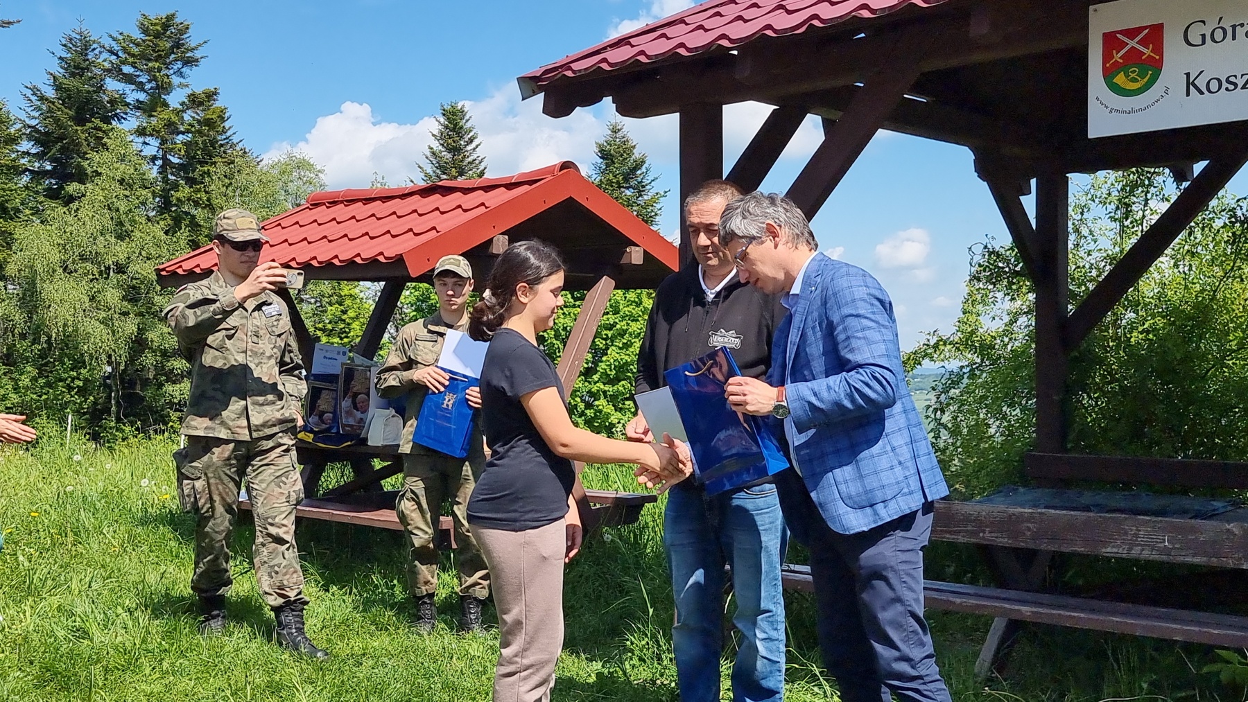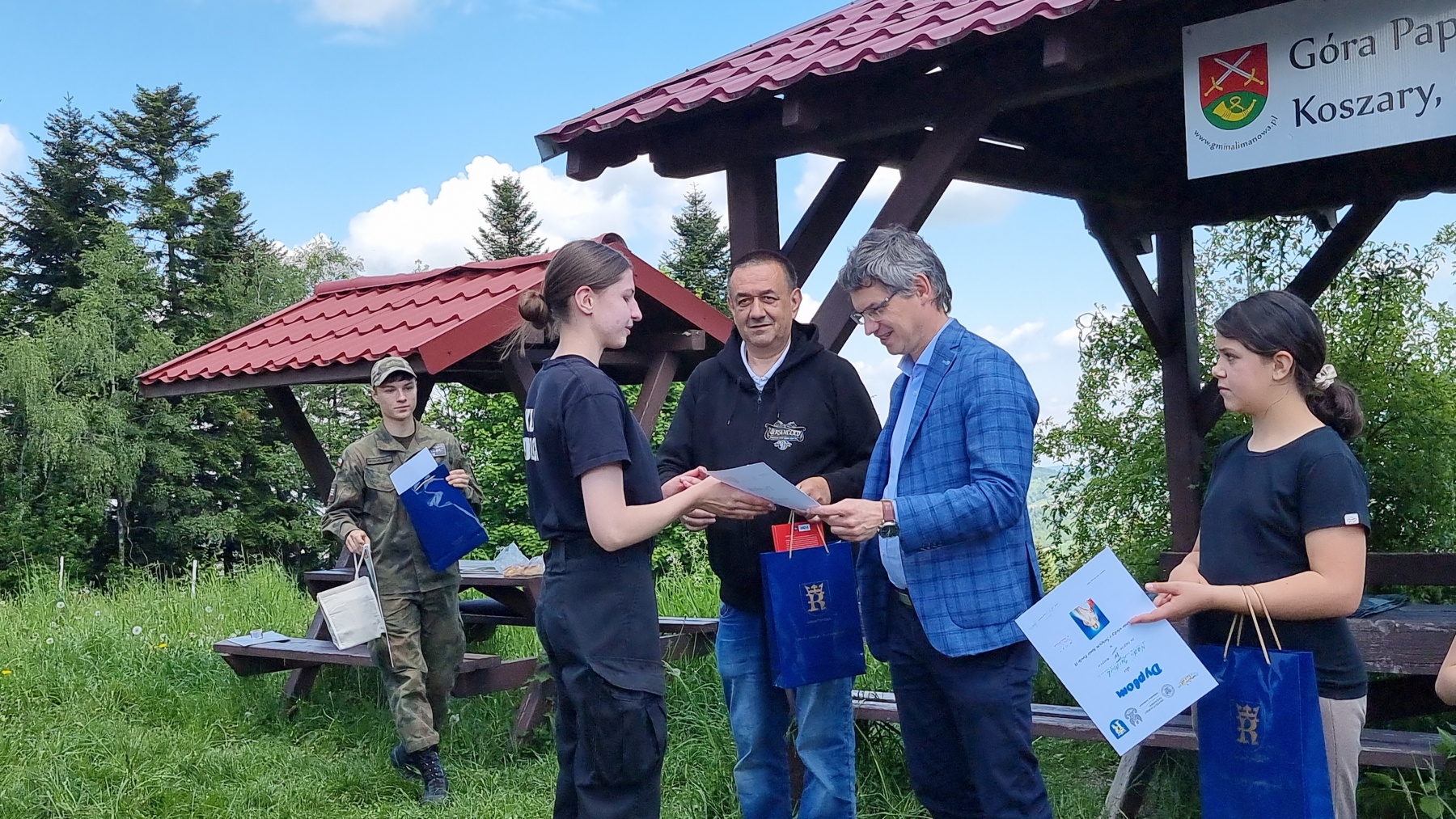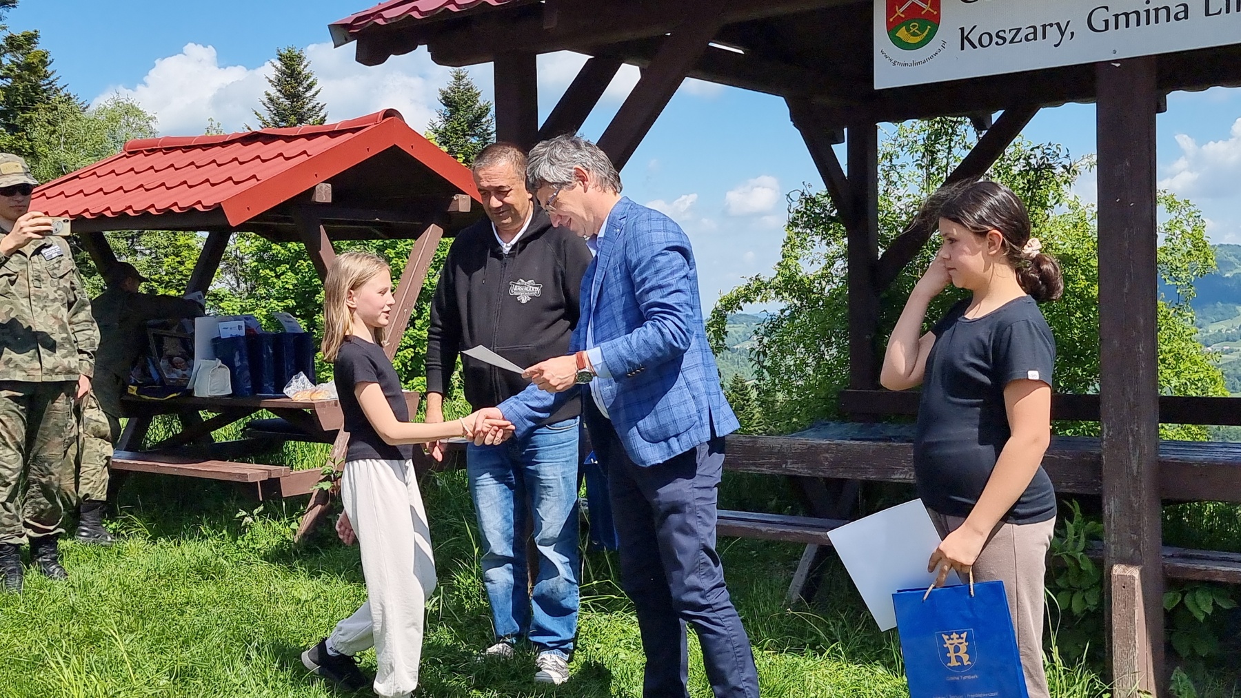 Nagrody zwycięzcom w konkursie wręczali: Paweł Ptaszek, wójt Gminy oraz st. insp. ZS Robert Nowak, dowódca jednostki tymbarskiego Strzelca.