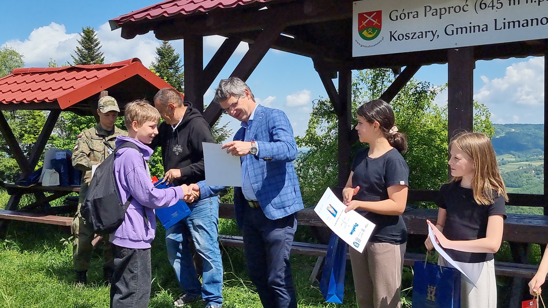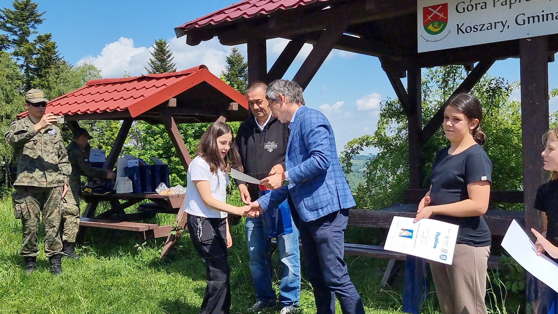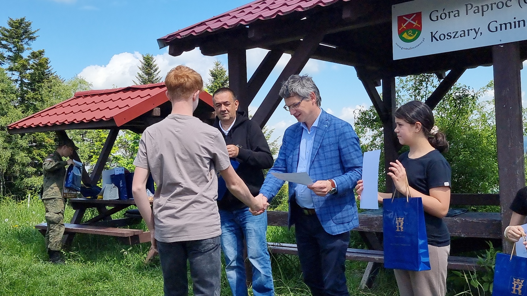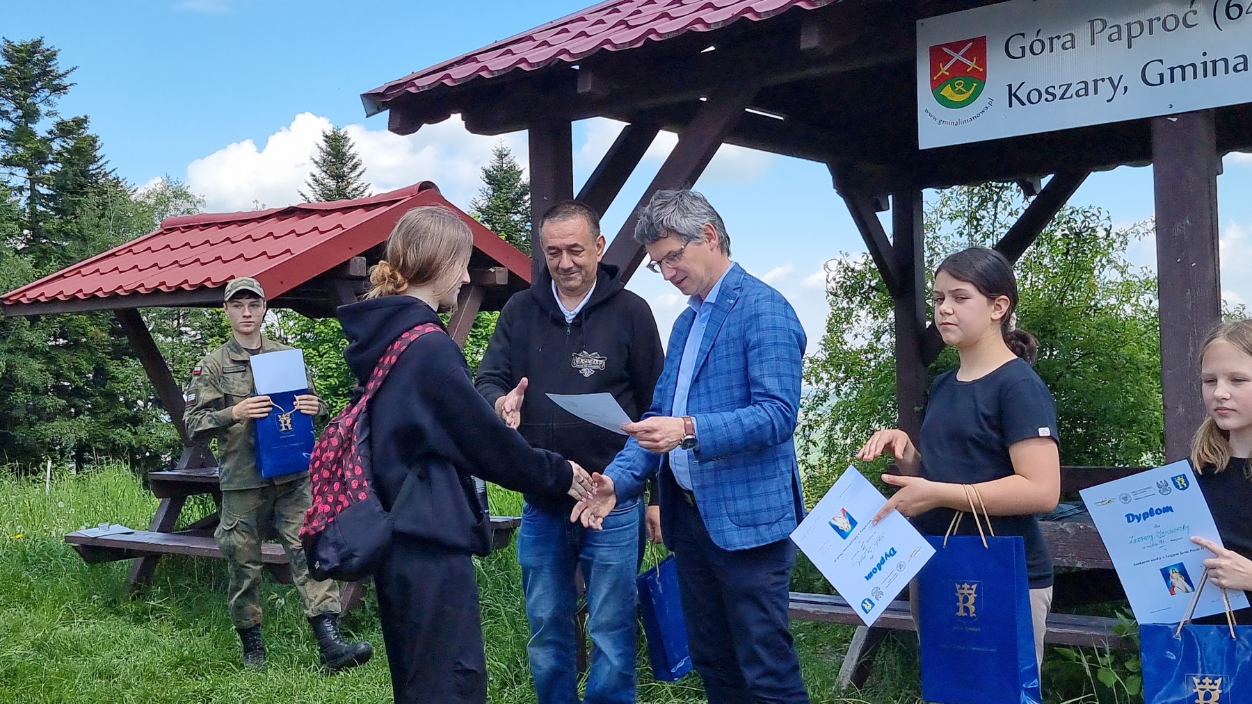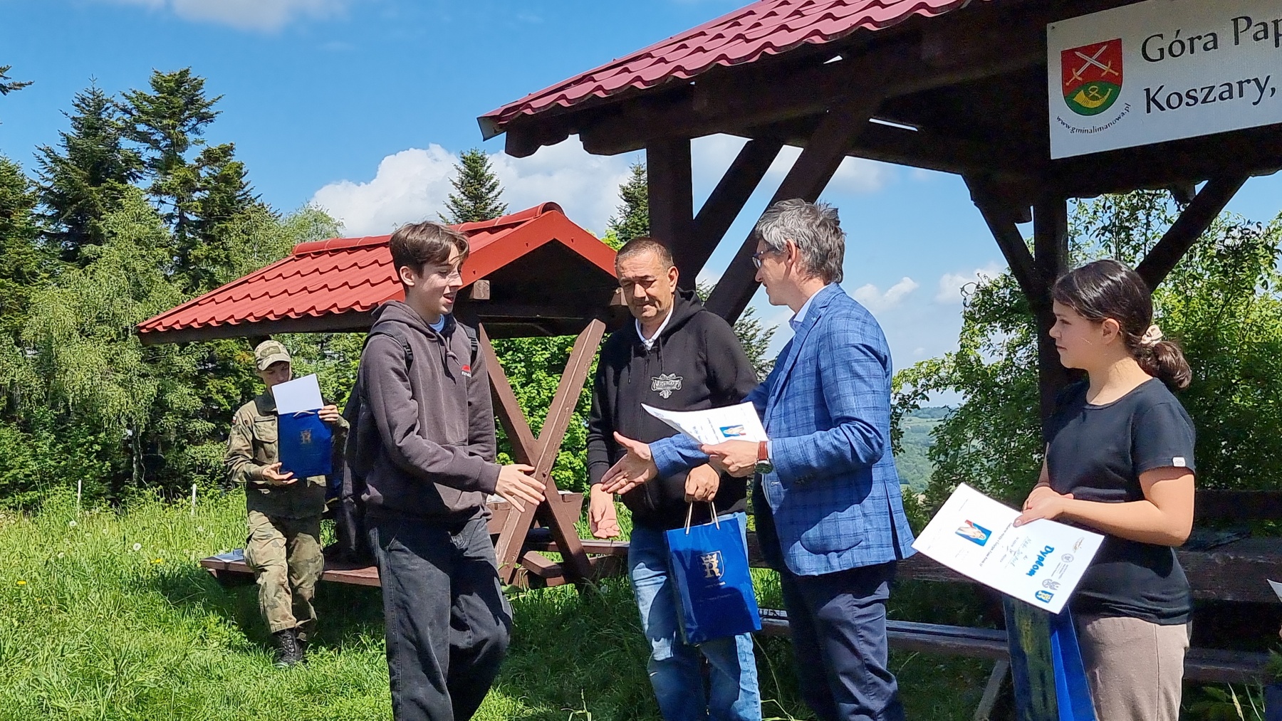 Nagrody zwycięzcom w konkursie wręczali: Paweł Ptaszek, wójt Gminy oraz st. insp. ZS Robert Nowak, dowódca jednostki tymbarskiego Strzelca.