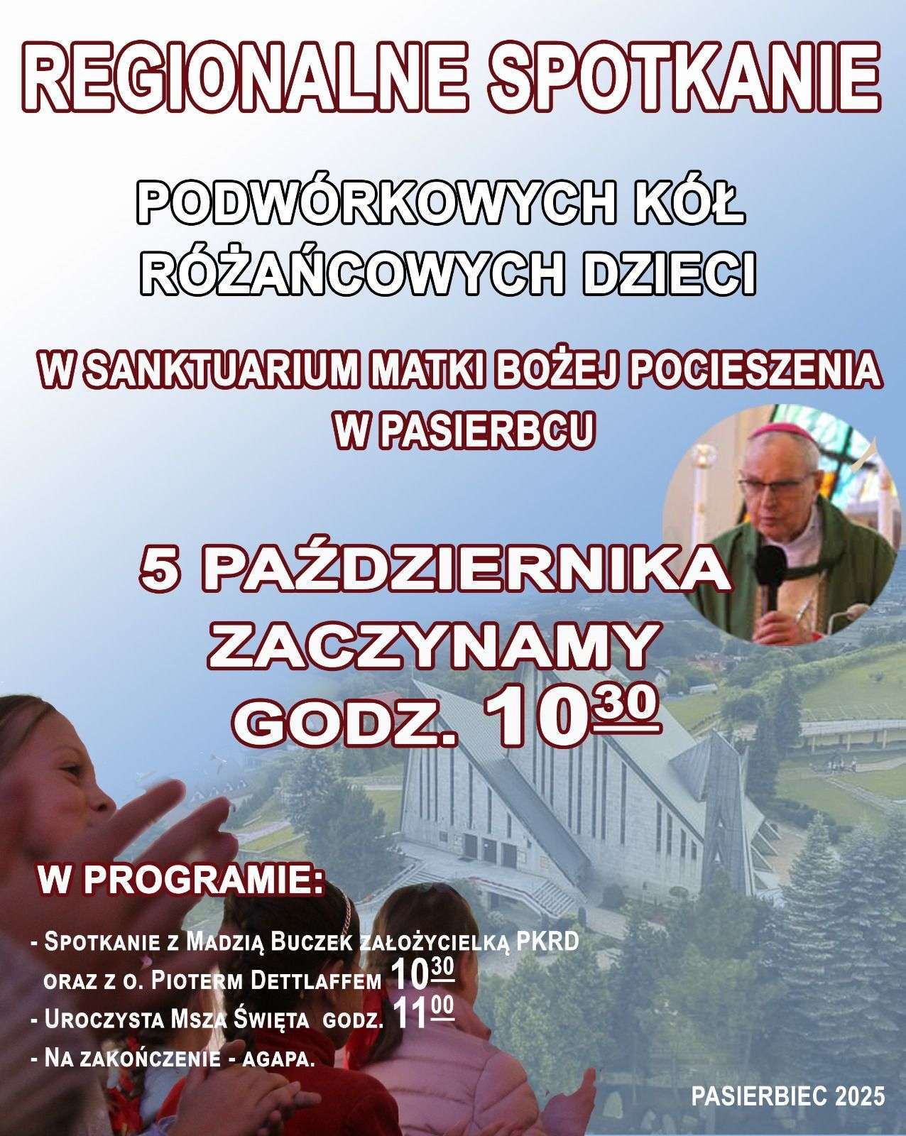 Sanktuarium Matki Bożej Pocieszenia w Pasierbcu zaprasza wszystkie dzieci na Regionalne Spotkanie Podwórkowych Kół Różańcowych Dzieci, które odbędzie się w Sanktuarium 5 października 2025.