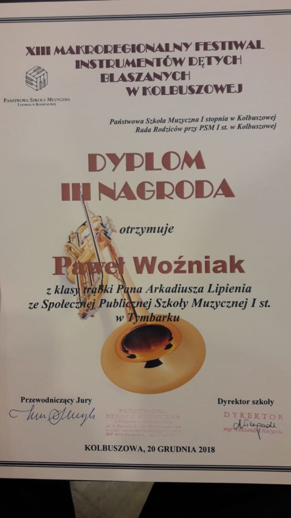20 grudnia 2018 r. w Państwowej Szkole Muzycznej  I st. w Kolbuszowej odbył się  XIII Regionalny Festiwal Instrumentów Dętych Blaszanych. W Festiwalu odnieśli sukcesy uczniowie  Społecznej Publicznej Szkoły Muzycznej w Tymbarku. Paweł Woźniak z klasy trąbki Arkadiusza Lipienia otrzymał III nagrodę oraz  Krzysztof Piaskowy z klasy trąbki Piotra Paska otrzymał wyróżnienie II stopnia.