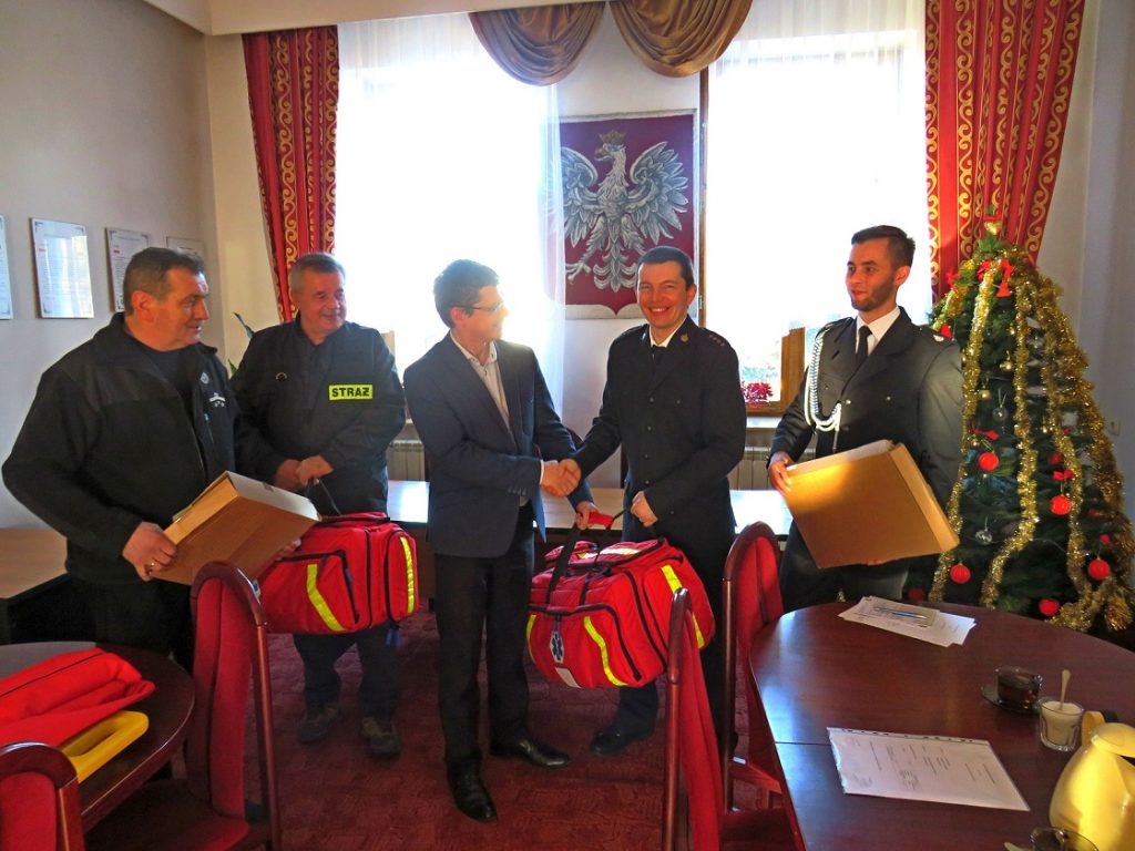 Zestawy przekazał gospodarz gminy Tymbark Paweł Ptaszek, a sprzęt tak bardzo potrzebny do niesienia pomocy poszkodowanym, odebrali: druhowie Stanisław Przybylski i Zbigniew Kaptur z OSP Tymbark, Jacek Atłas i Karol Czyrnek z OSP Podłopień.
