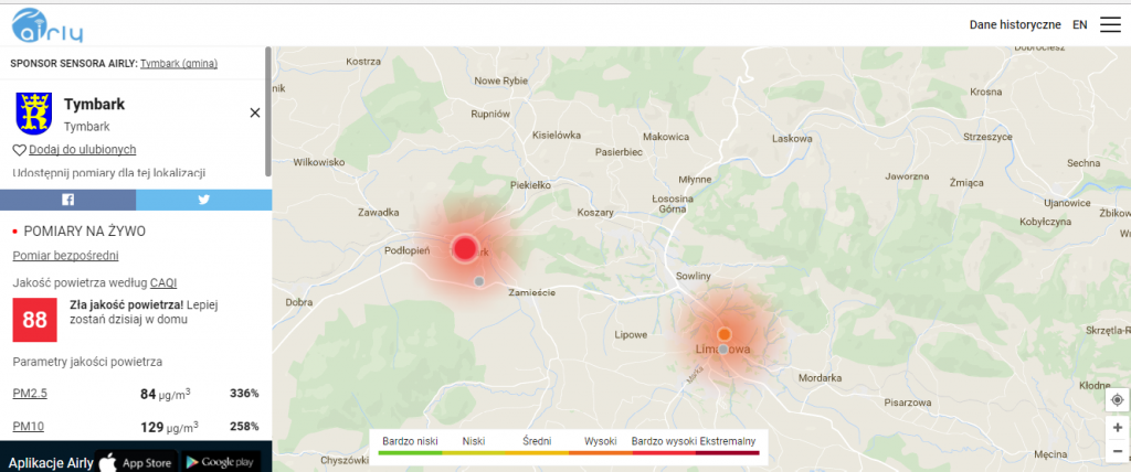 Mieszkańcy mogą śledzić aktualny stan powietrza w naszej gminie dzięki aplikacji „Airly” udostępnionej na stronie internetowej urzędu gminy (www.tymbark.pl) lub mogą ją pobrać na swój telefon .