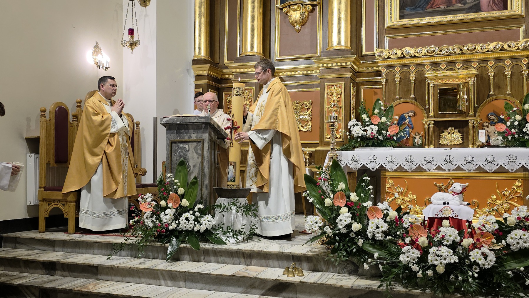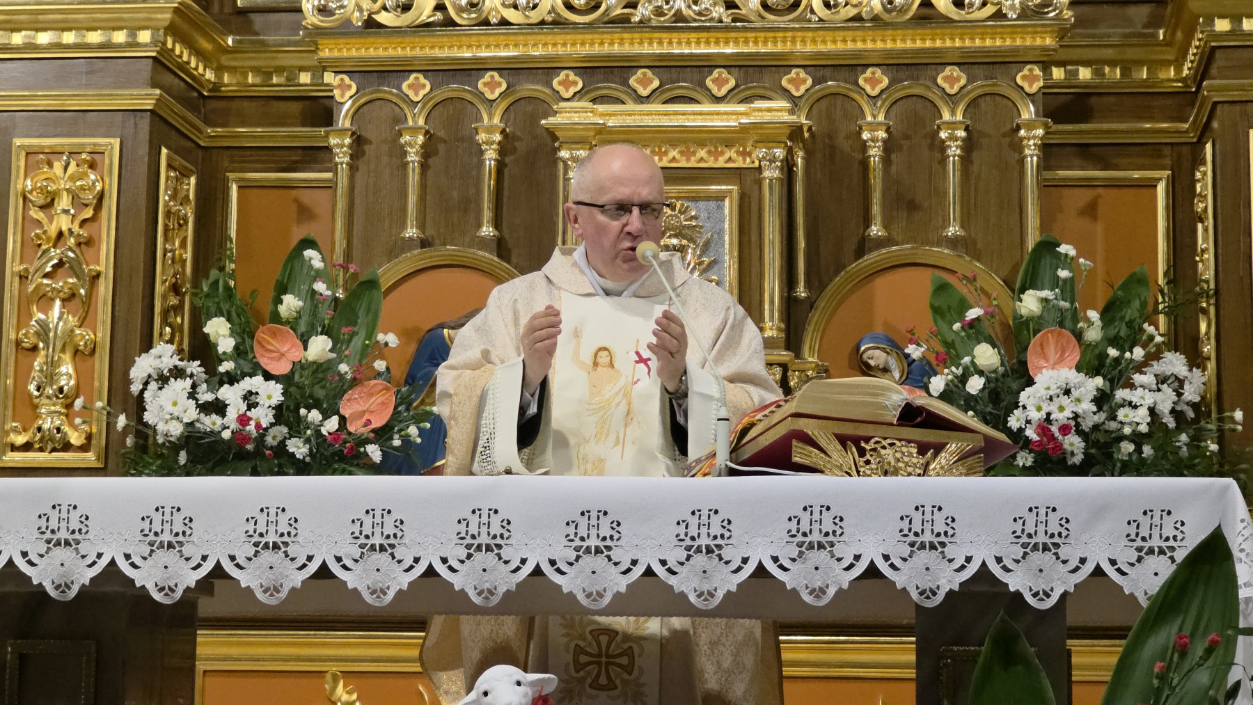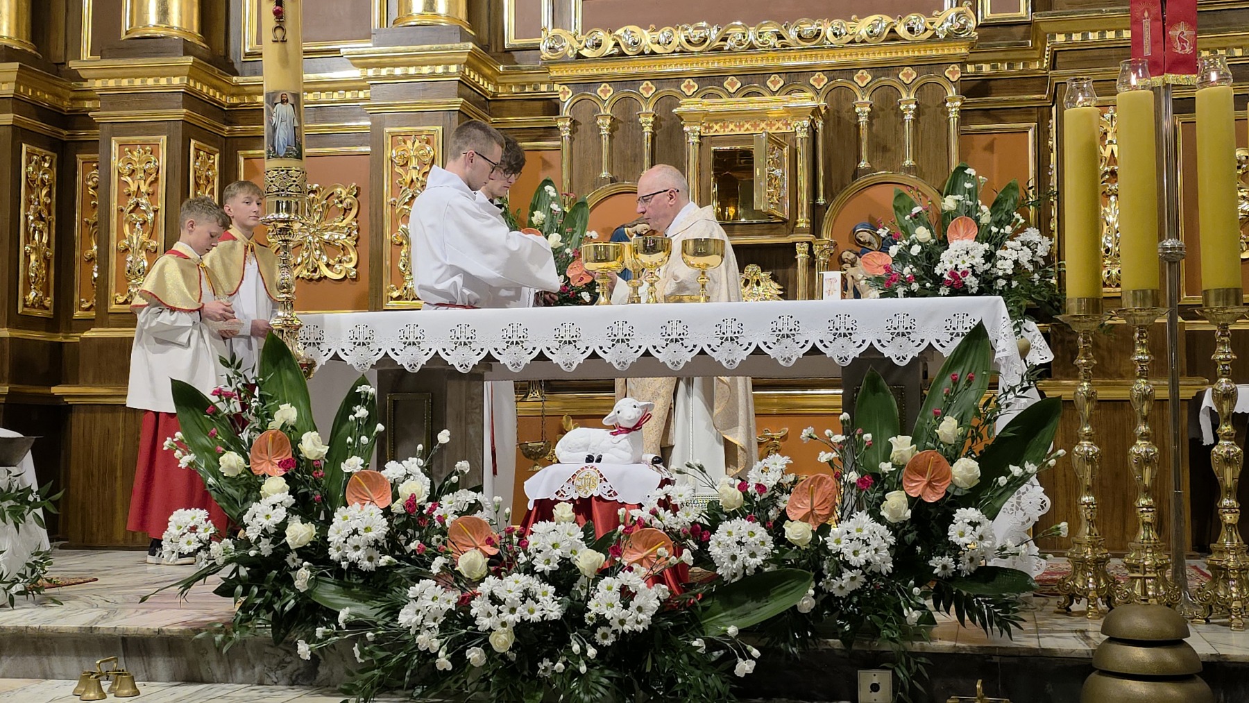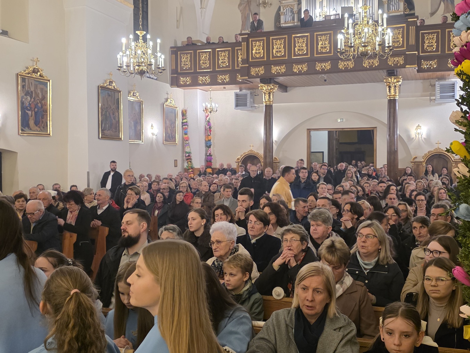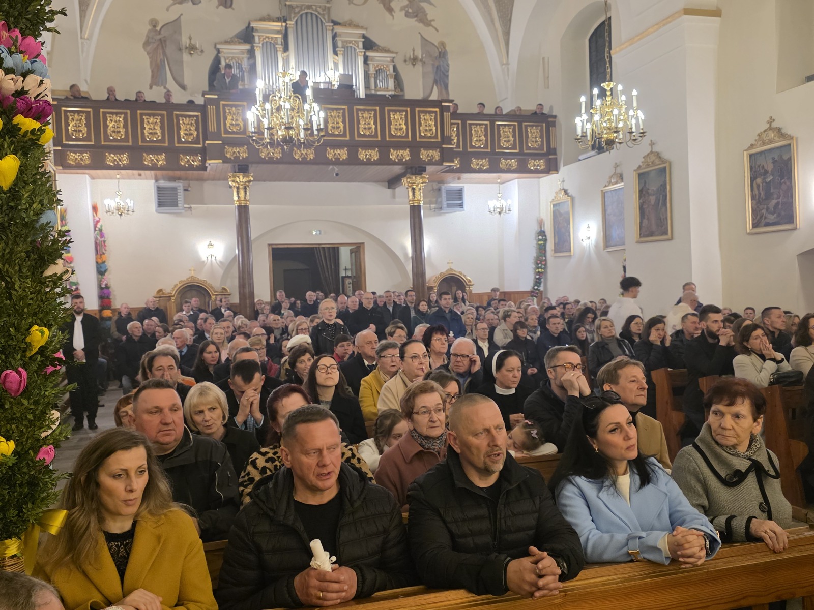 Obrzęd błogosławieństwa pokarmów na stół wielkanocny oraz życzenia od kapłanów (Parafia Tymbark)