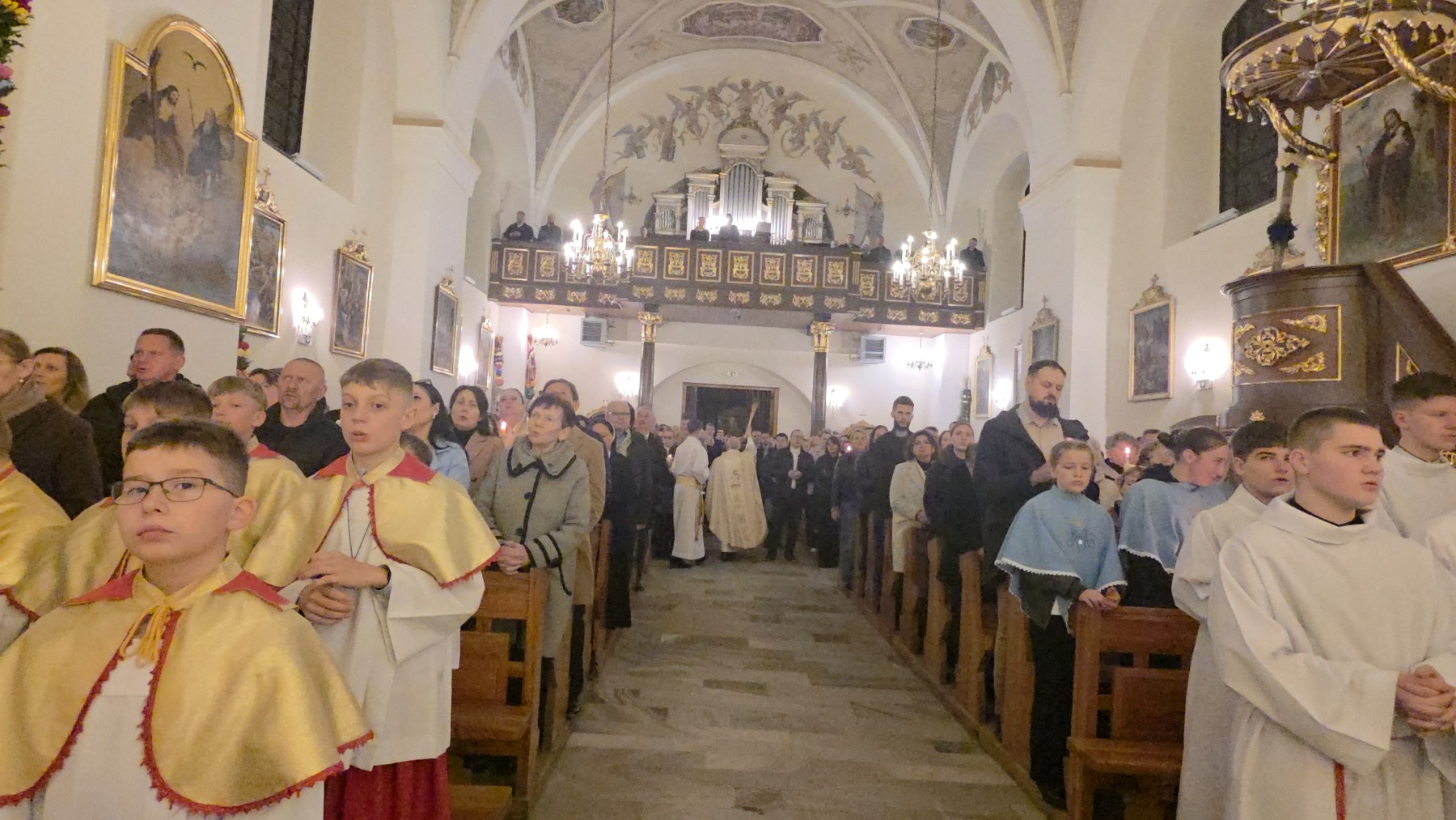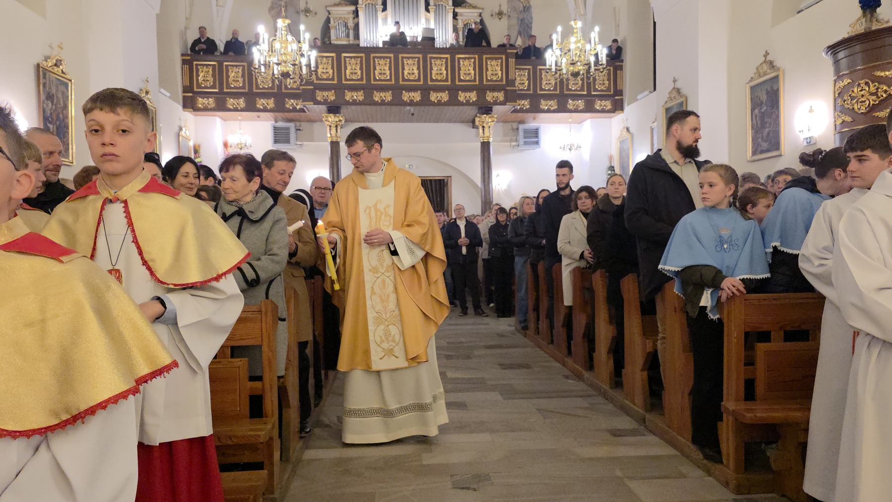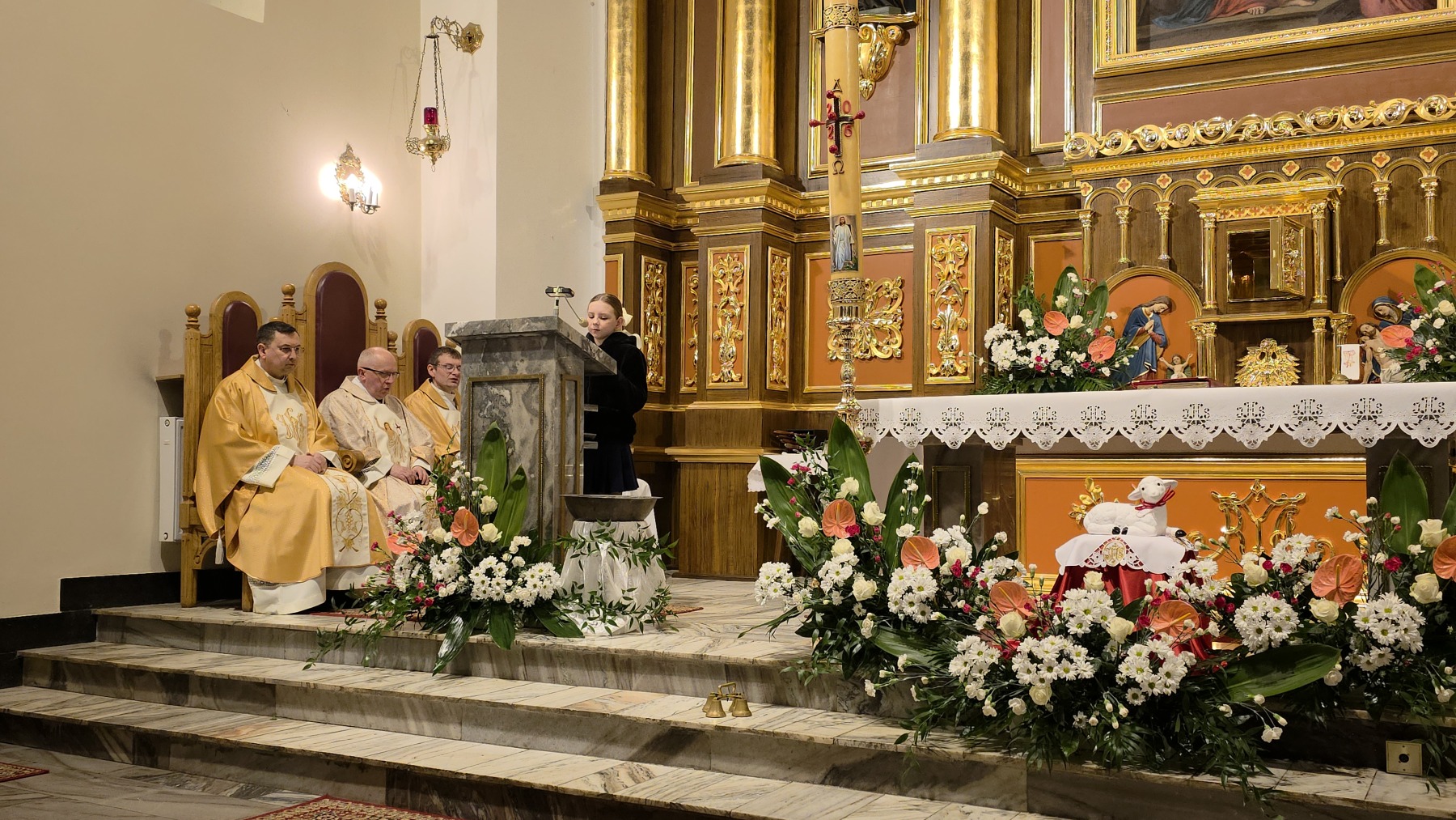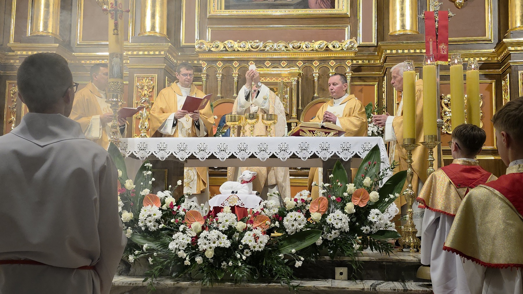 Obrzęd błogosławieństwa pokarmów na stół wielkanocny oraz życzenia od kapłanów (Parafia Tymbark)