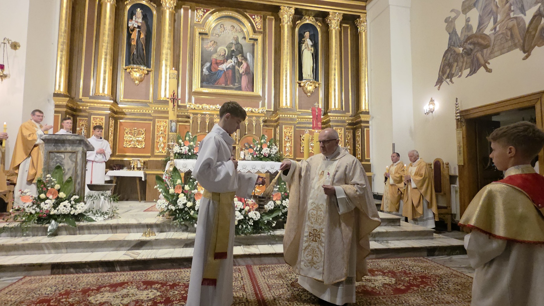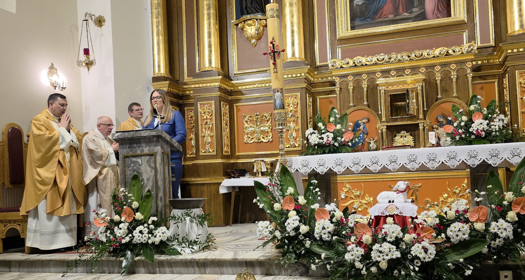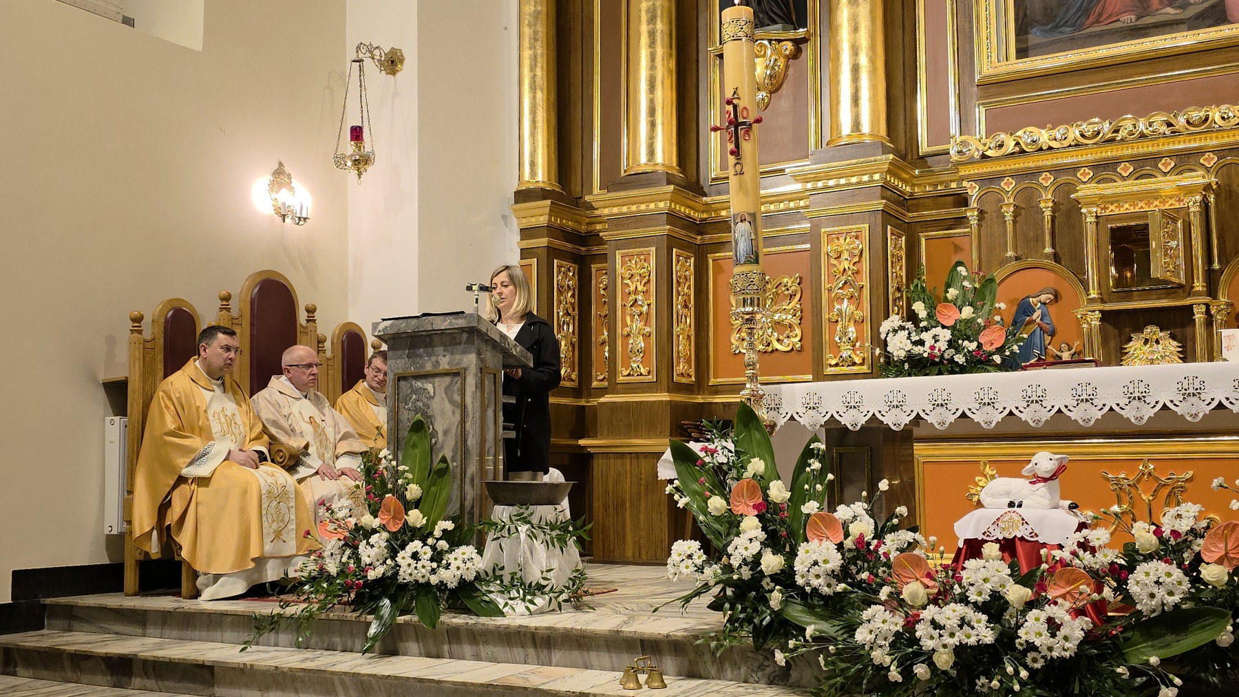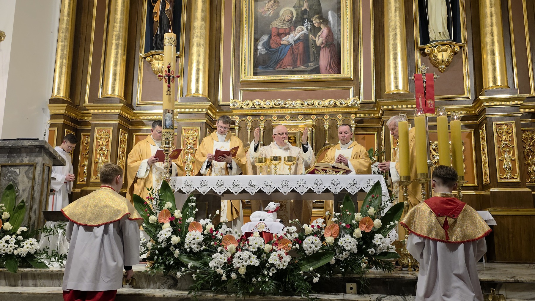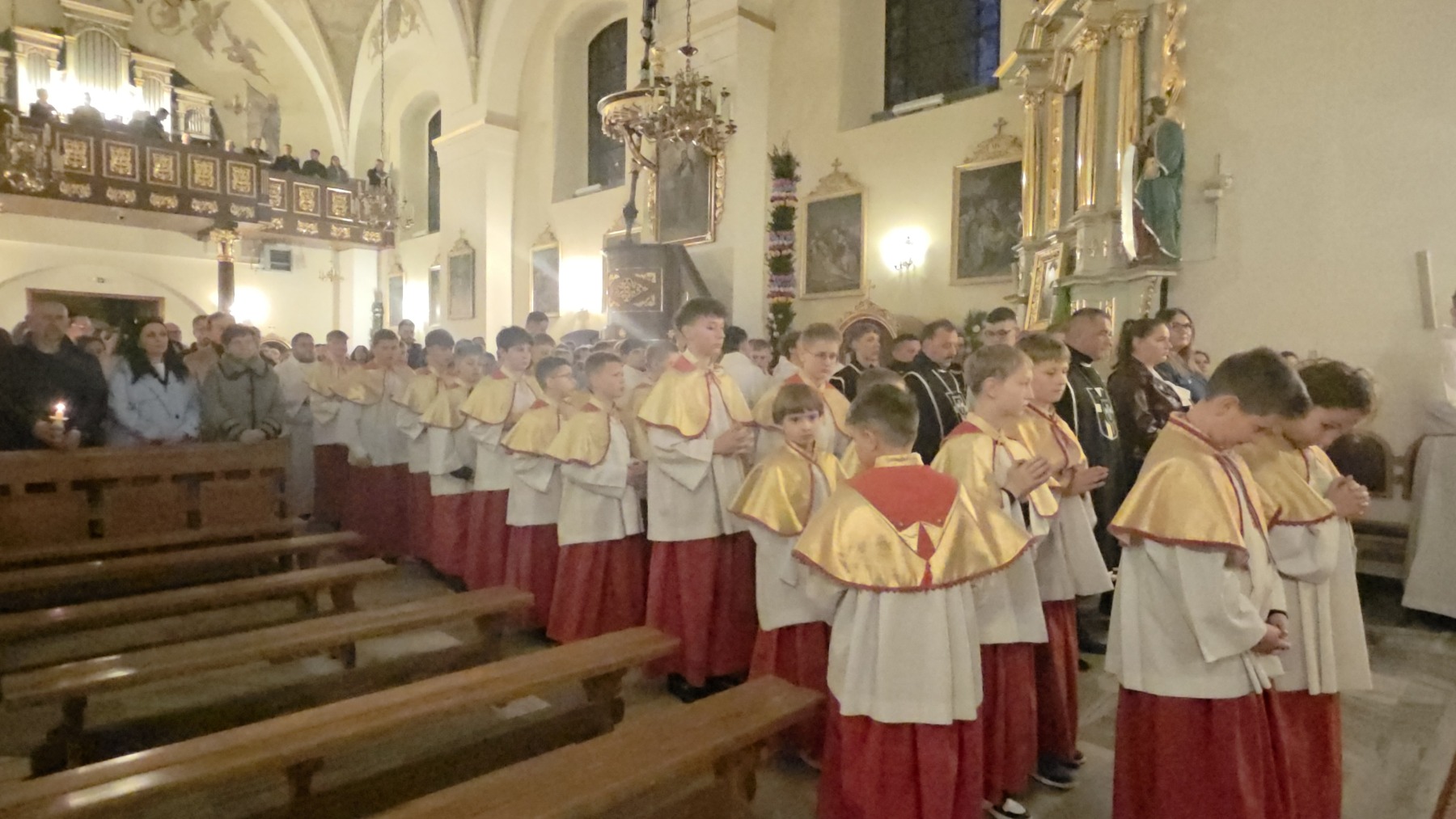Obrzęd błogosławieństwa pokarmów na stół wielkanocny oraz życzenia od kapłanów (Parafia Tymbark)