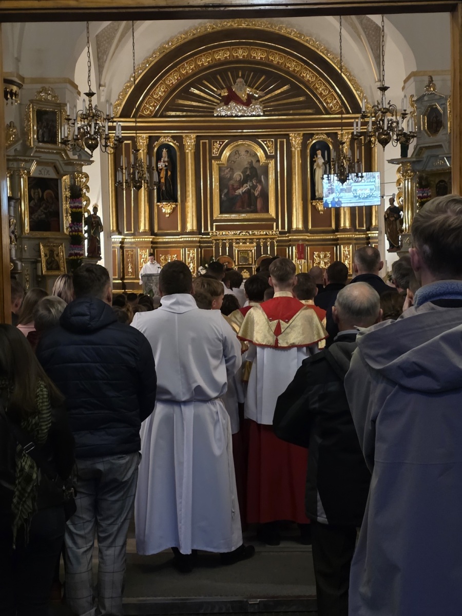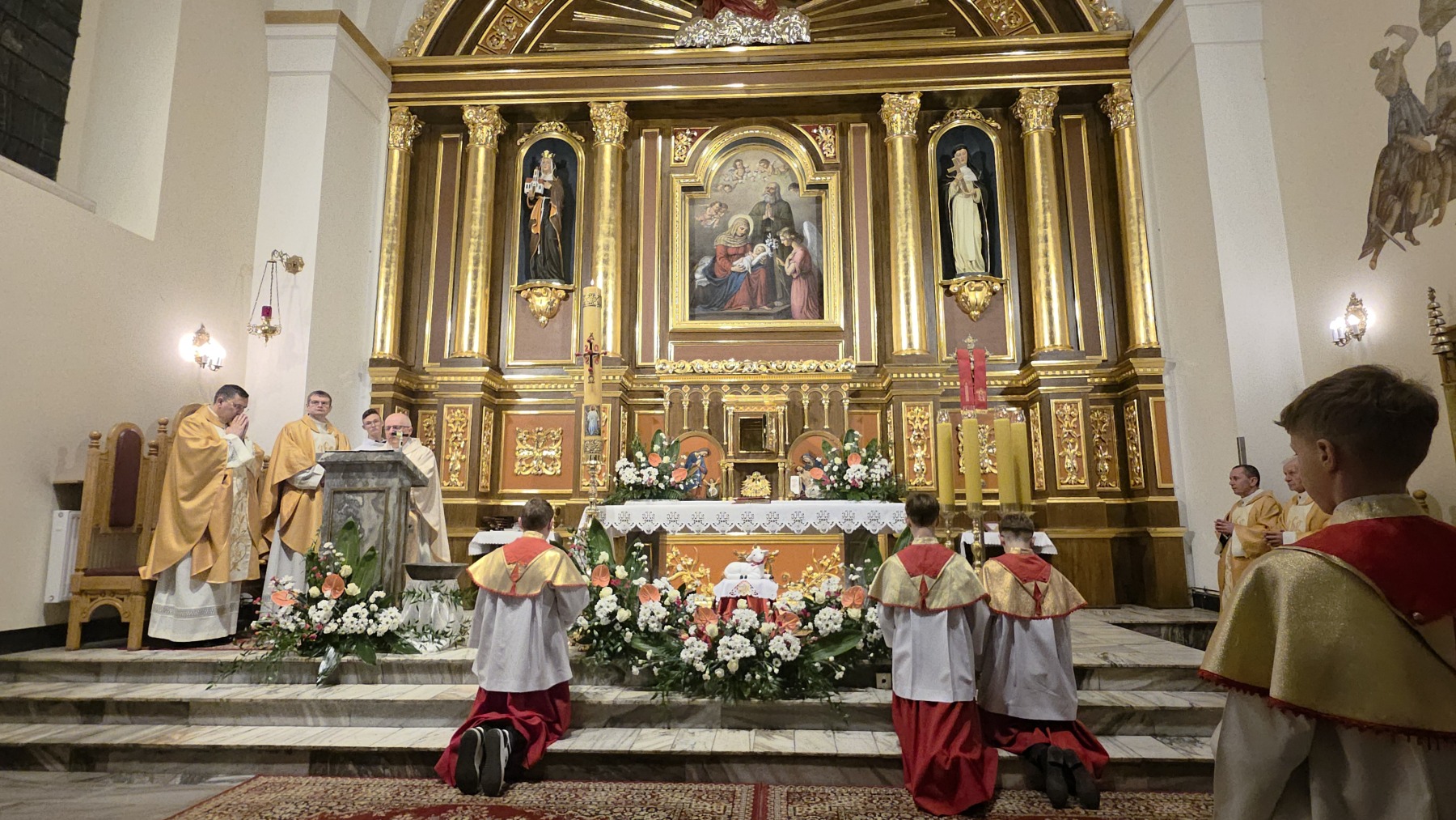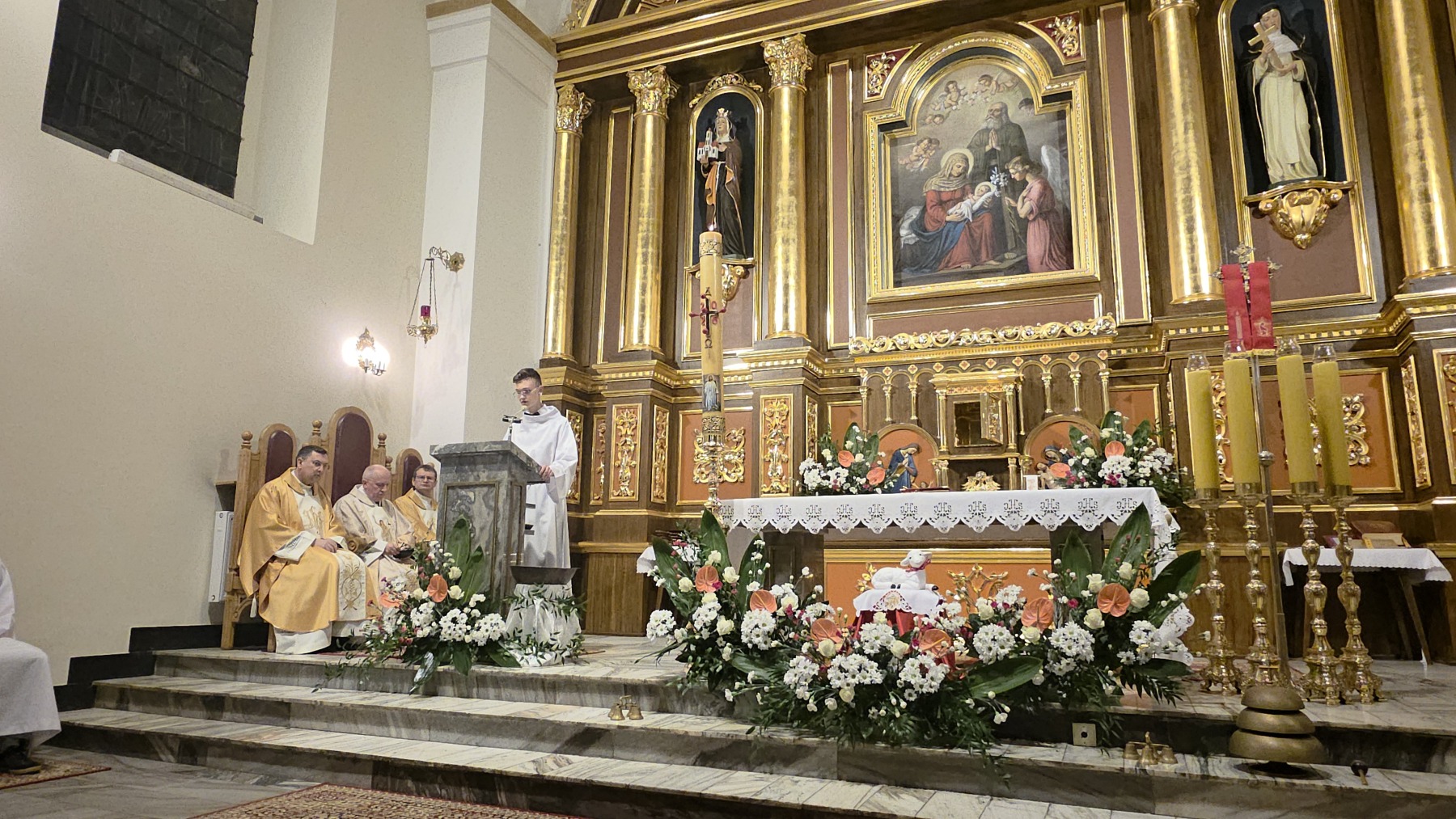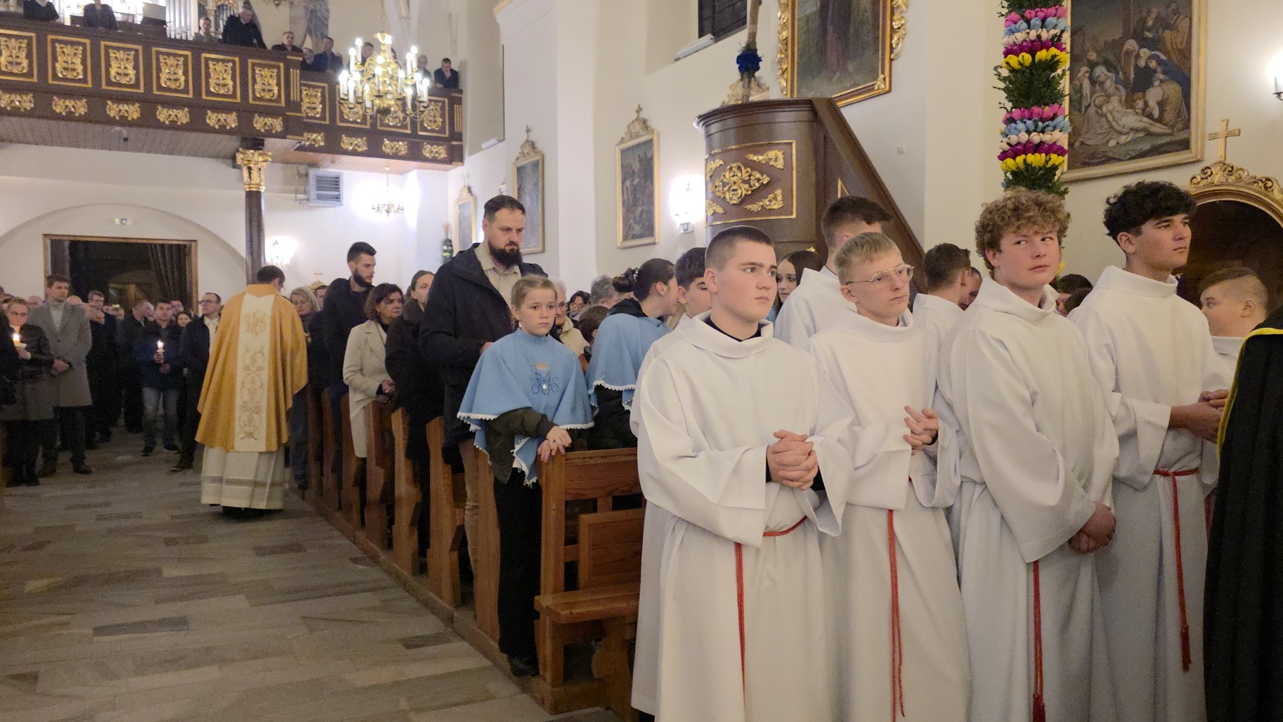 Obrzęd błogosławieństwa pokarmów na stół wielkanocny oraz życzenia od kapłanów (Parafia Tymbark)