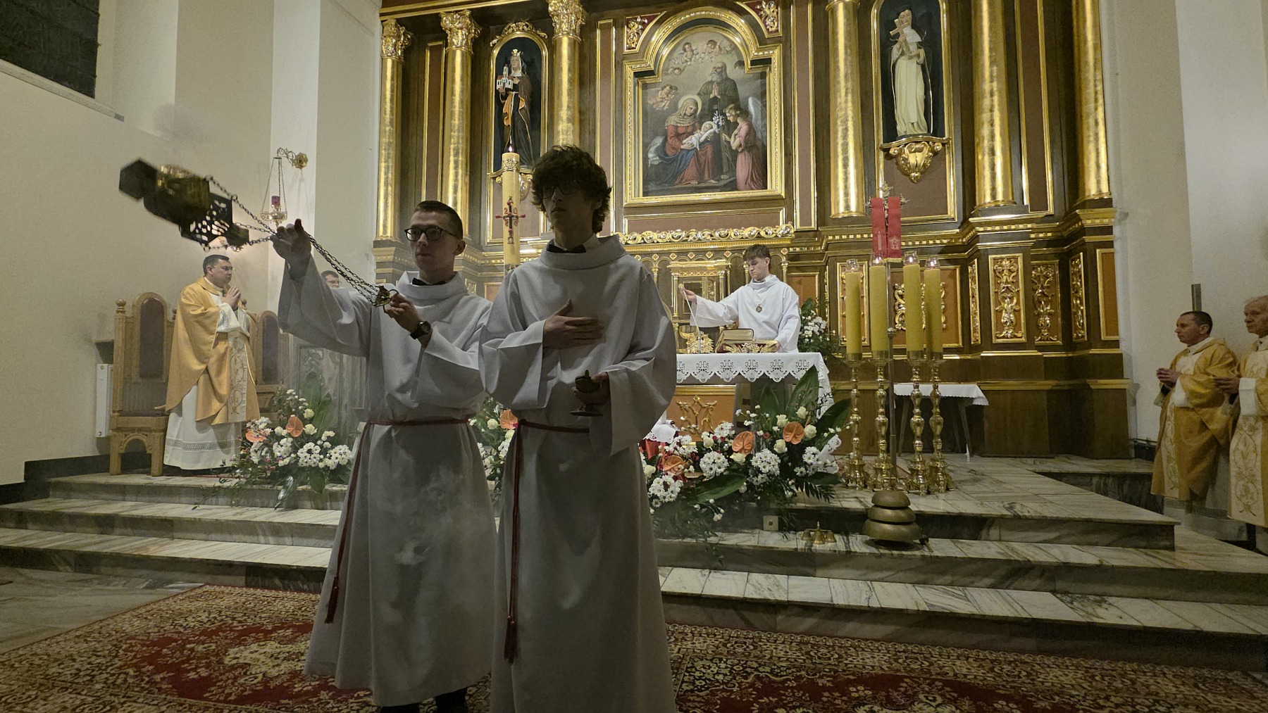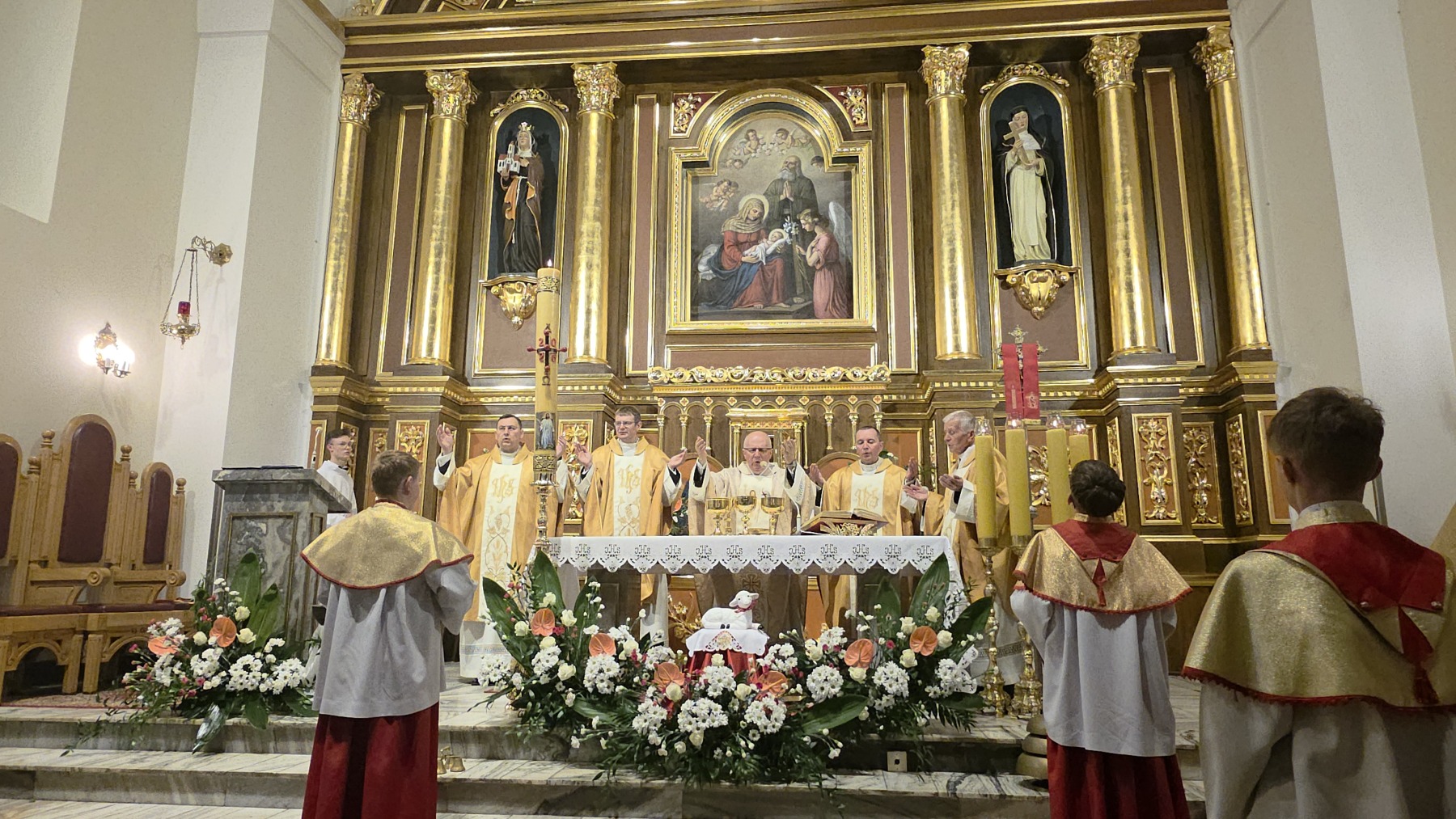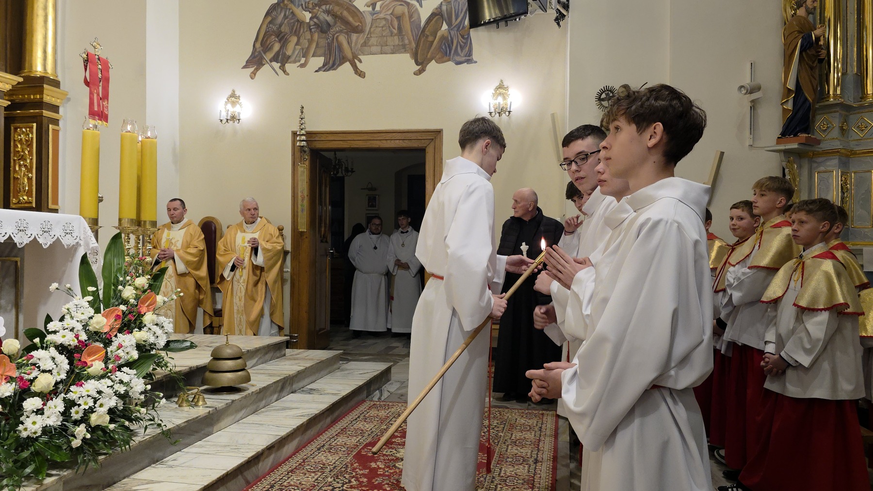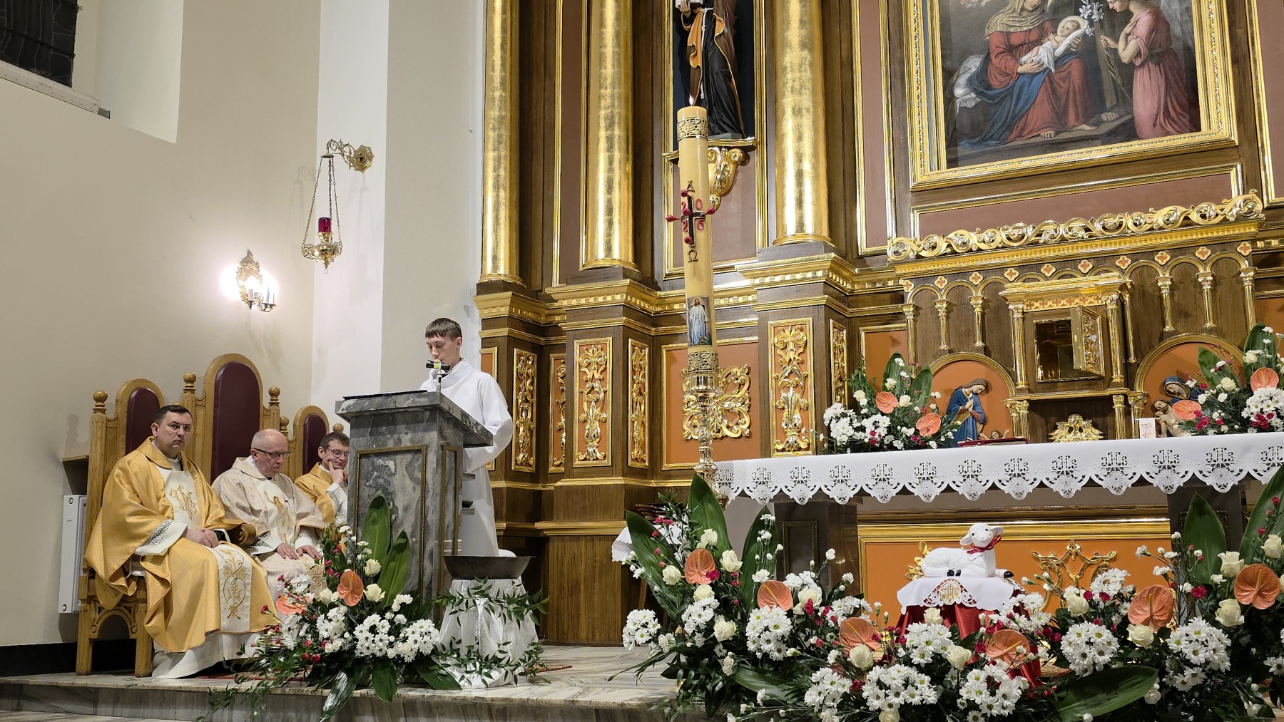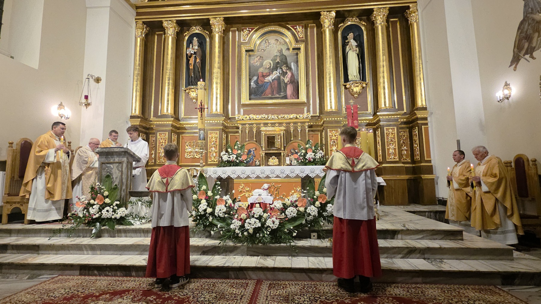 Obrzęd błogosławieństwa pokarmów na stół wielkanocny oraz życzenia od kapłanów (Parafia Tymbark)