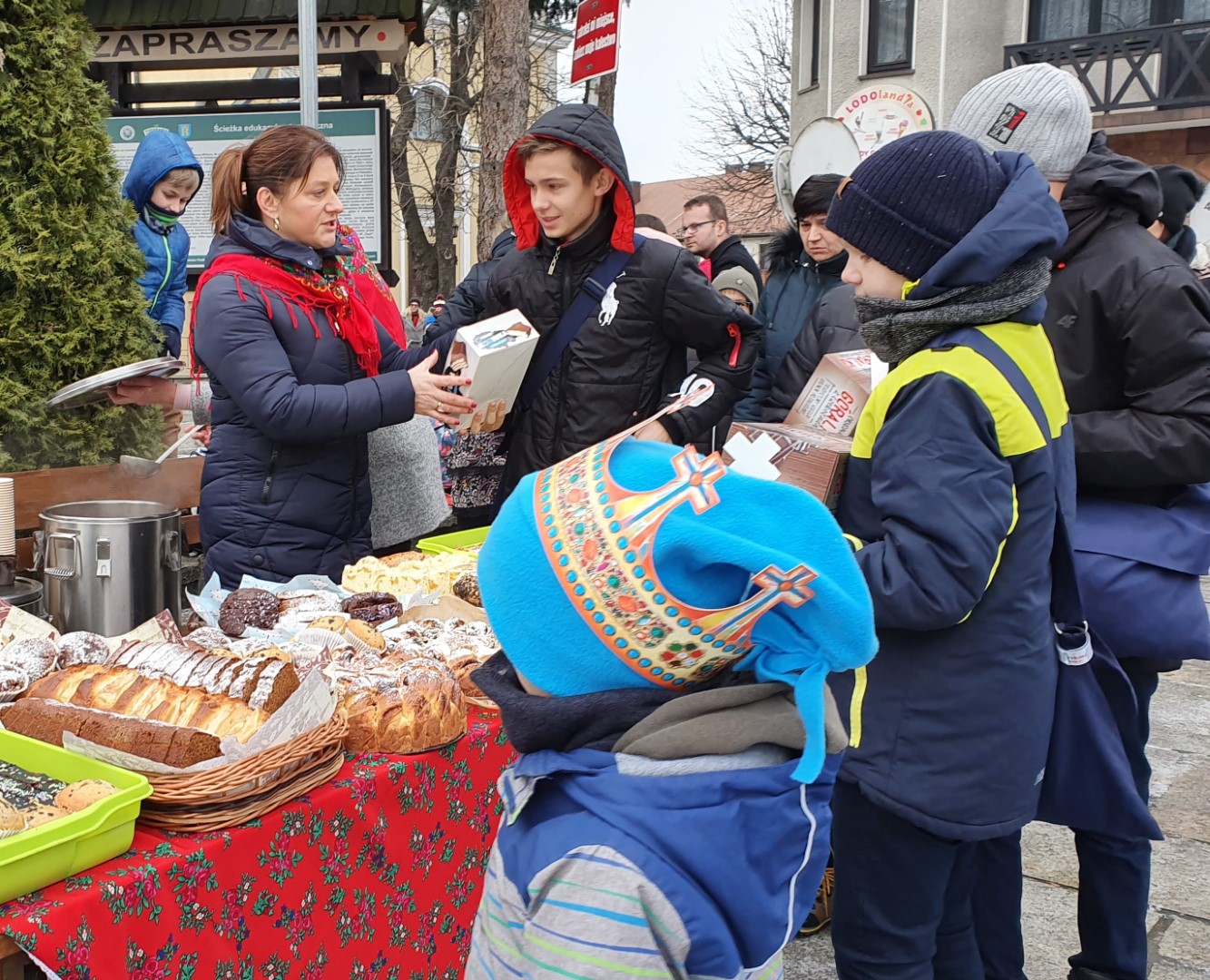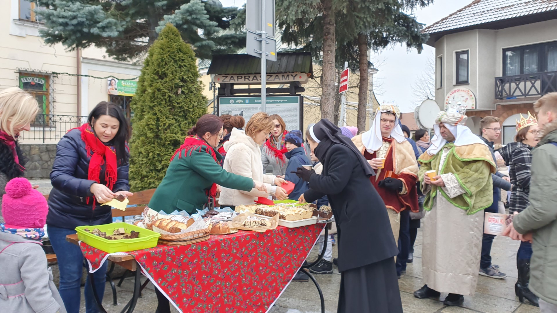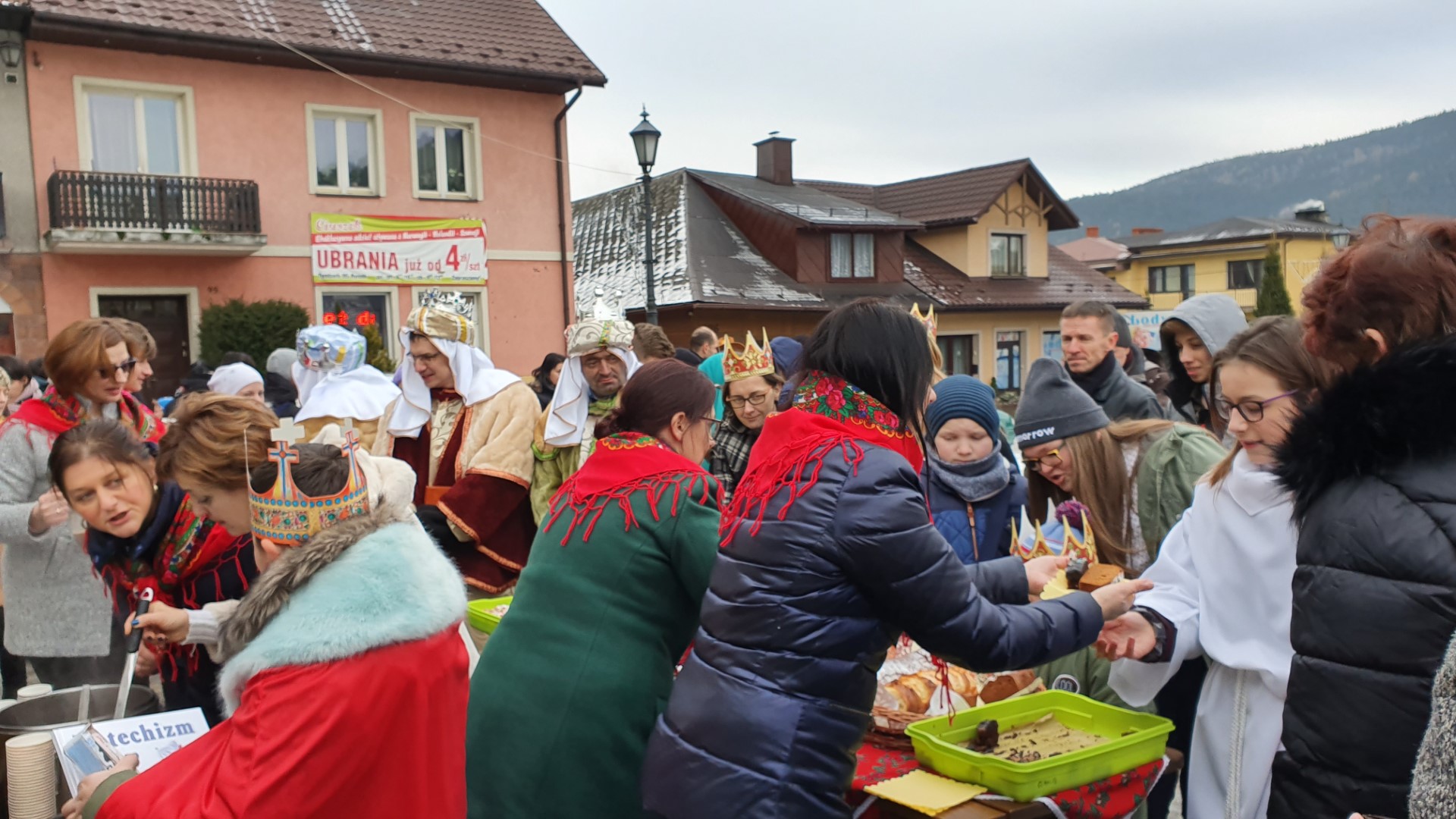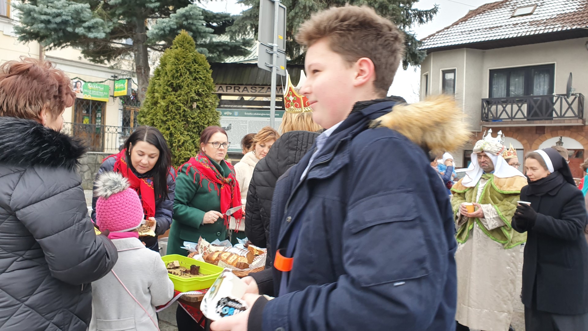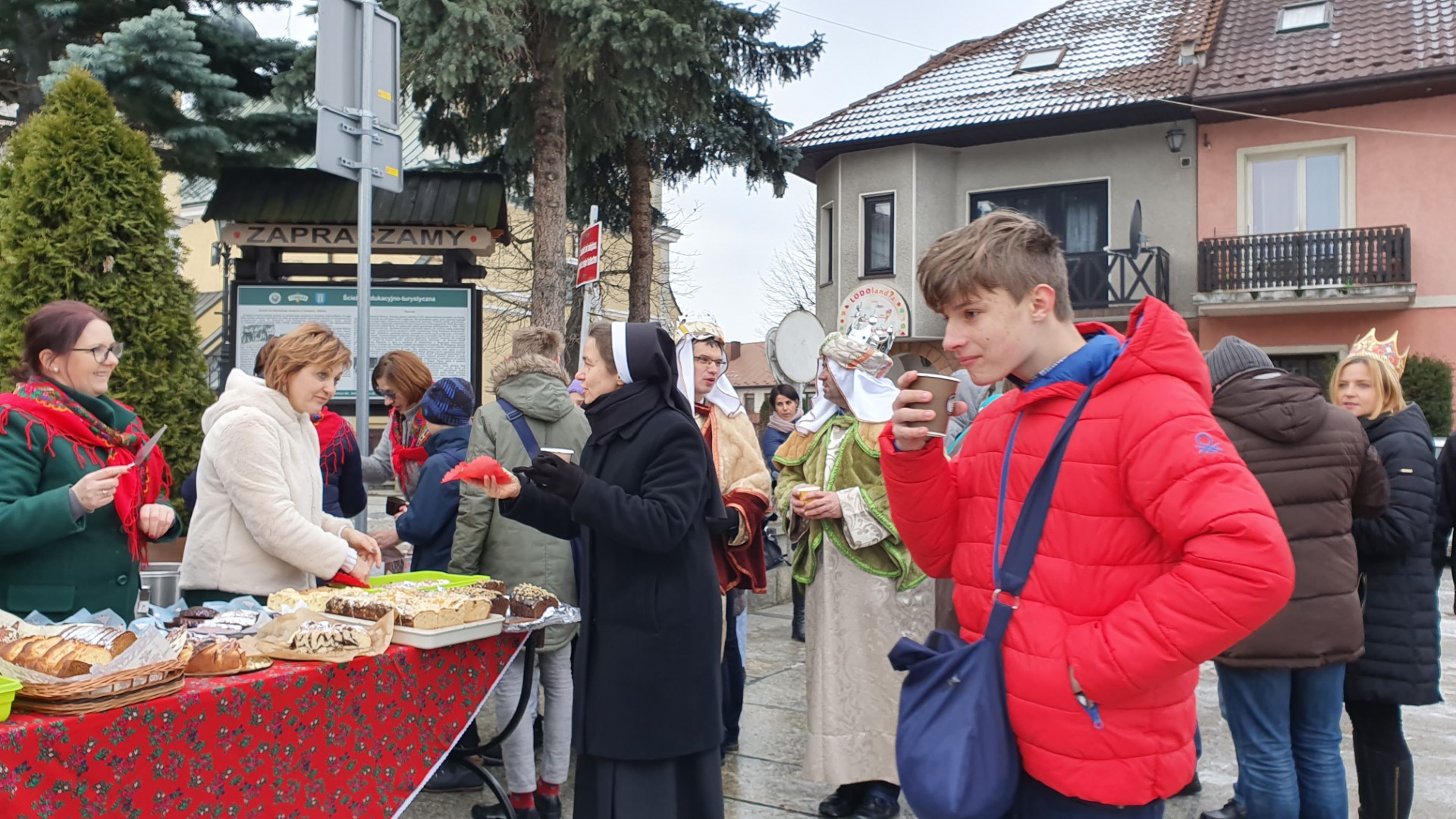 Po zakończeniu Mszy św. na tymbarskim Rynku nastąpiło rozstrzygnięcie konkursu na najpiękniejszy strój kolędnika misyjnego, a Panie z KGW Tymbark przyjęły wszystkich poczęstunkiem  w formie gorącej czekolady oraz  pysznego ciasta.