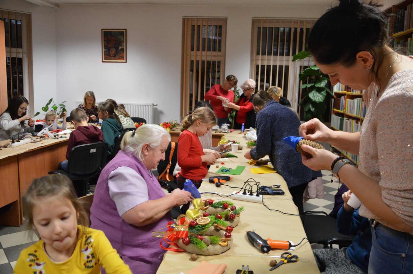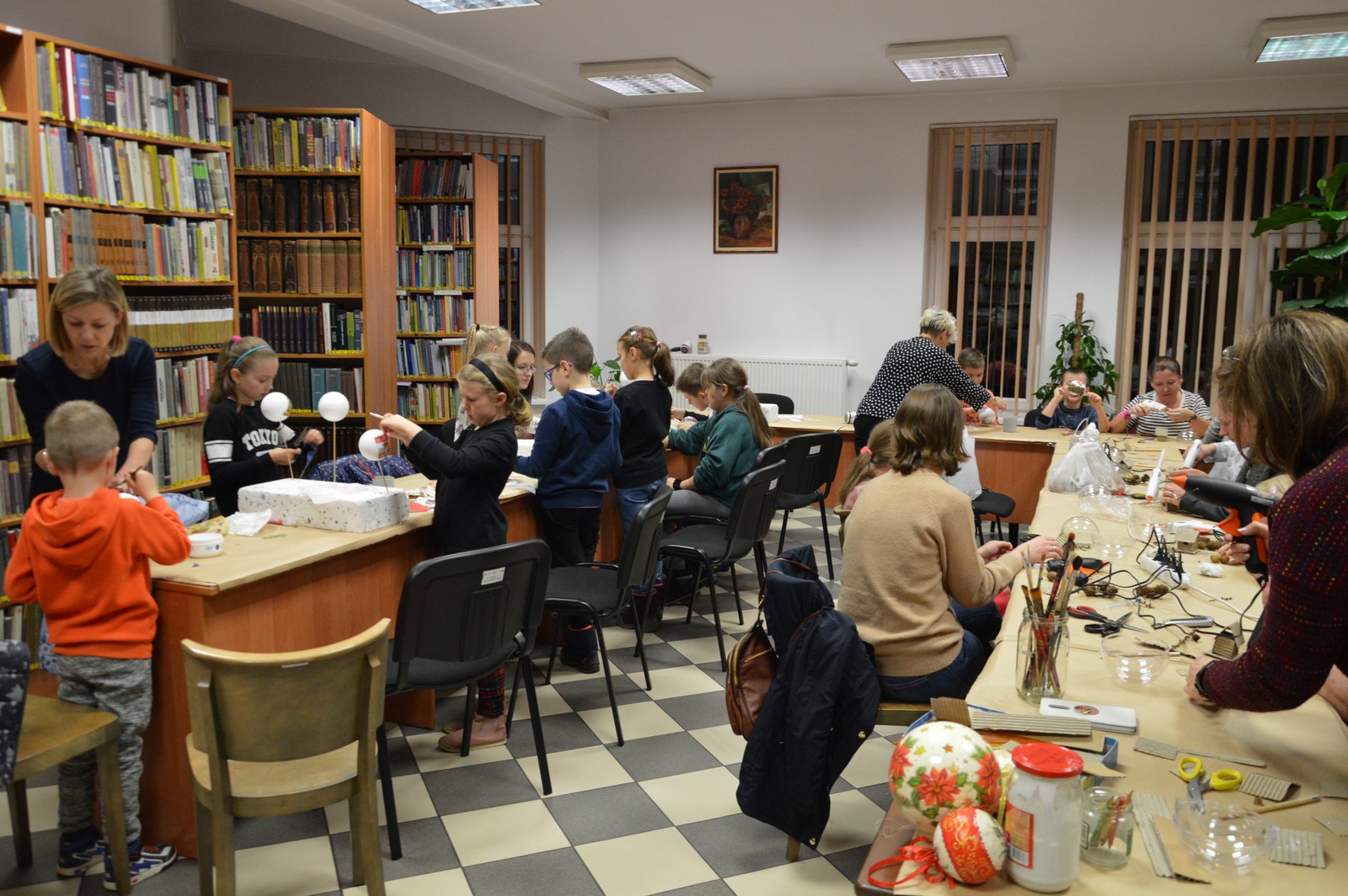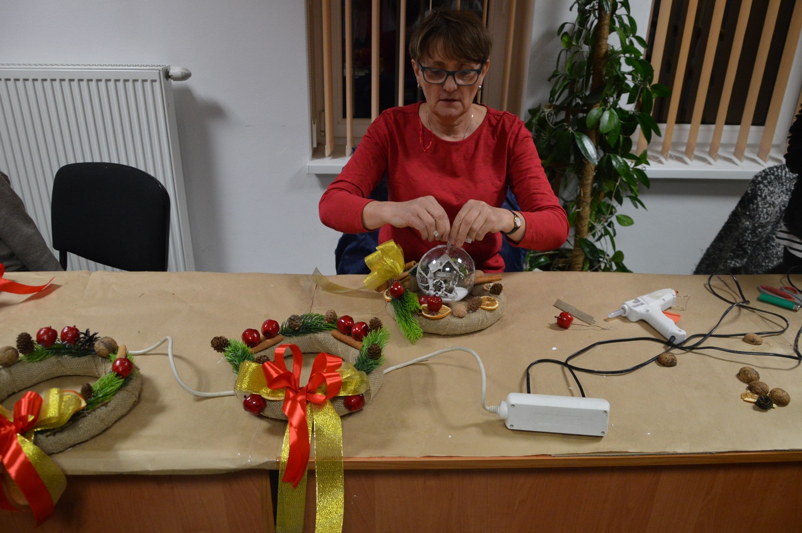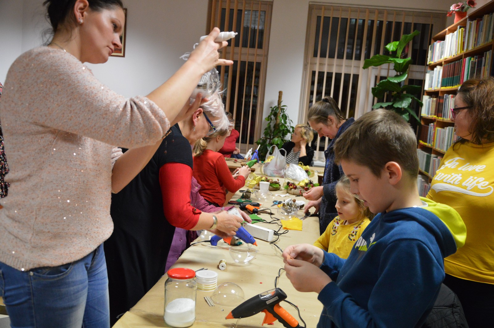 Warsztaty nawiązywały do rodzinnych tradycji wspólnego przygotowywania ozdób choinkowych i dekoracji świątecznych. Uczestnicy pod okiem plastyczki Wiesławy Frączek, samodzielnie tworzyli oryginalne: bombki wykonane techniką decoupage, miniaturowe zimowe domki zamknięte w szklanych bańkach, wianki świąteczne na drzwi, błyszczące gwiazdy, filcowe skrzaty oraz aniołki z makaronu. Powstałe na zajęciach dekoracje świąteczne można było zabrać do domu, by poczuć świąteczny klimat.