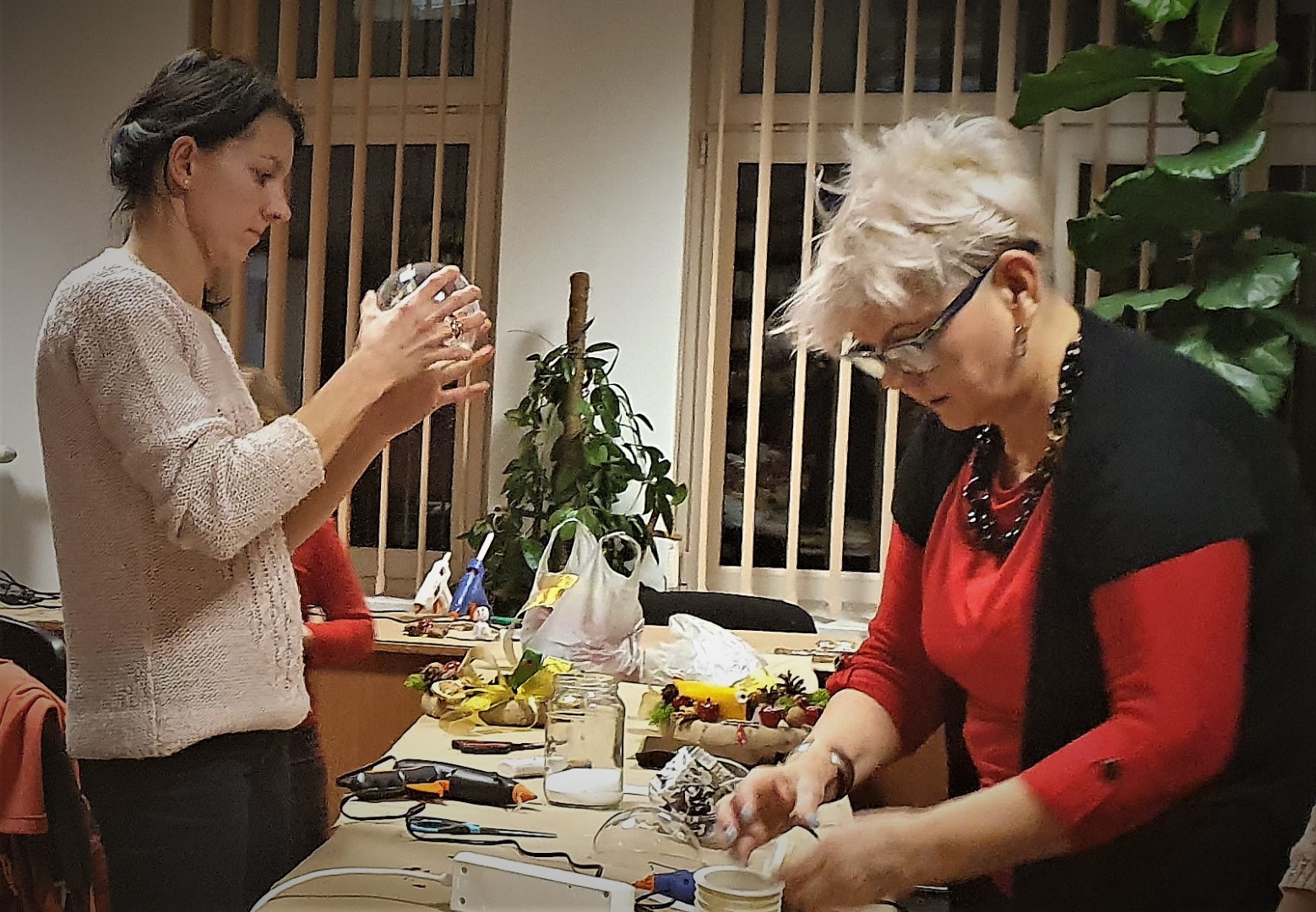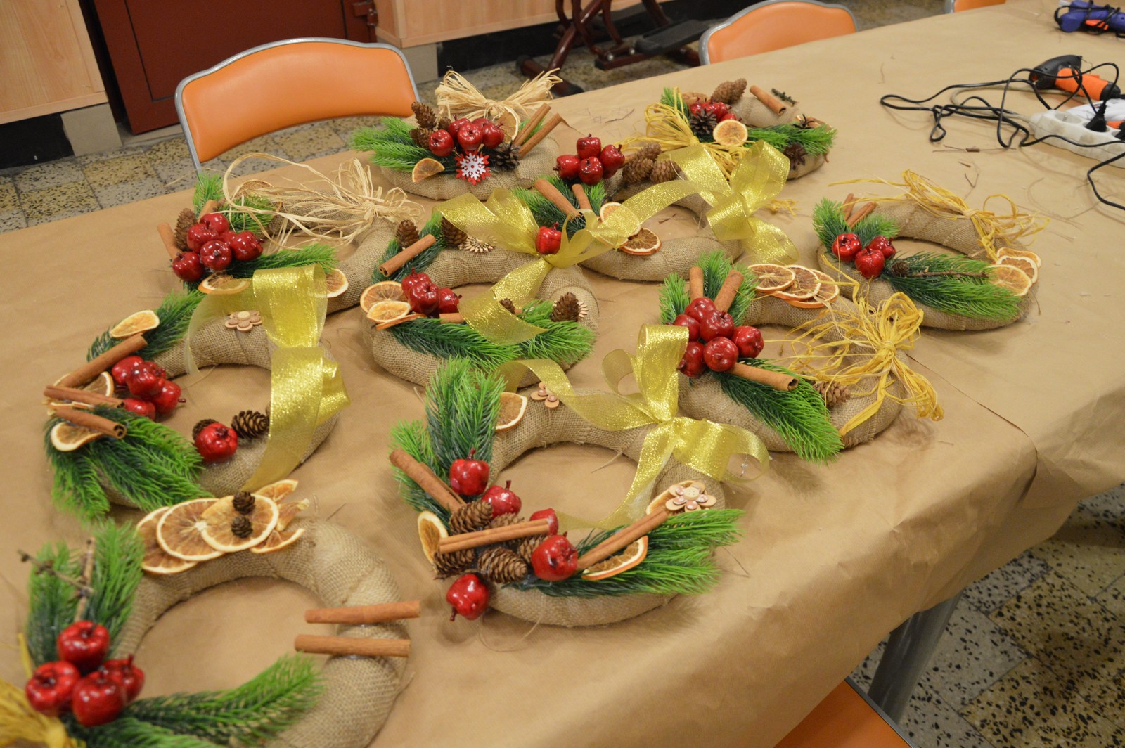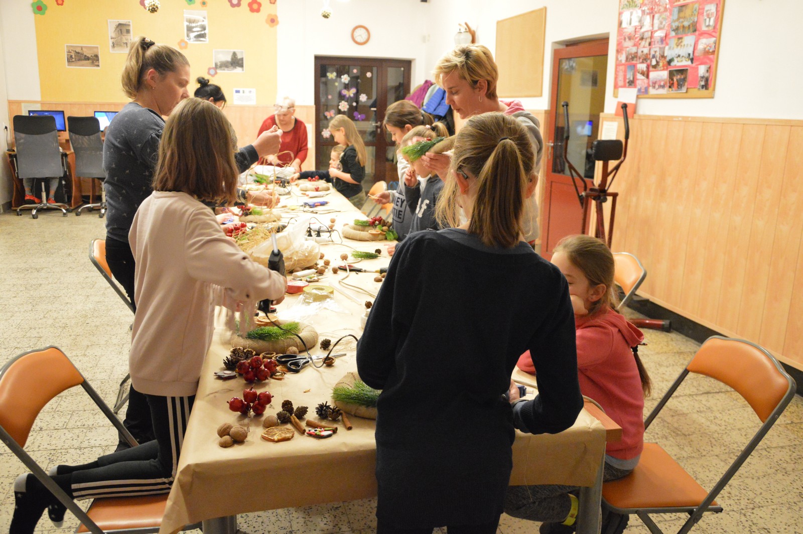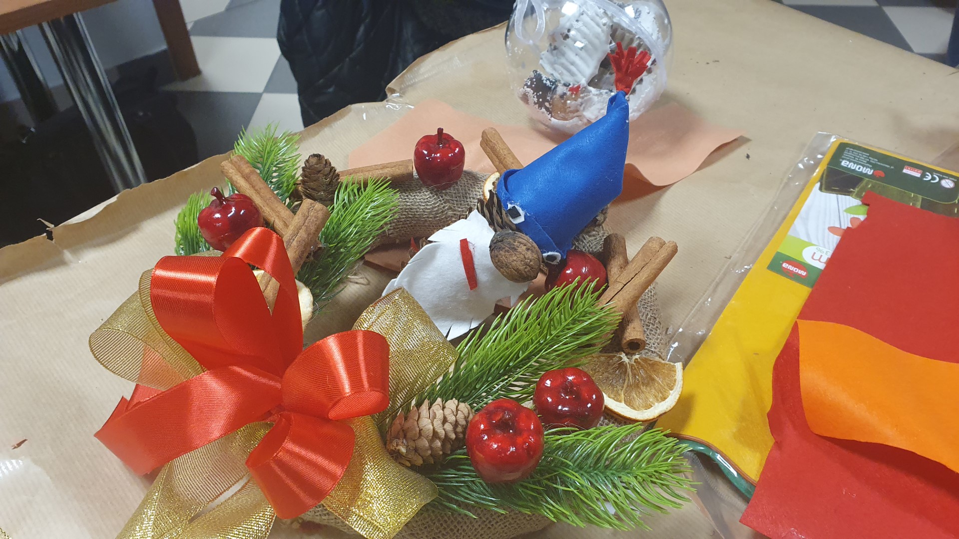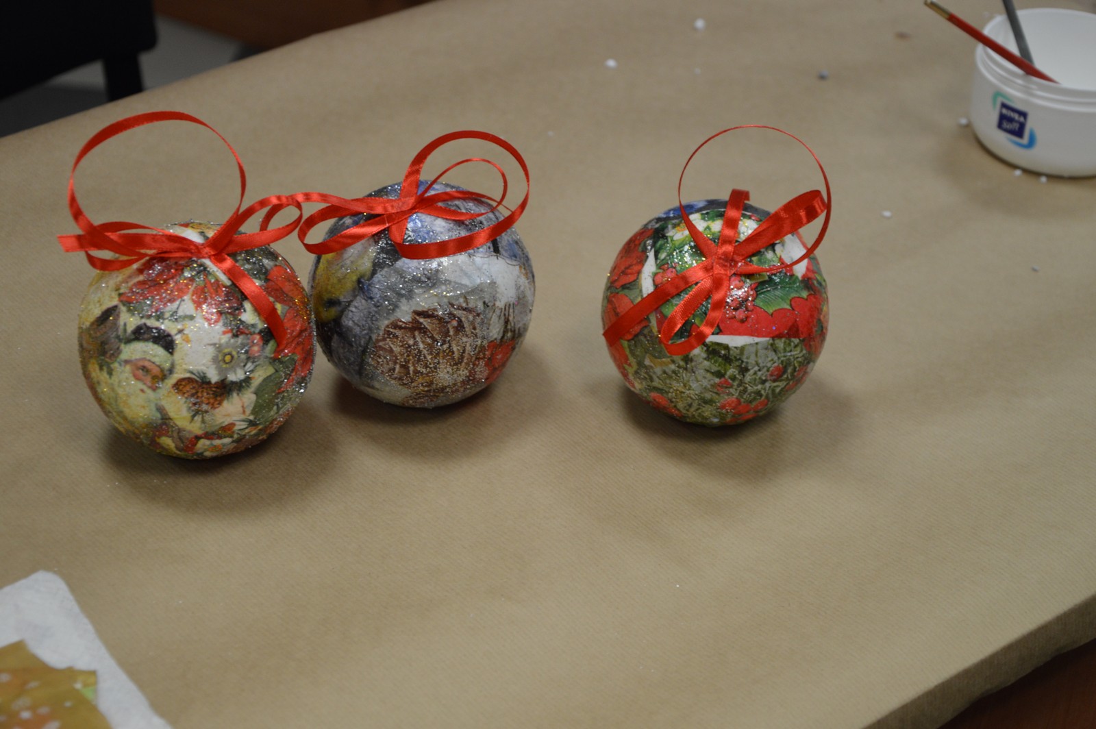 Warsztaty nawiązywały do rodzinnych tradycji wspólnego przygotowywania ozdób choinkowych i dekoracji świątecznych. Uczestnicy pod okiem plastyczki Wiesławy Frączek, samodzielnie tworzyli oryginalne: bombki wykonane techniką decoupage, miniaturowe zimowe domki zamknięte w szklanych bańkach, wianki świąteczne na drzwi, błyszczące gwiazdy, filcowe skrzaty oraz aniołki z makaronu. Powstałe na zajęciach dekoracje świąteczne można było zabrać do domu, by poczuć świąteczny klimat.