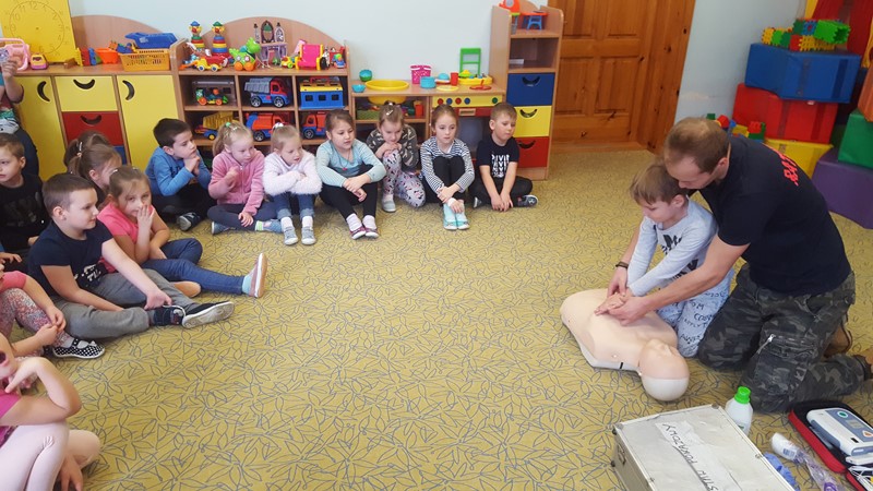 W przedszkolu w  Rabie Niżnej drużynowi ZS Paweł Mamala i Kacper Gromala, ratownicy KPP z Jednostki Strzeleckiej nr 2007 im. kpt. Tadeusza Paolone ZS „ Strzelec „ OSW w Tymbarku oraz  Aleksandra Szczypka również  ratownik KPP przeprowadzili dla dzieci szkolenie z zakresu udzielania pierwszej pomocy przedmedycznej oraz pokaz broni i umundurowania będącego na wyposażeniu Strzelców. Pokaz cieszył się dużym zainteresowaniem wśród przedszkolaków.
