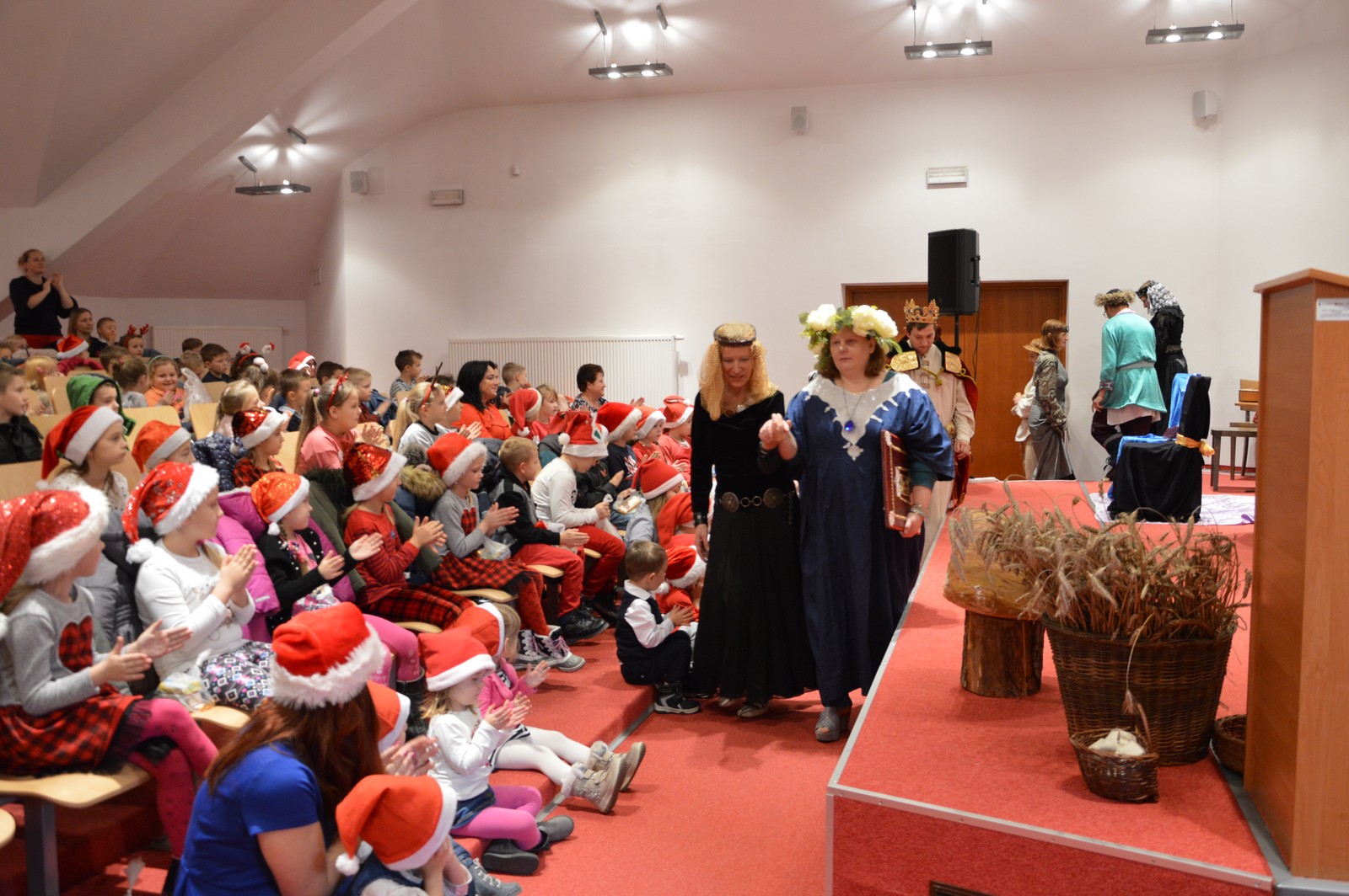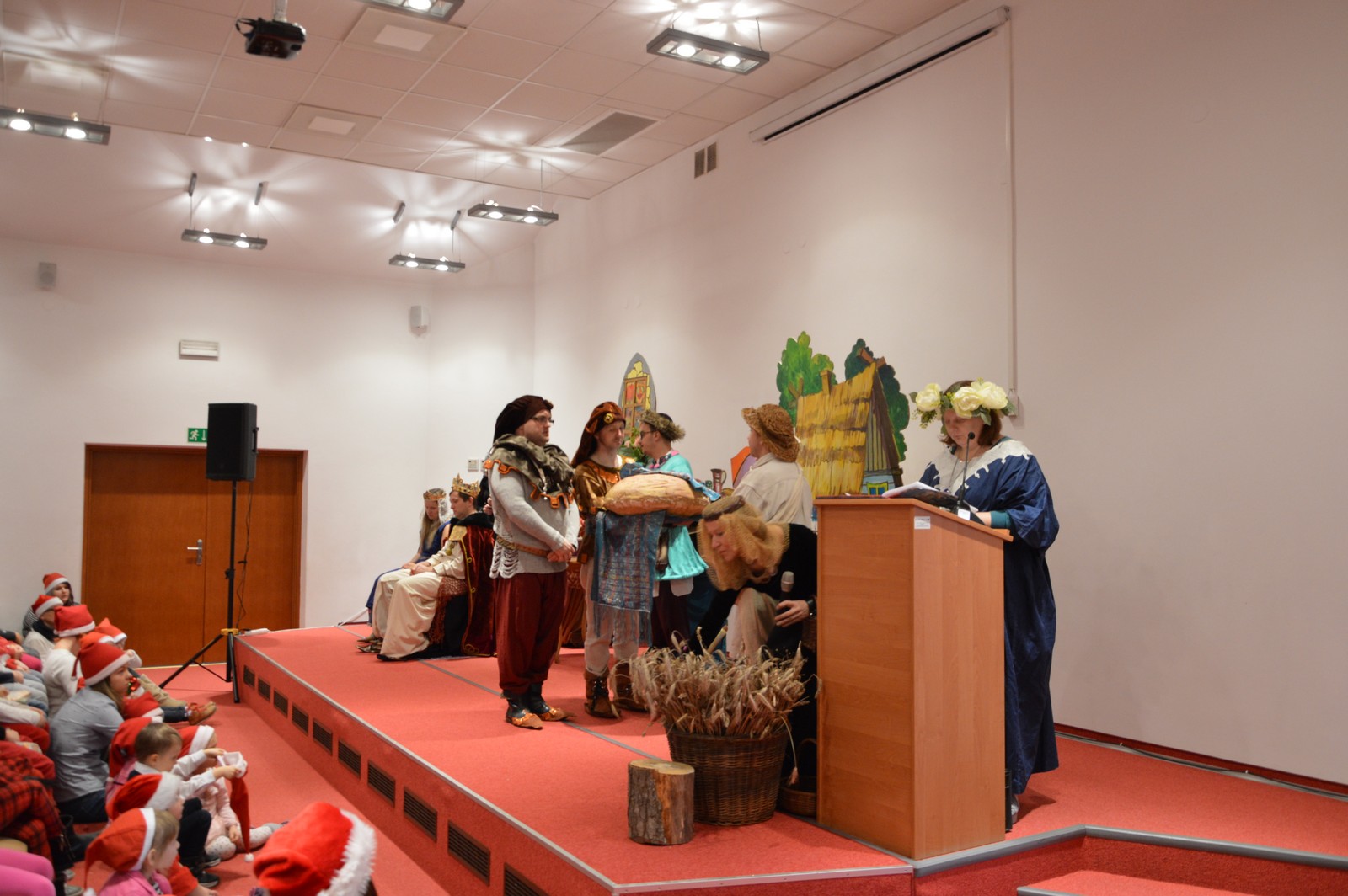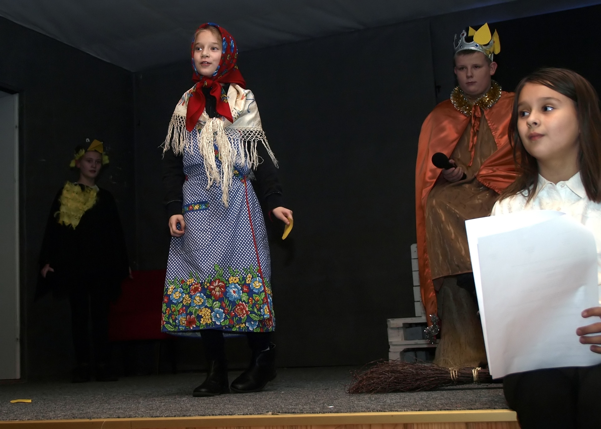 W oczekiwania u na przybycie wyjątkowego gościa dzieci obejrzały przedstawienie pt. Piętka Króla Kazimierza w wykonaniu niepełnosprawnych aktorów z Warsztatu Terapii Zajęciowej w Tymbarku. Legenda opowiada o królu Kazimierzu, który w stroju żebraka przemierzył cały kraj, by przekonać się, jakich ma poddanych. Spektakl dostarczył wielu wzruszeń, a jego przesłaniem są słowa: dobro zawsze powraca. Przepiękne kostiumy i scenografia dopełniły całości. Dzieci z ogromna uwagą i zainteresowaniem obejrzały przedstawienie, o czym świadczyła cisza na sali oraz mocne brawa po jego zakończeniu.