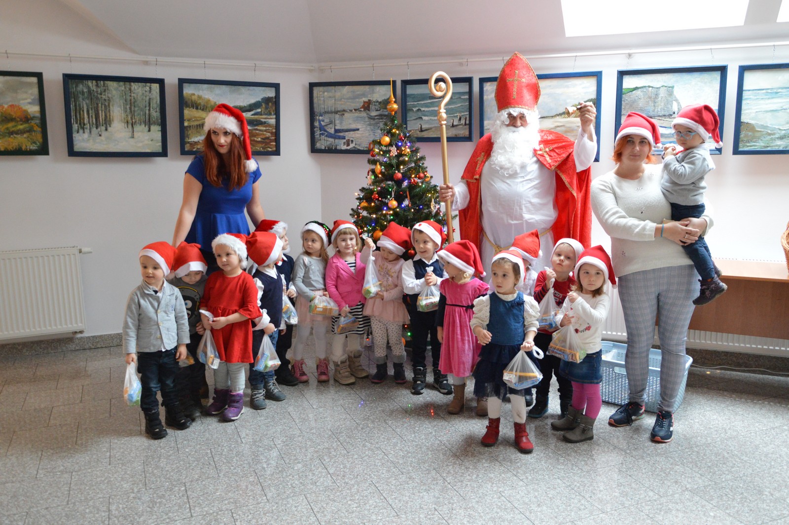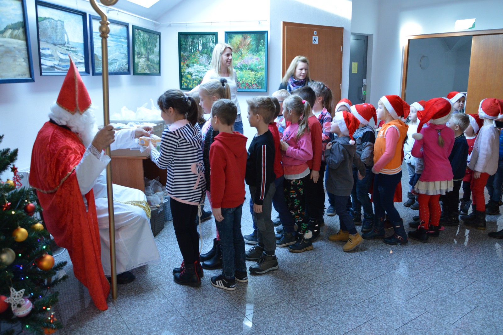 Kolejnym elementem spotkania była wizyta św. Mikołaja. Po powitaniu, dostojny gość usiadł na fotelu i nastąpiła wyczekiwana chwila wręczania wszystkim dzieciom słodkich upominków. Były rozmowy, pytania i wspólne zdjęcia ze św. Mikołajem.