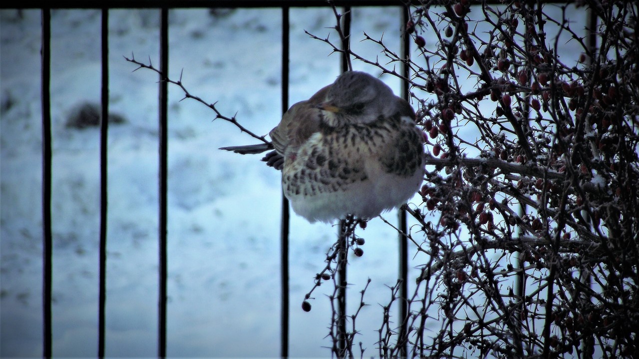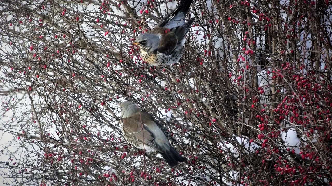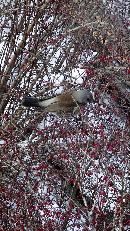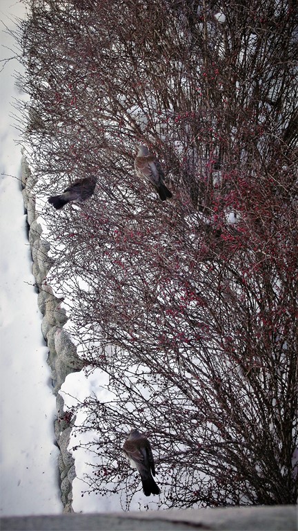 We czwartek, po raz pierwszy w czasie tegorocznej zimy, przyleciały do ogrodowej stołówki i rozpoczęły intensywną konsumpcję zmrożonych (ponad dwudziestostopniowym mrozem) owoców berberysu.