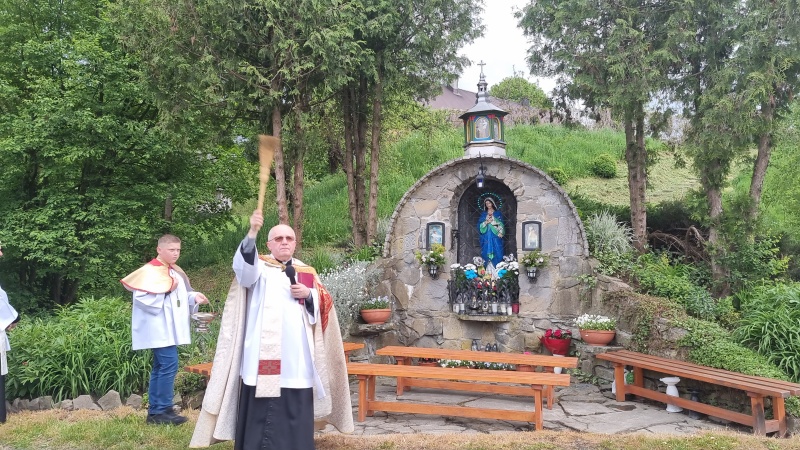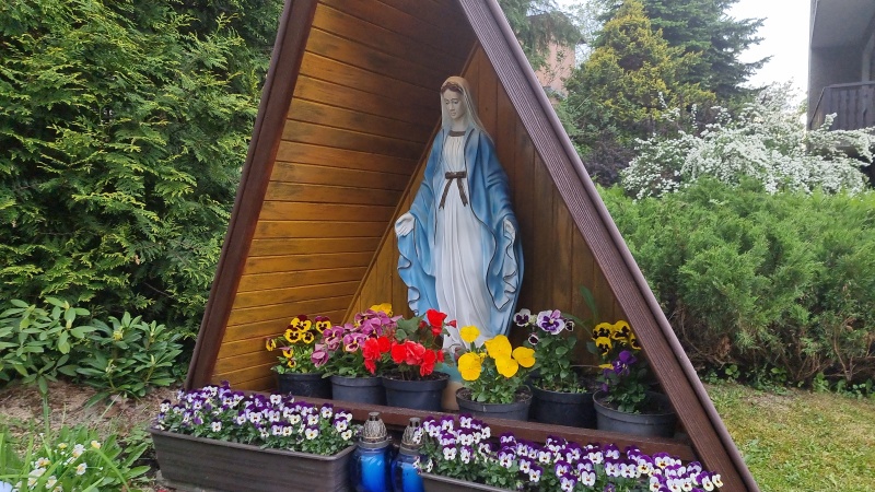 Ale Kostrza to nie tylko rezerwat ze wspaniałą buczyną karpacką, ale też malownicze stawy. Aby do nich dotrzeć, trzeba kierować się od miejsca biwakowego w lewo do kapliczki Św.Huberta. Staw przy drodze jest przedzielony groblą, po której można przejść do stawu numer 2 powyżej, który też jest przedzielony groblą. Są ławeczki, można w ciszy kontemplować piękno otoczenia. Po drugiej stronie stawów pomiędzy dwoma starymi dębami, znajduje się kapliczka Św.Huberta należąca do Koła Łowieckiego „Szarak” z Jodłownika. Na dębach wiszą budki lęgowe dla ptaków. Wszędzie są budki. Obok kapliczki jest pasieka w której tętni życie. Jest pięknie, klimatycznie jak u Mistrza Jana z Czarnolasu przed wiekami… .Wracamy się jeszcze by na prawo od szlaku odwiedzić jeszcze jeden staw.