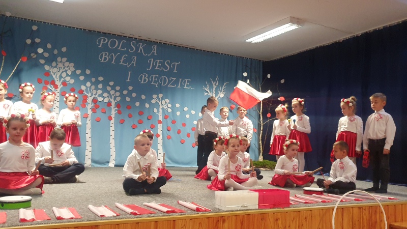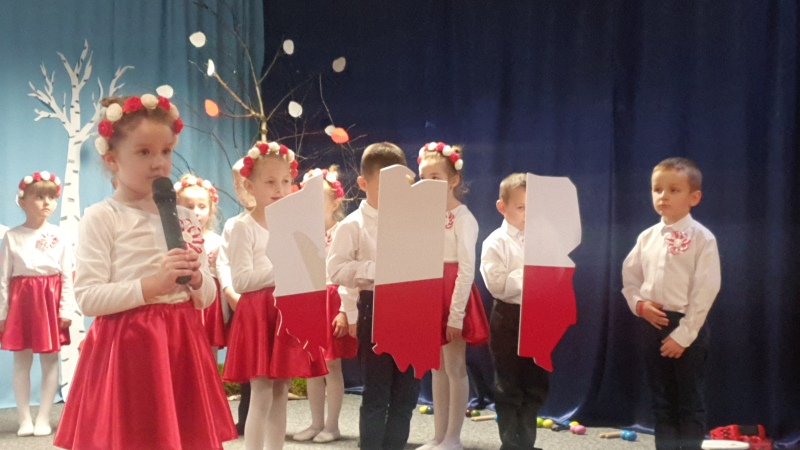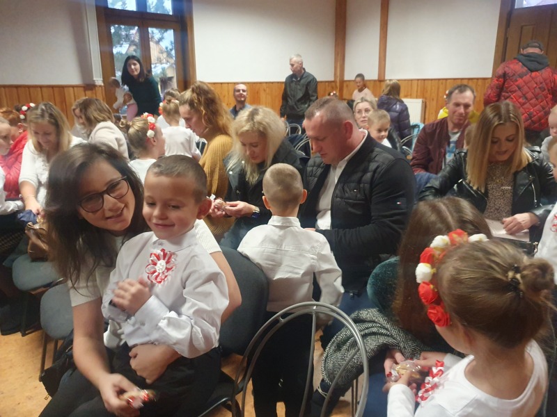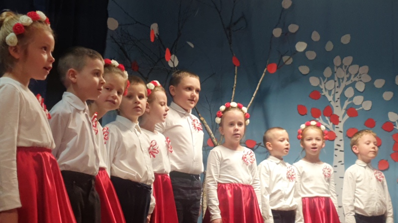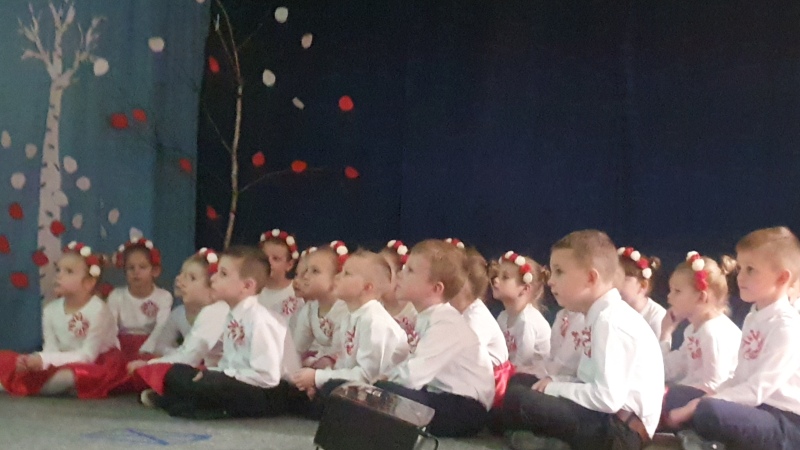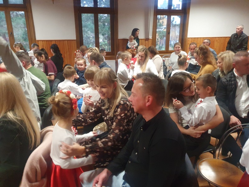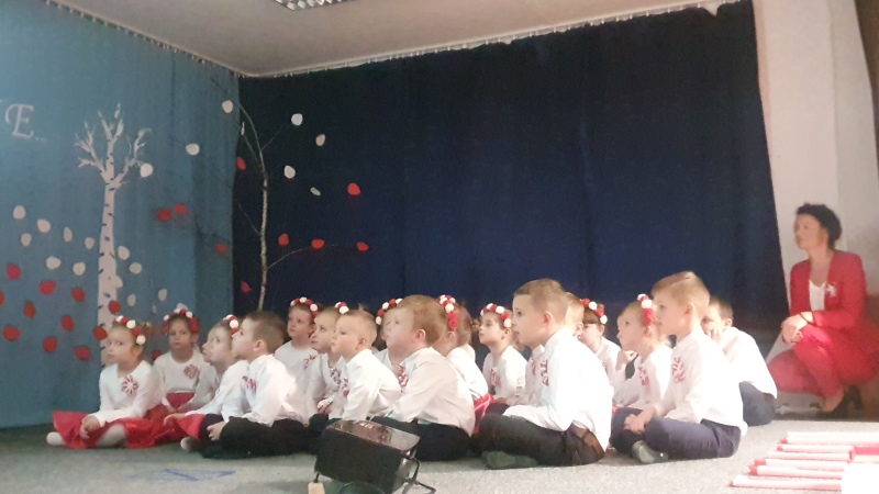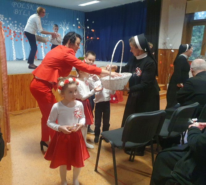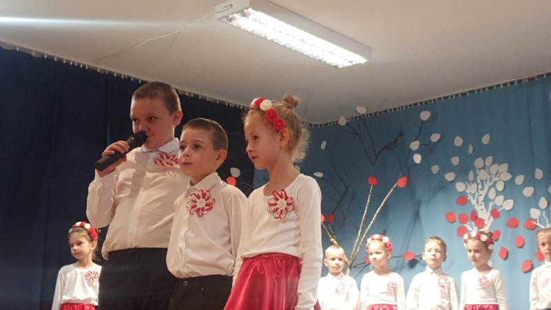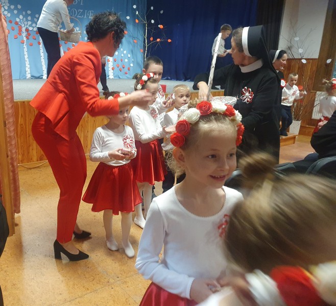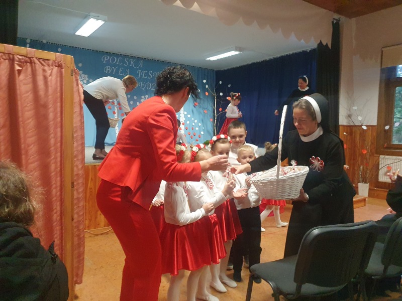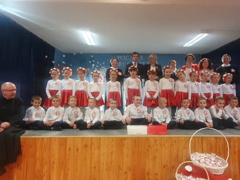 Przedszkolaki z Integracyjnego Przedszkola Parafialnego wraz ze swoimi Paniami (S.Sara Wróbel, P.Ewa Górlińska oraz P.Ania Puchała) zaprosiły swoich rodziców, rodzeństwo, siostry zakonne, Proboszcza Parafii Tymbark ks. dr. Jana Banacha, Wójta Gminy Tymbark dr. Pawła Ptaszka, Siostrę Dyrektor Janinę Bąk oraz przedstawicieli Stowarzyszenia Przystań, na wspaniały, wzruszający, spektakl słowno-muzyczny przygotowany z okazji Święta Niepodległości, rocznicy odzyskania niepodległości przez Polskę.