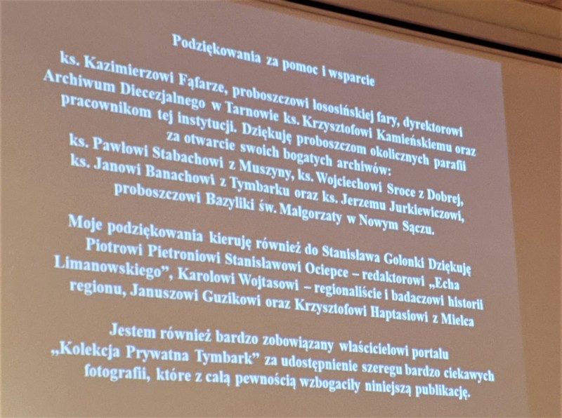 Pan Robert Kowalski przedstawił główne założenia, jakimi kierował się przy opracowaniu książki, aparat badawczy, opisane miejsca, sytuacje, tło historyczne. Szczegółowiej omówił tematy związane z Tymbarkiem, a opisane w książce, tymbarski cmentarz, kapliczka kolejowa. Złożył też podziękowania osobom, które służyły pomocą przy powstawianiu tego opracowania.