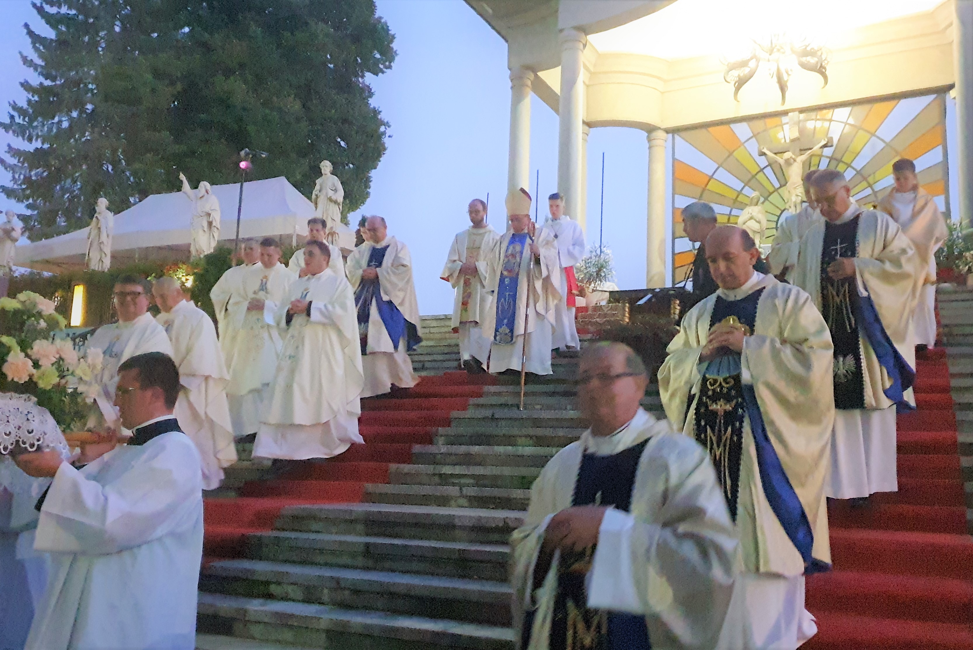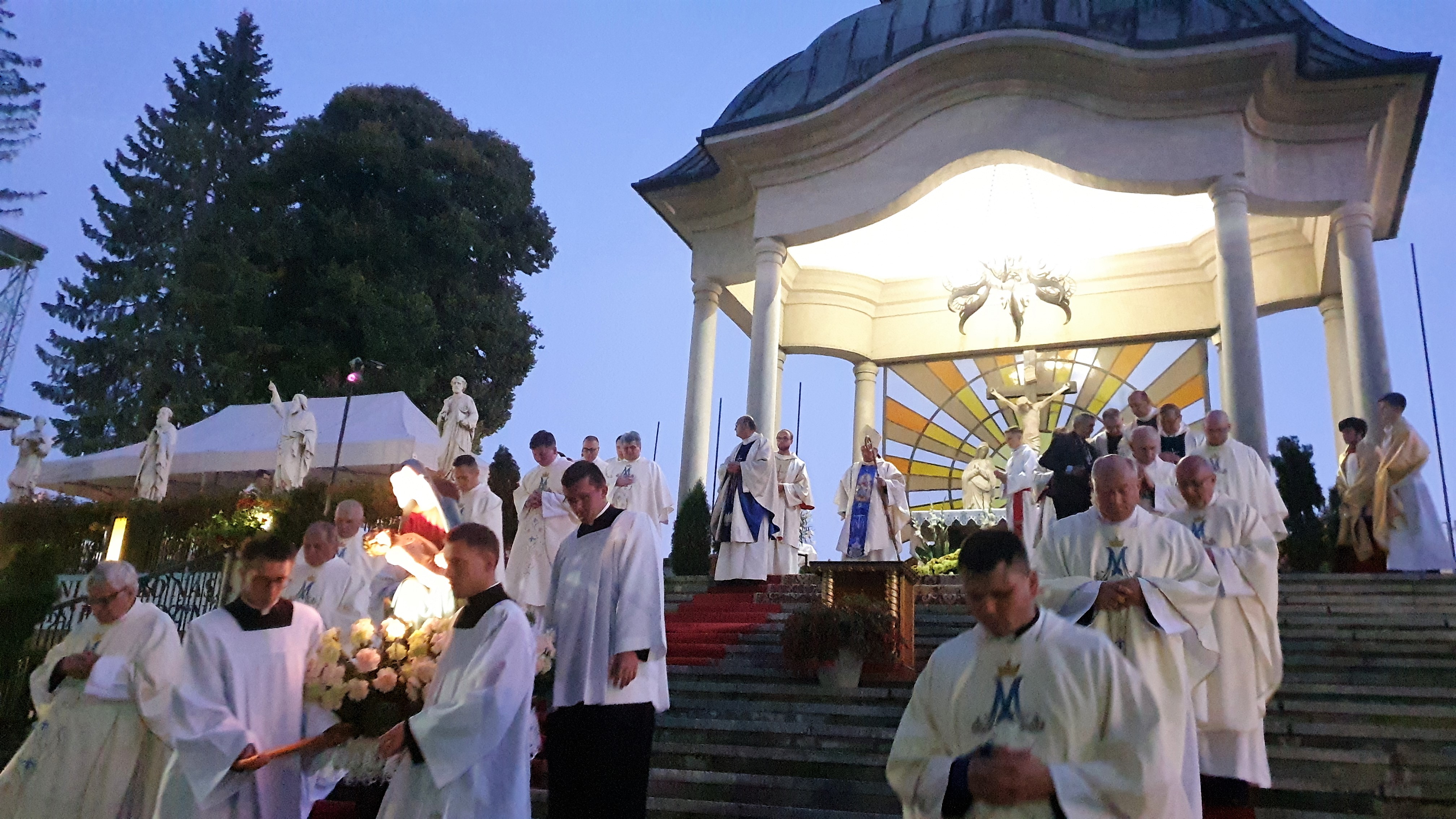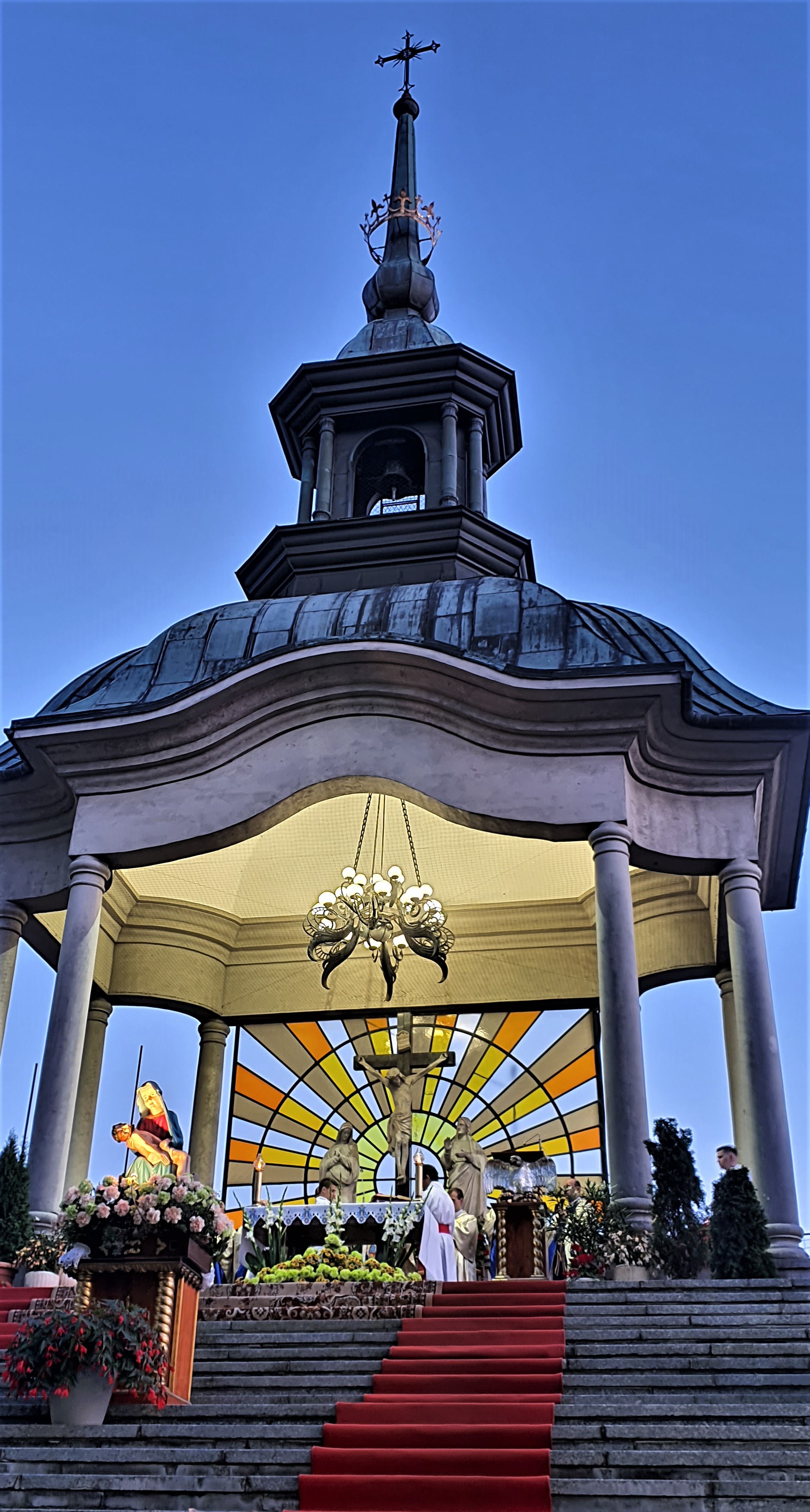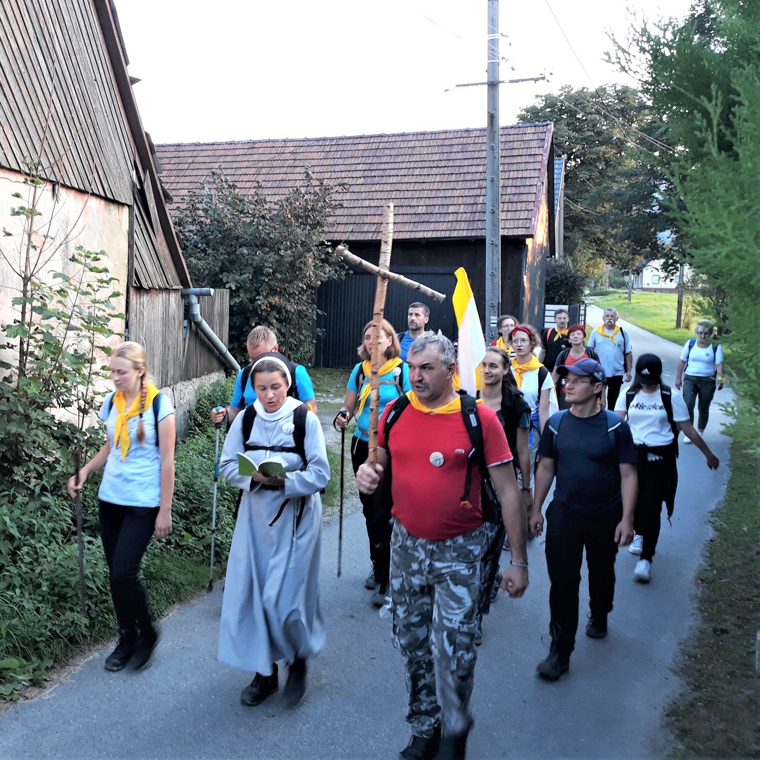 Po modlitwie kończącej różaniec dłuższy odpoczynek na posiłek. Strażacy serwują kiełbaski, kawę i pyszne ciasto , o co zadbał prezes OSP Piekiełko, nawet tuba dała głos skocznymi melodiami. Po tym posiłku i odpoczynku zmęczenie ustąpiło, uśmiech na twarzy się pojawił i radość że przed nami tylko jedna „górka” Łopień (951 m npm). Wspinamy się. Tempo nieco wolniejsze, trud 20 km górami daje znać o sobie. Tradycyjnie na szczycie Łopienia odmawiamy koronkę do Bożego Miłosierdzia. Tu humory dopisują, bo do samego Tymbarku jest z górki. Wchodząc na ul. Kościelną śpiewamy piosenki oazowe i Maryjne. Mieszkańcy tej ulicy z radośnie pozdrawiają nas. Do kościoła docieramy o godz. 18.30. Trwa msza św. na zakończenie, której celebrans – ks.Proboszcz – wita nas i ofiaruje modlitwę dziękując za trud pielgrzymowania.
