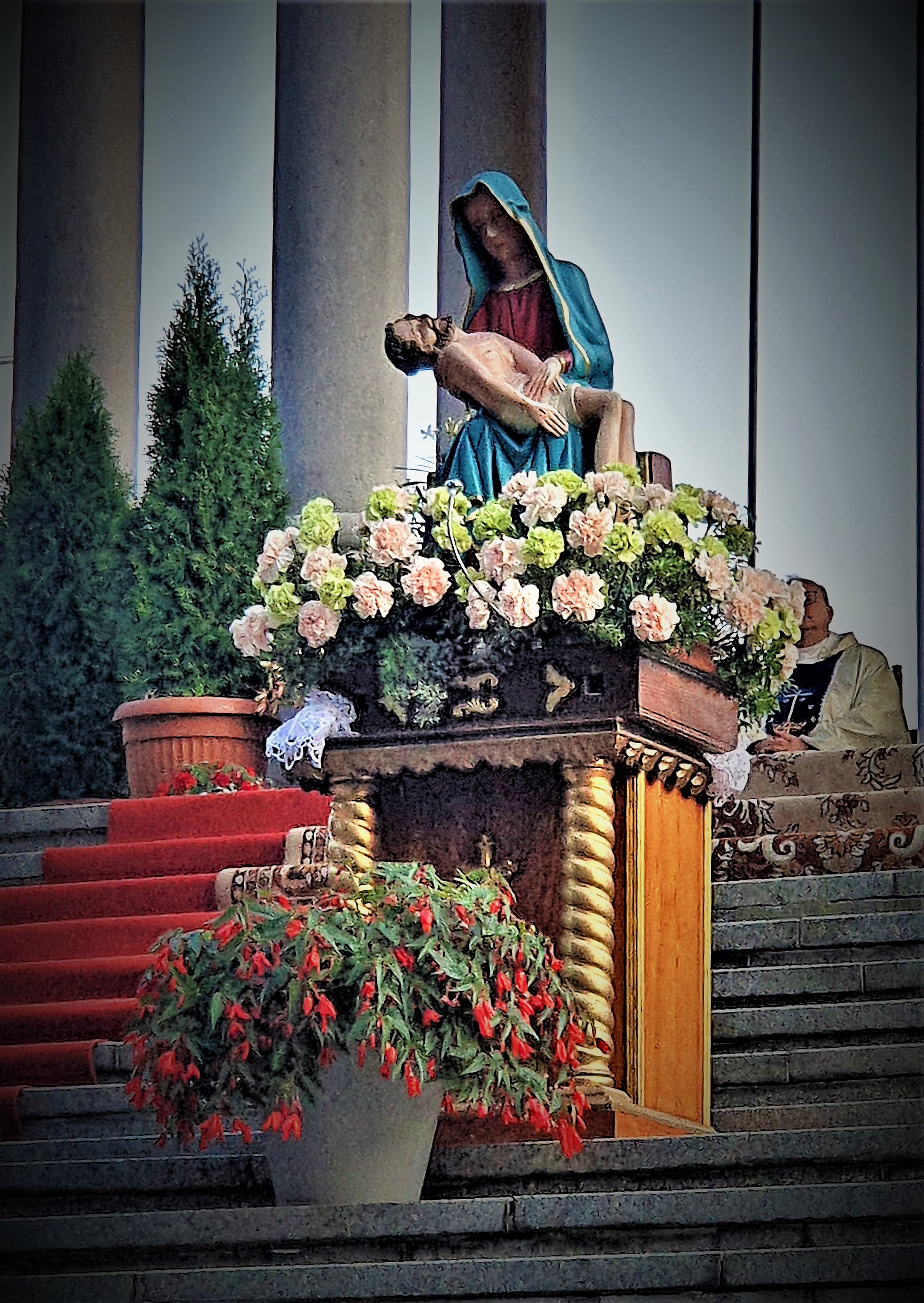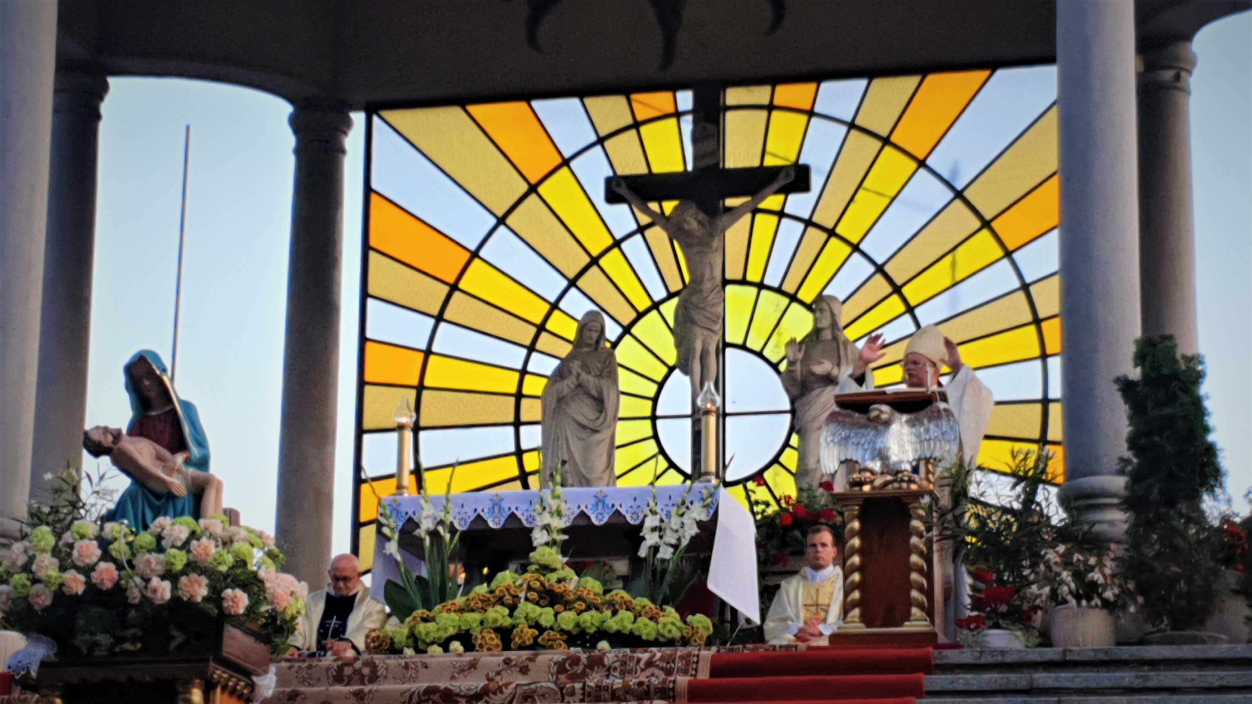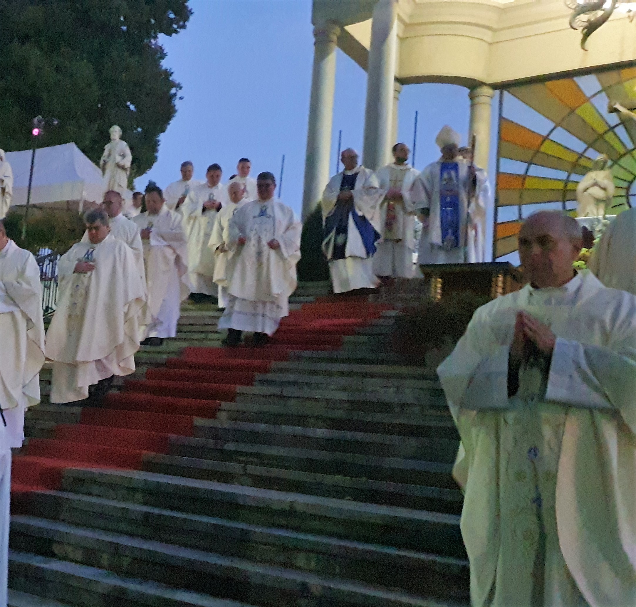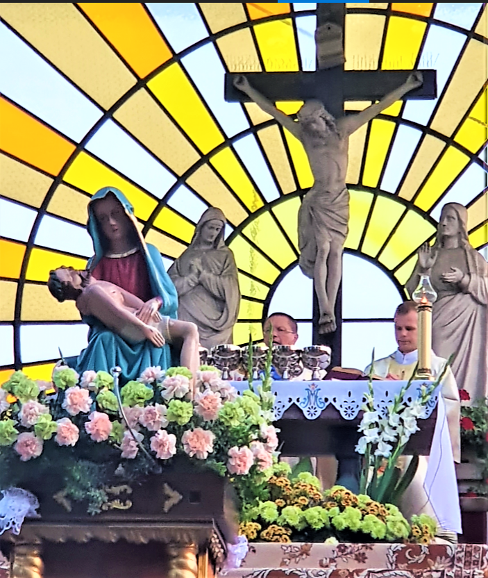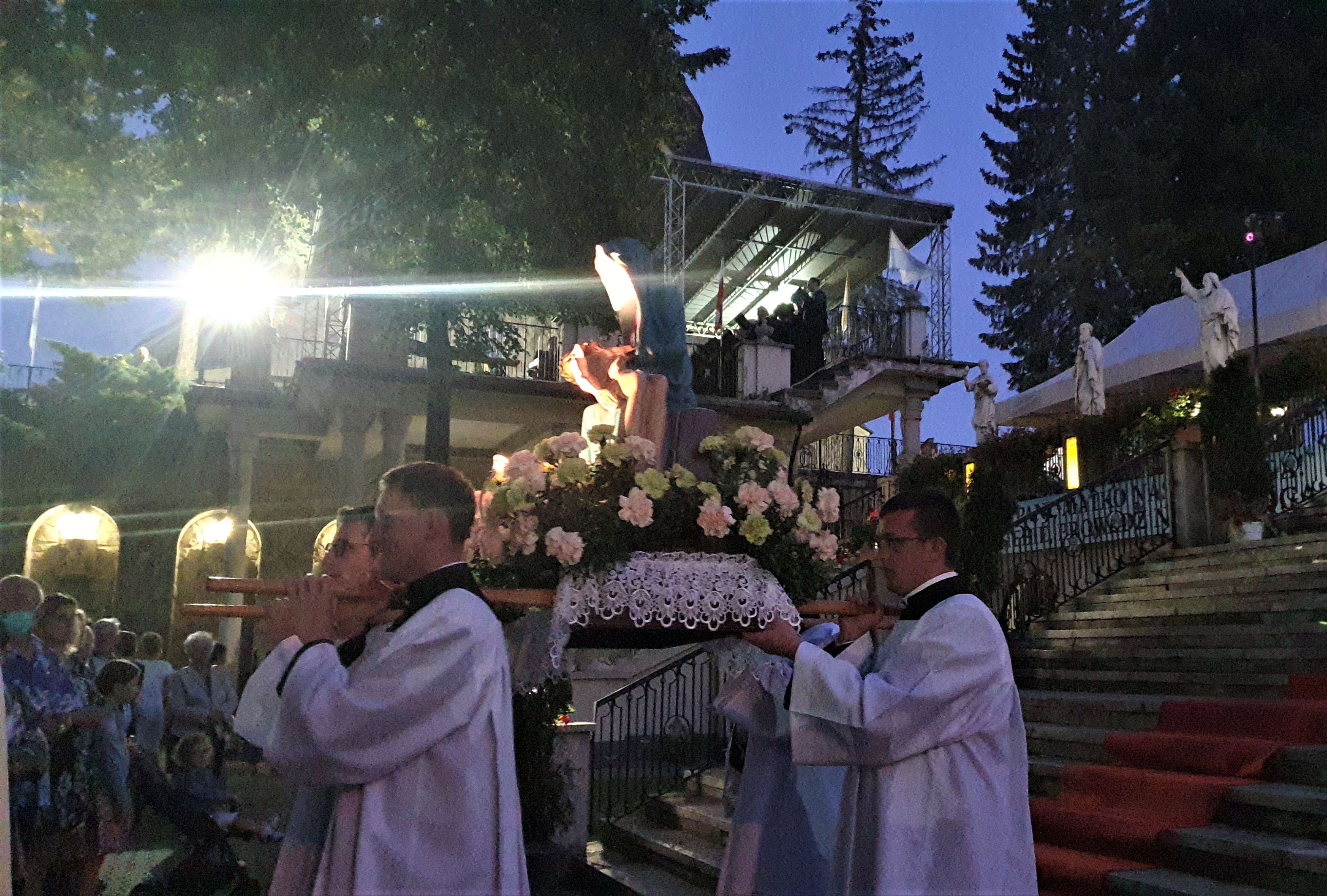 Po modlitwie kończącej różaniec dłuższy odpoczynek na posiłek. Strażacy serwują kiełbaski, kawę i pyszne ciasto , o co zadbał prezes OSP Piekiełko, nawet tuba dała głos skocznymi melodiami. Po tym posiłku i odpoczynku zmęczenie ustąpiło, uśmiech na twarzy się pojawił i radość że przed nami tylko jedna „górka” Łopień (951 m npm). Wspinamy się. Tempo nieco wolniejsze, trud 20 km górami daje znać o sobie. Tradycyjnie na szczycie Łopienia odmawiamy koronkę do Bożego Miłosierdzia. Tu humory dopisują, bo do samego Tymbarku jest z górki. Wchodząc na ul. Kościelną śpiewamy piosenki oazowe i Maryjne. Mieszkańcy tej ulicy z radośnie pozdrawiają nas. Do kościoła docieramy o godz. 18.30. Trwa msza św. na zakończenie, której celebrans – ks.Proboszcz – wita nas i ofiaruje modlitwę dziękując za trud pielgrzymowania.