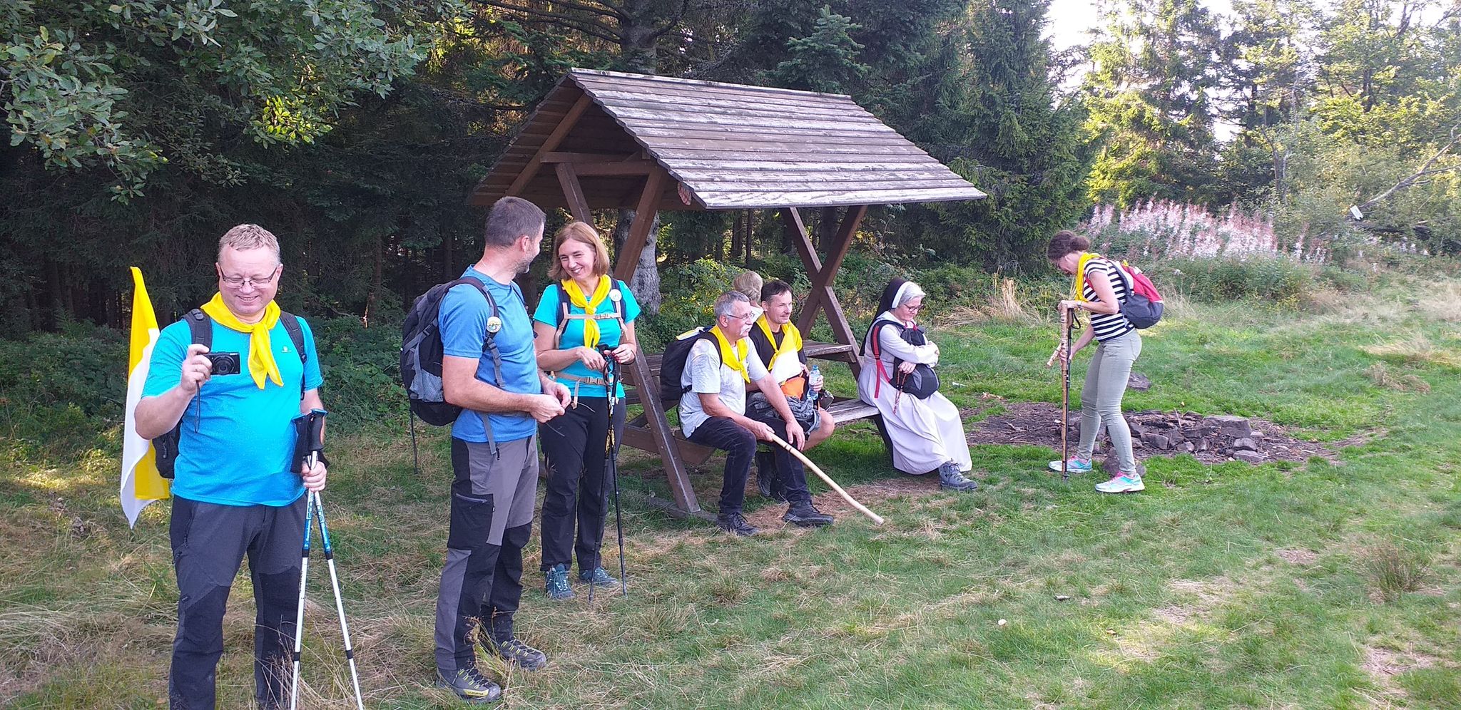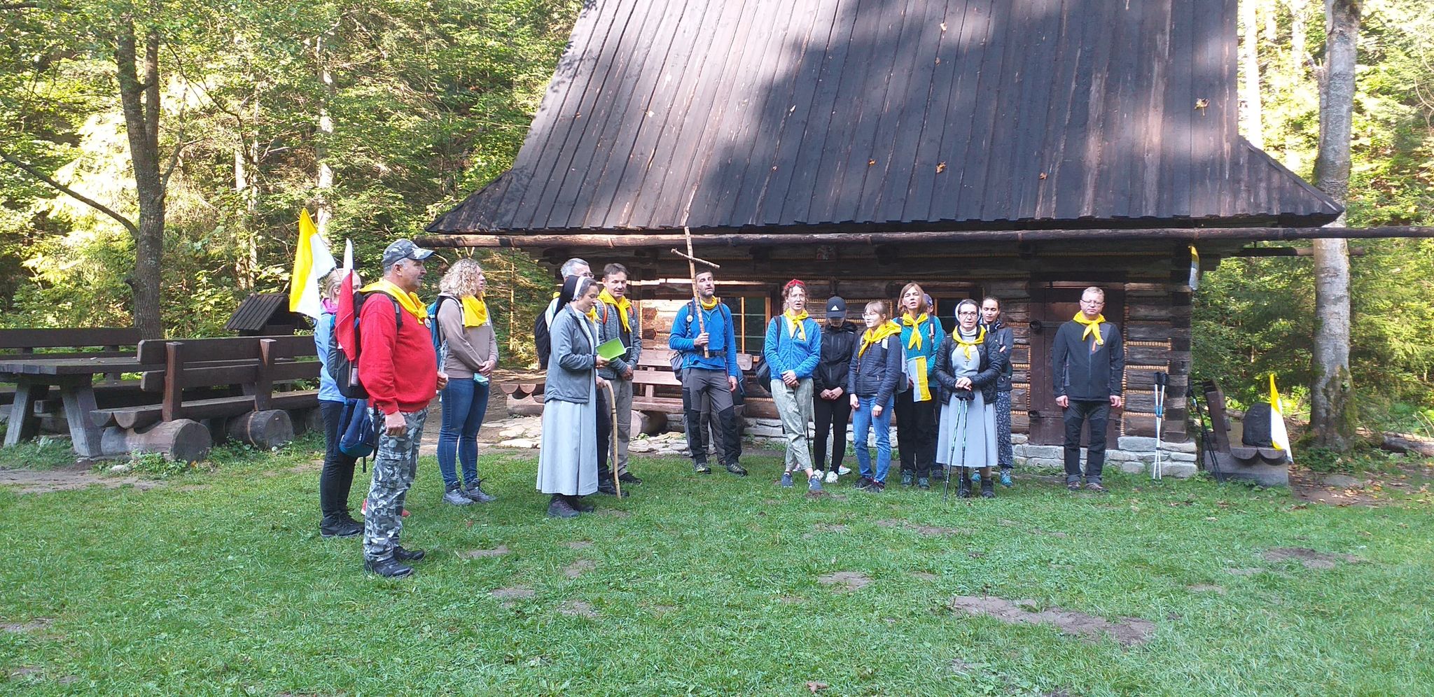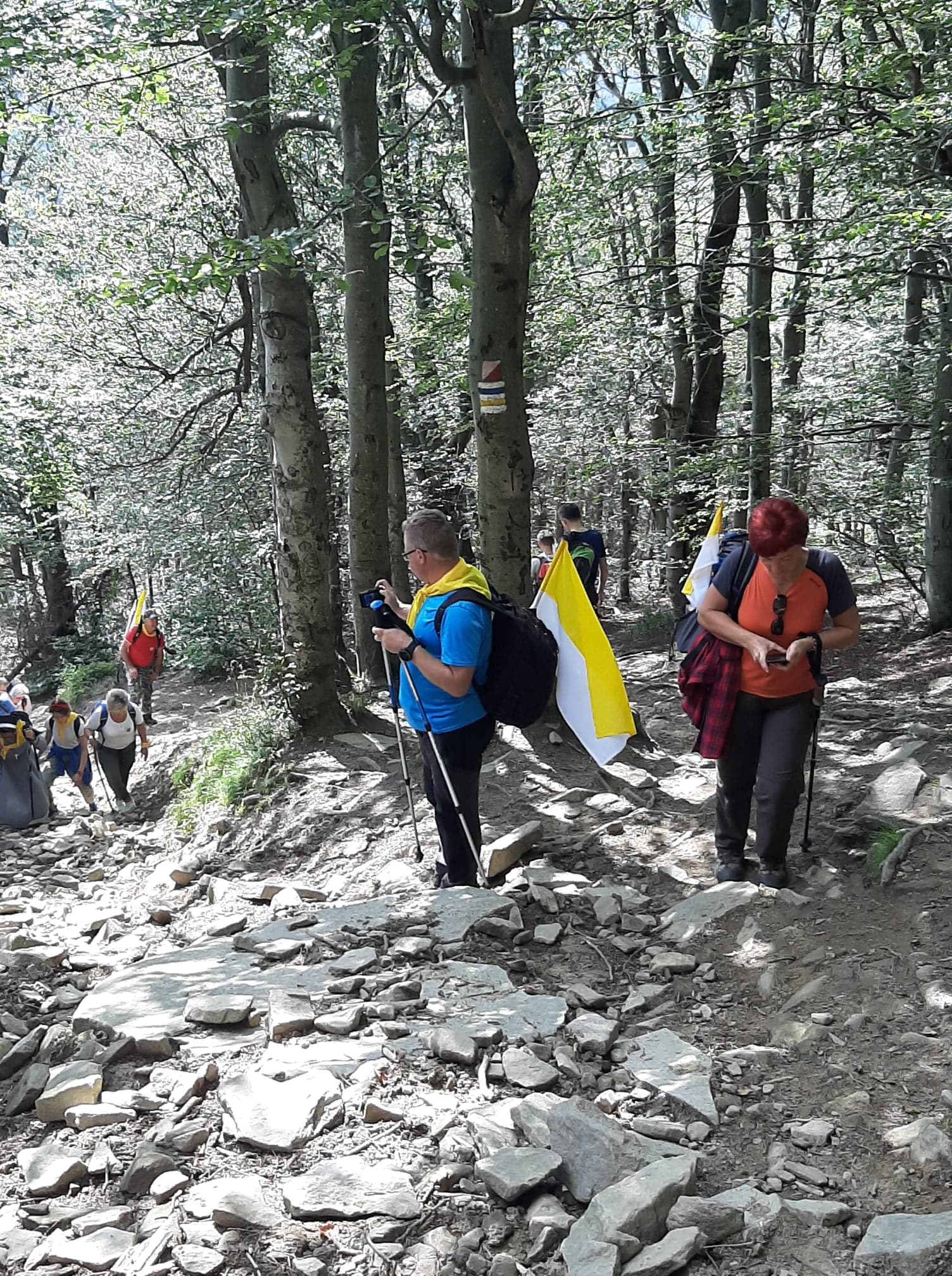 Przy Papieżówce meldujemy się o 9.00. Organizatorzy rozdają maseczki – szaleje wirus zwany COVID 19 – oraz przypinki i okolicznościową kartkę pocztową. Dla tych, którzy idą po raz pierwszy również chusty i flagi w kolorze papieskim. Całkiem fajna kolorowa gromadka. Zapalamy znicz przy pamiątkowym obelisku i śpiewamy ukochaną BARKĘ św. Jana Pawła II. Rozpoczynamy modlitwę różańcową w intencji Ojczyzny, rodzin, parafii i kapłanów, jak również i tych które w sercu przynieśliśmy. O godz. 9.20 ruszamy w góry Beskidu Wyspowego, cel – Tymbark. Pierwsze „wzniesienie” to Jasień, który zdobywamy po godz. 11.00. Nieopodal polana Kutrzyca, na której zatrzymujemy się na dłuższy odpoczynek – to pora na drugie śniadanie. Butelki z wodą szybko zostają opróżnione. Pogoda dopisuje, podziwiamy piękne widoki i stojący w pobliżu jedyny szałas działający w powiecie limanowskim. Po 20 minutach odpoczynku stajemy przy kapliczce Matki Bożej i odmawiamy drugi dziesiątek różańca. Ruszamy dalej. Przed nami królowa Beskidu Mogielica. Teraz jest z górki, aż do przełęczy pod Krzystonowem. Tu skrzyżowania dróg pilnuje Matka Boża usadowiona na betonowym cokole. Zatrzymujemy się i odmawiamy trzeci dziesiątek różańca. Chwila wytchnienia. Przed nami podejście na Polanę Stumorgową i strome podejście na Mogielicę. Chwilowy odpoczynek na wyrównanie oddechu i łyk wody. Zmęczenie pokazuje co potrafi, mimo wszystko przed 13.00 zdobywamy szczyt. W tym miejscu słowa JP II mają szczególny wymiar