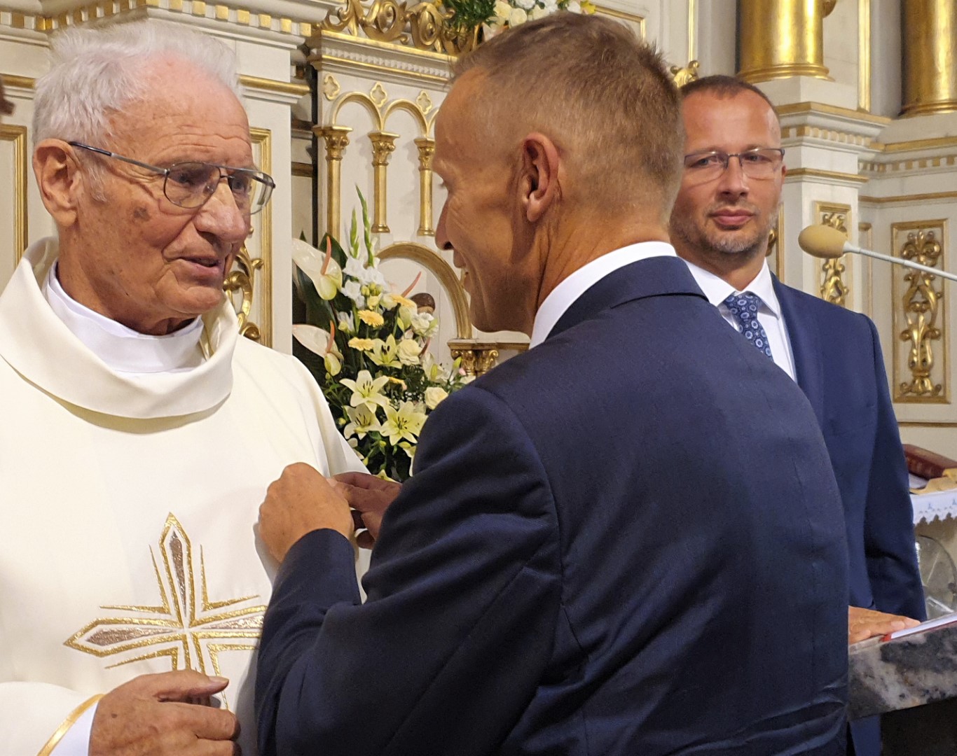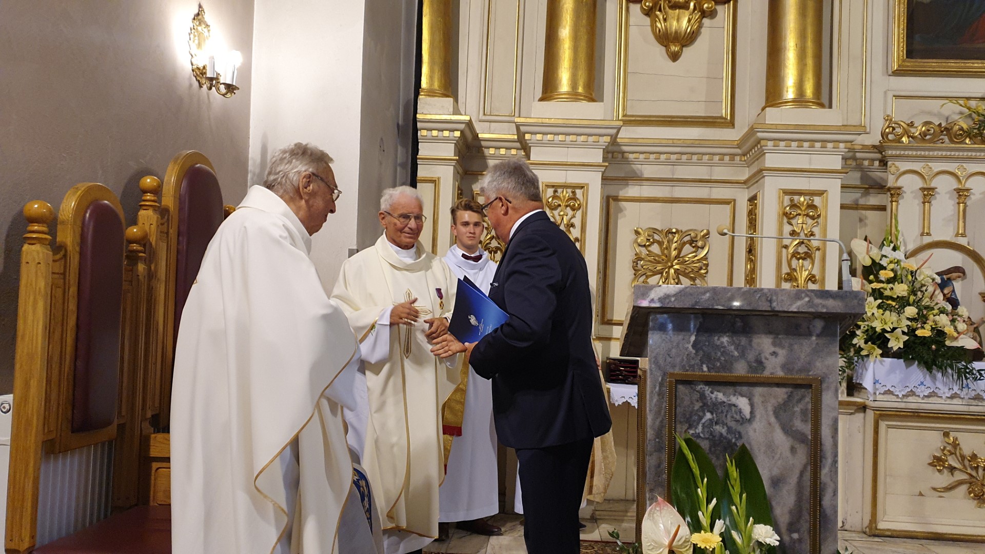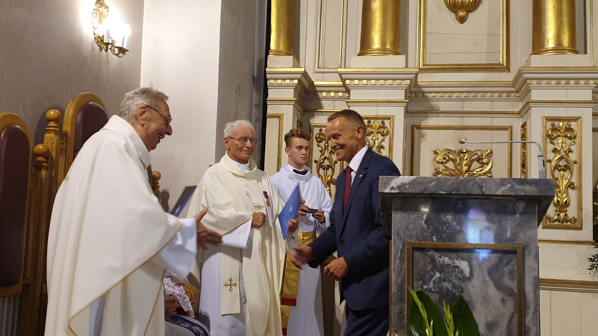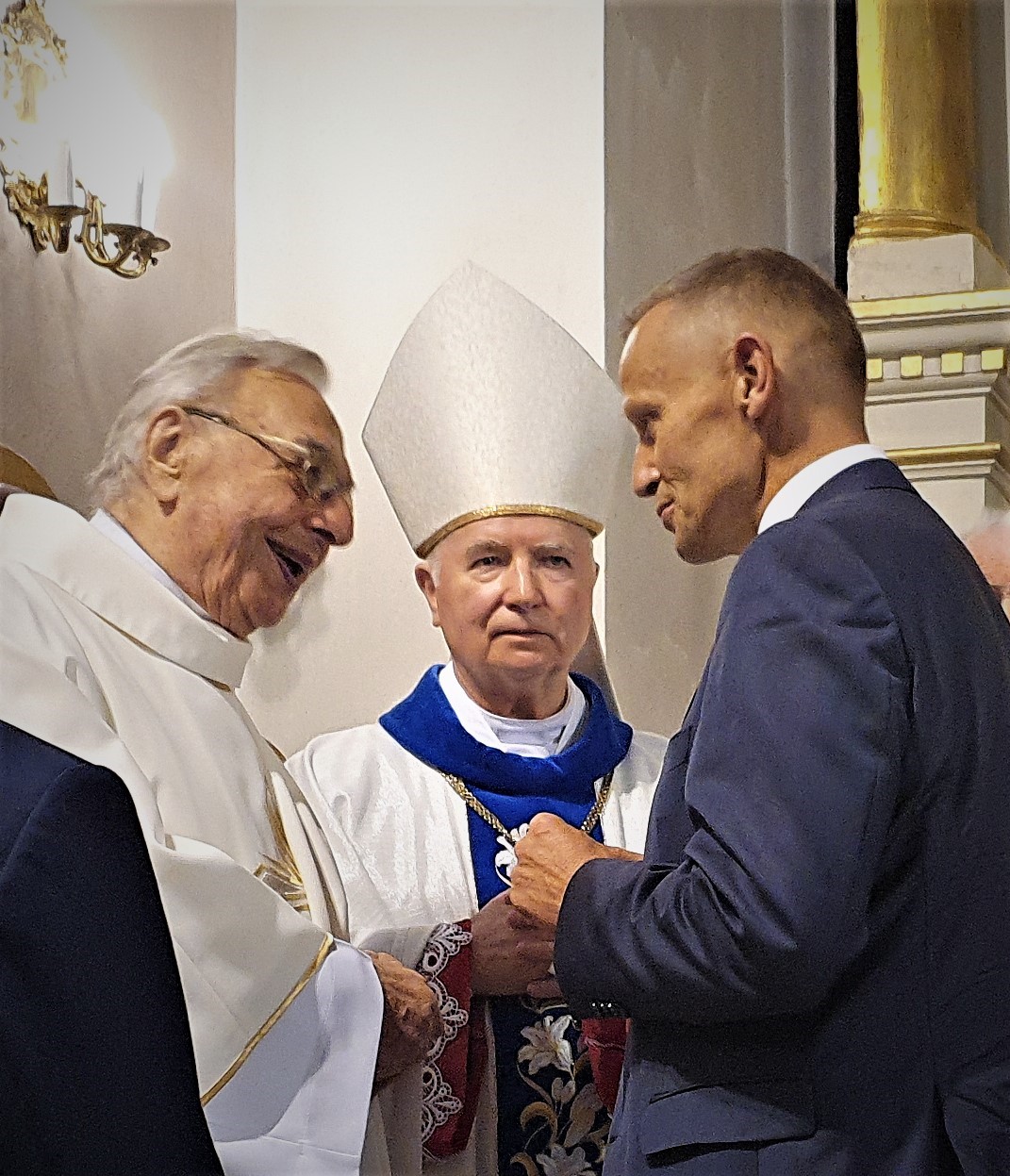 Drodzy, czcigodni kapłani. Księże Prałacie Józefie, Księże Kanoniku Franciszku. To refleksja ks. Jana Twardowskiego przedstawiająca we właściwy Mu humorystyczny sposób, takie zwykłe, ludzkie spojrzenie na postać kapłana. Ale dzisiaj w tym uroczystym momencie, gdy podczas parafialnego odpustu jesteśmy uczestnikami odznaczenia Was Złotymi Krzyżami Zasługi przyznanymi przez Pana Prezydenta Andrzeja Dudę, uświadamiamy sobie przede wszystkim duchową wartość kapłaństwa, ale również jego znaczenie dla Państwa i Obywateli. Święty Jan Paweł II zwracając się do kapłanów 11 stycznia 1981 r. w Rzymie powiedział: „Kapłaństwo to urząd, to posługa, to pośrednictwo między Bogiem a ludźmi. Kapłaństwo jest dla Kościoła, dla wspólnoty, dla braci, dla świata ! Kapłaństwo jest apostolskie. Kapłaństwo jest misyjne. Kapłaństwo jest wykonywaniem pośrednictwa. Kapłaństwo jest ze swej istoty społeczne. Kapłaństwo jest Miłością.”