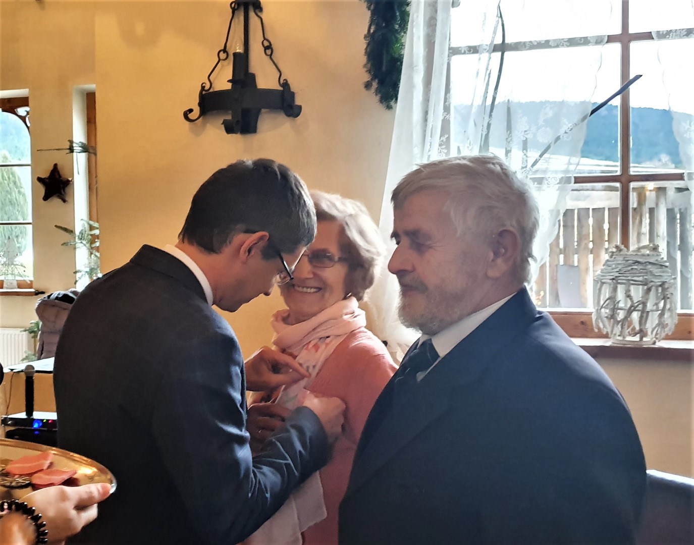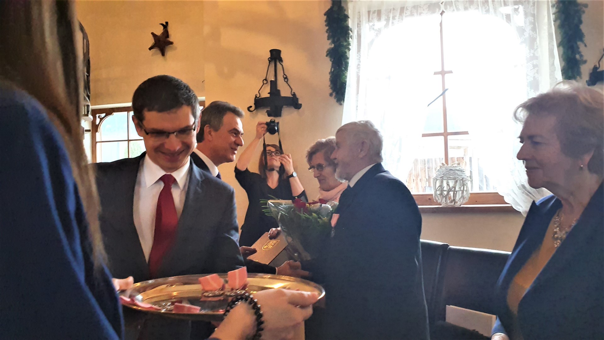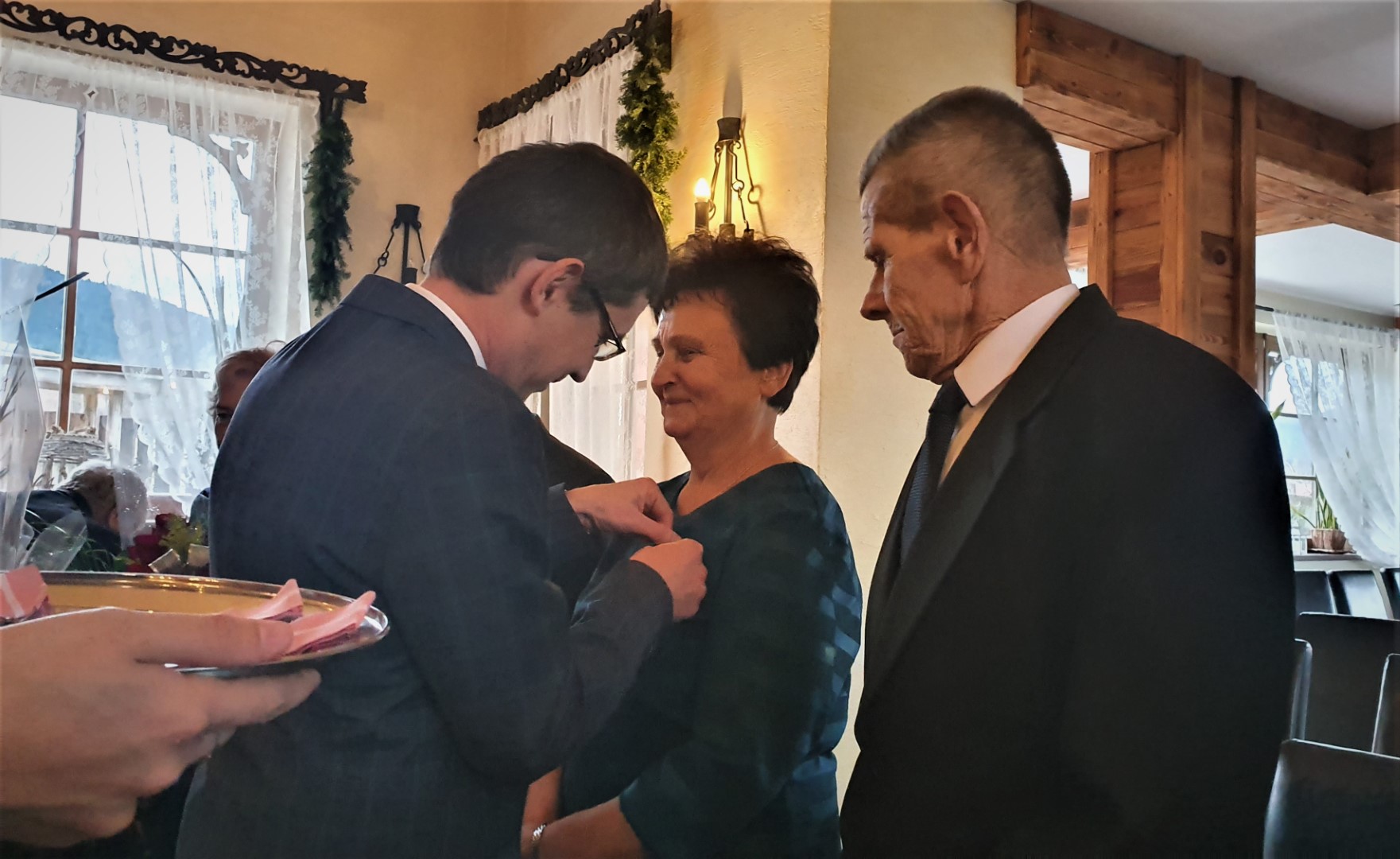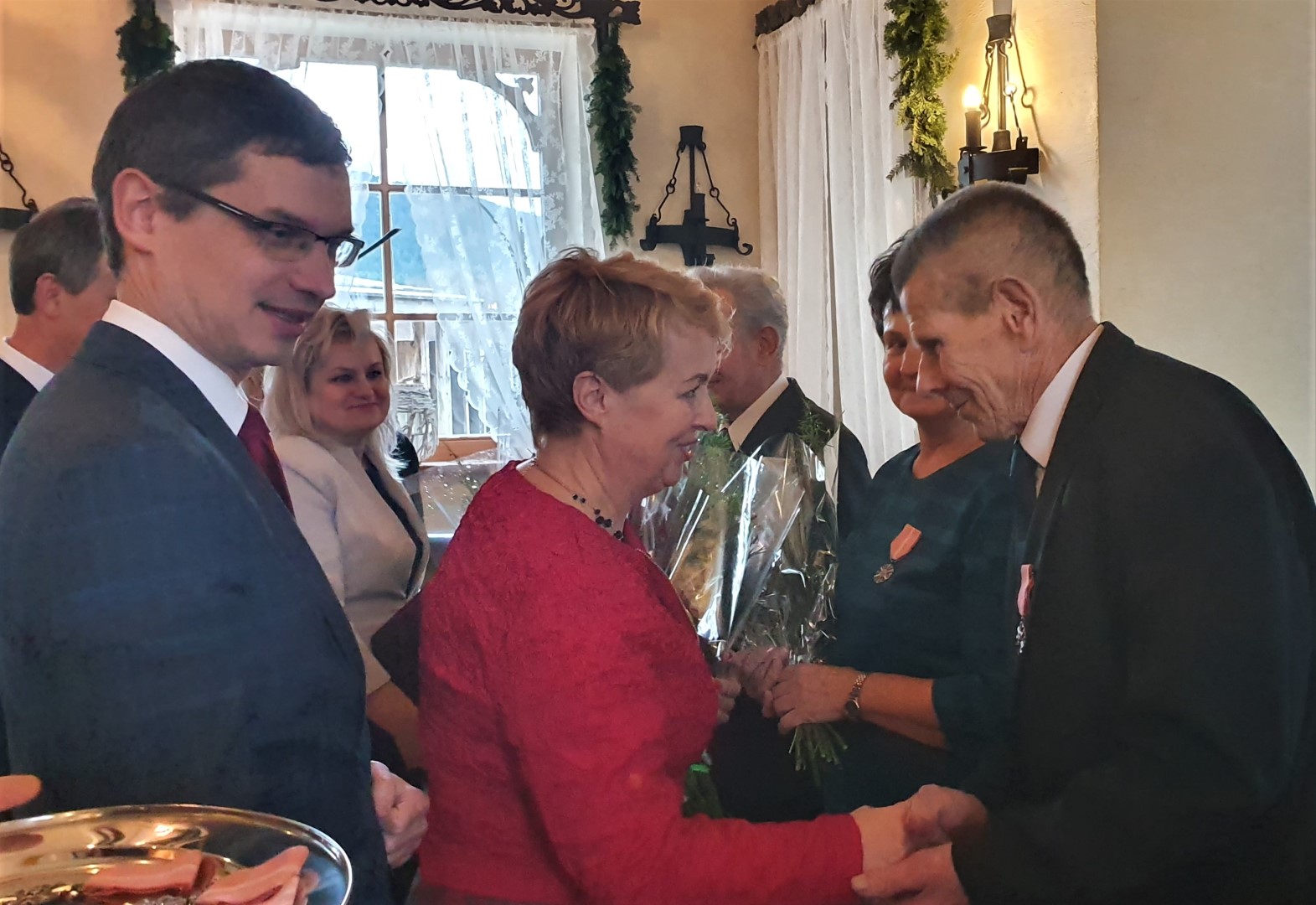 Życzenia dostojnym Jubilatom złożyli również Wójt Paweł Ptaszek, Starosta Limanowski Mieczysław Uryga oraz Przewodnicząca Rady Gminy Stanisława Urbańska. Do życzeń dołączyła się Kierownik USC, organizatorka uroczystości, Pani Maria Pala. Po czym nastąpiła ceremonia wręczenia medali, w której wzięły również udział Panie Stanisława Urbańska (Przewodnicząca RG Tymbark), Stanisława Kaptur (sekretarz Urzędu ), Zofia Duda (Skarbnik) oraz Maria Pala (Kierownik USC).