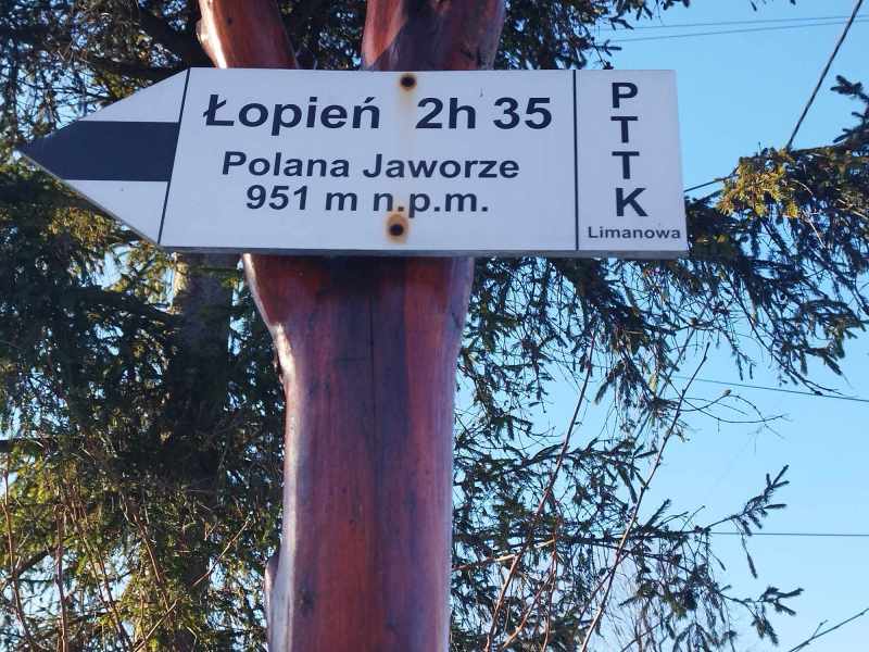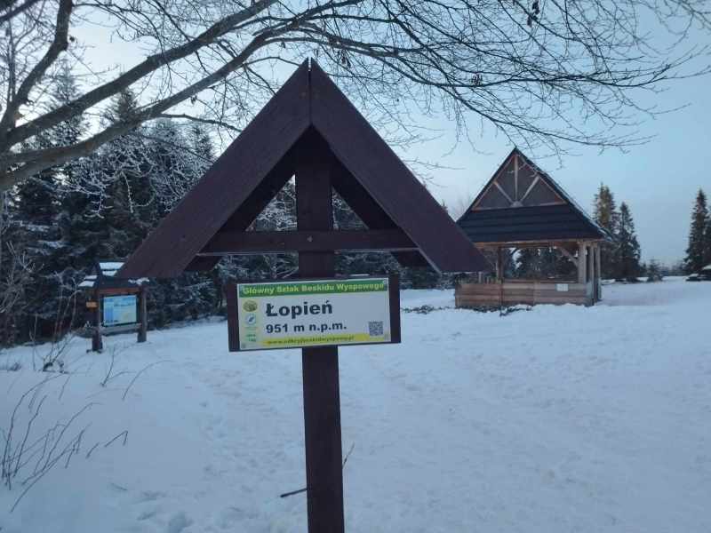 - czas wejścia na Łopień z Przełęczy Rydza-Śmigłego 1 h (↓ 0:45 h), suma podejść 250 m.