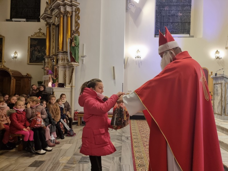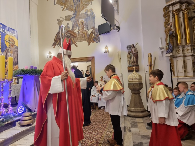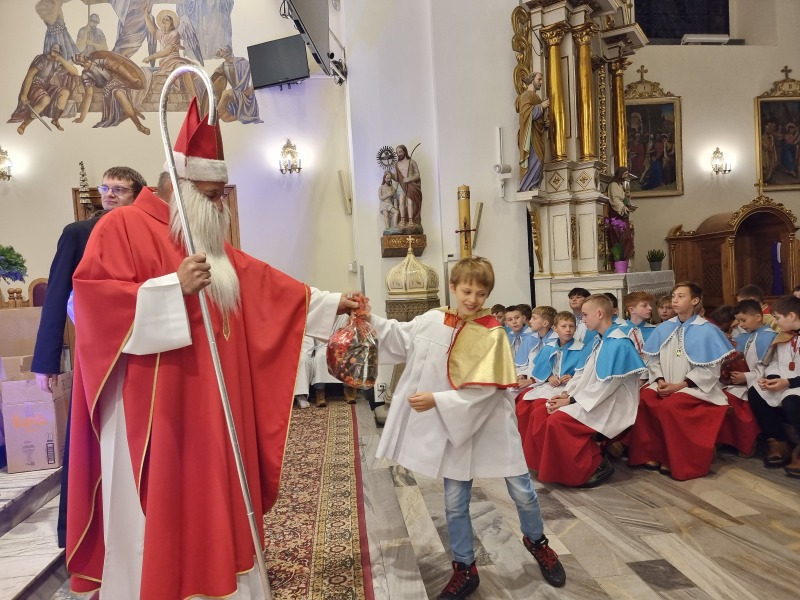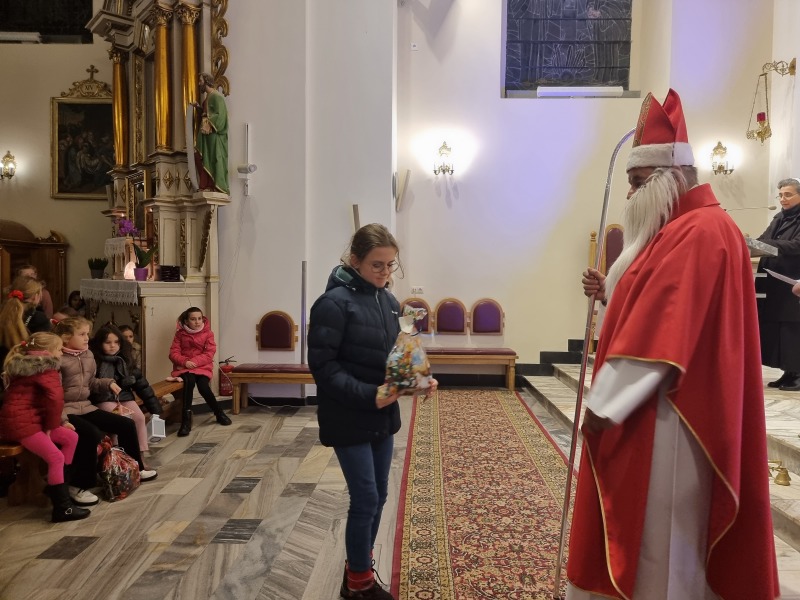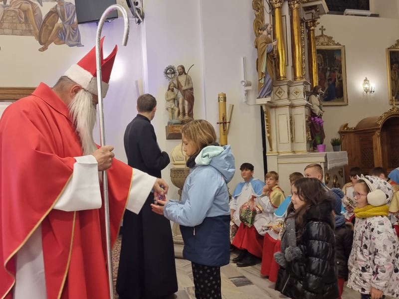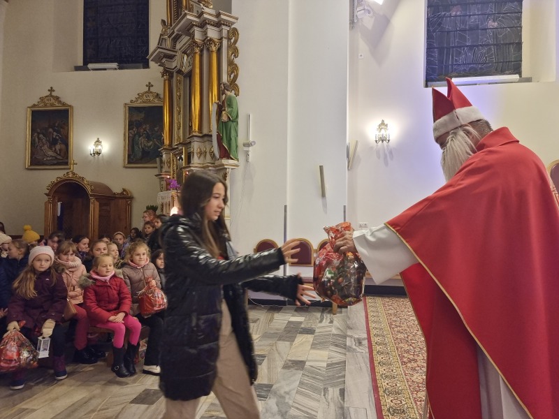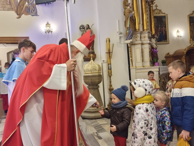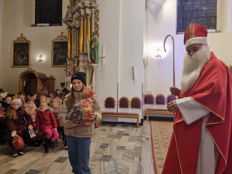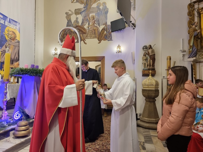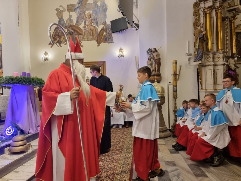 Za zakończonej Mszy św.roratniej do kościoła parafialnego w Tymbarku wszedł św. Mikołaj, zmęczony, po długiej podróży, po dniu wyczerpującej pracy. Ale przecież wiedział, że nie może nie spotkać się z dziećmi, które w każdy dzień w Adwent biorą udział w Roratach, oraz z tymi, które przez cały rok aktywnie uczestniczą w życiu parafii.