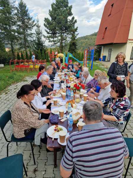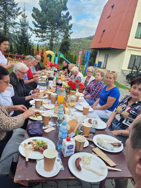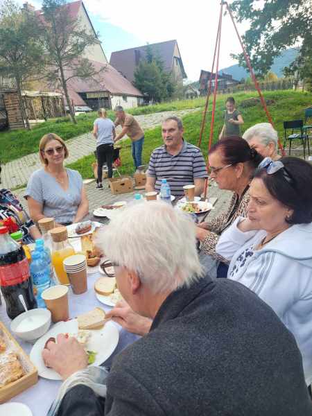 Sobotnie wspólne biesiadowanie Seniorów przy budynku OSP Tymbark to pierwsze spotkanie w ramach programu Fundacji Biedronki „Danie Wspólnych Chwil”. Na dzisiejsze, przy pięknej, słonecznej, jesiennej pogodzie przybyło na publiczne zaproszenie Pań z KGW Tymbark około 30 osób. Było smaczne jedzenie (co w każdym przypadku jest oczywiste), rozmowy, ale też wspólne śpiewanie przy akompaniamencie akordeonu i z wykorzystaniem przygotowanych przez organizatorów śpiewników. Na następne wspólne biesiadowanie panie zapraszają na listopad, przy czym dokładny termin będzie podany na stronach internetowych.