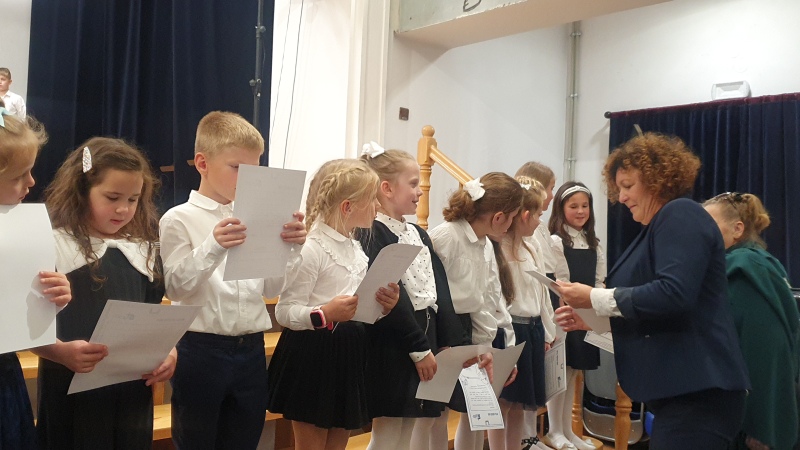 Pierwszoklasiści otrzymali symboliczne prezenty od Społecznego Towarzystwa Oświatowego, którego Koło w Tymbarku jest organem prowadzącym szkołę muzyczną.