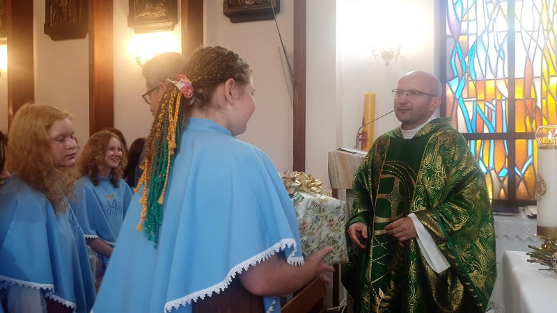 Dziękujemy Ci Księże Sylwestrze, że od początku swej obecności w naszej parafii pokazałeś nam jak można pięknie z prostotą i pokorą służyć Bogu i drugiemu człowiekowi w codziennej, ofiarnej pracy duszpasterskiej. Dziękujemy Ci za Tę postawę służby, za autentyczność w relacjach z dziećmi i za piękny, ciepły sposób rozmowy z nimi o Bogu i sprawach wiary, za czas poświęcony na towarzyszenie młodym członkom naszej wspólnoty. Wierzymy, że to Twoje zaangażowanie w pracy z dziećmi i młodzieżą w zakresie dotyczącym ich uczestnictwa w życiu Kościoła i pogłębiania wiary, stanowić będzie ich kapitał duchowy na całe życie. Pozostaną w naszej pamięci Twoje refleksyjne i zawsze bardzo starannie przygotowane homilie oraz kazania okolicznościowe.