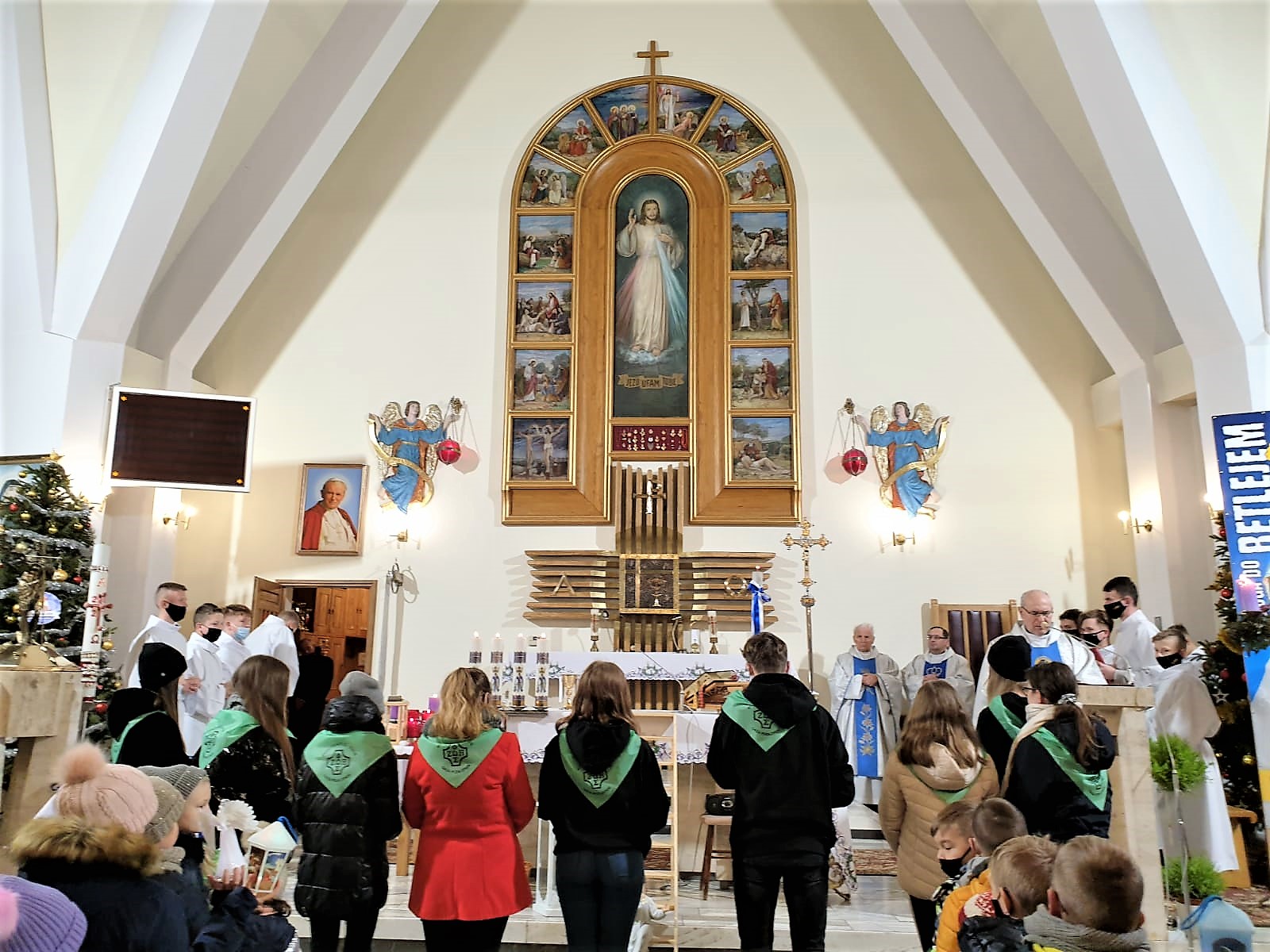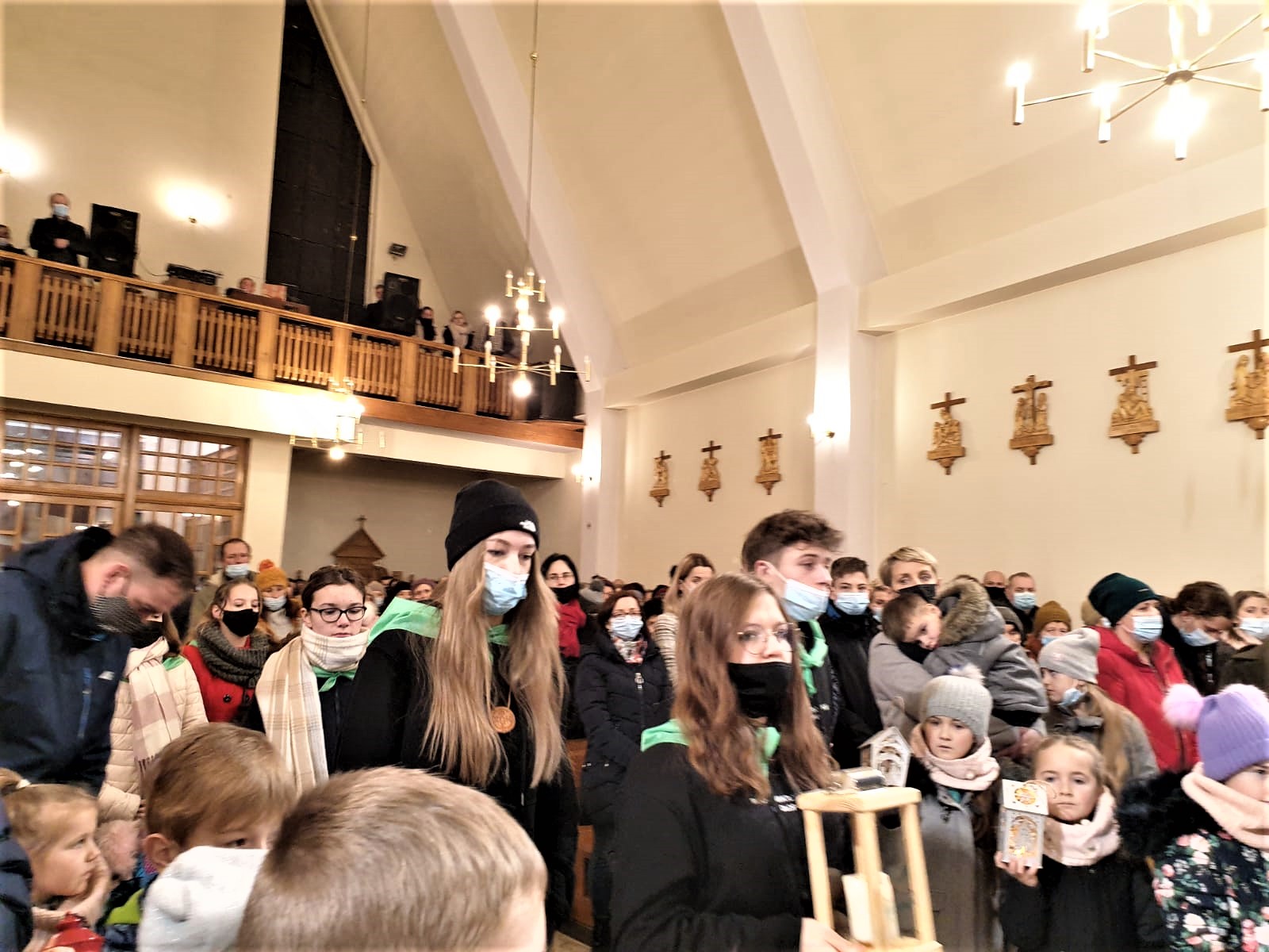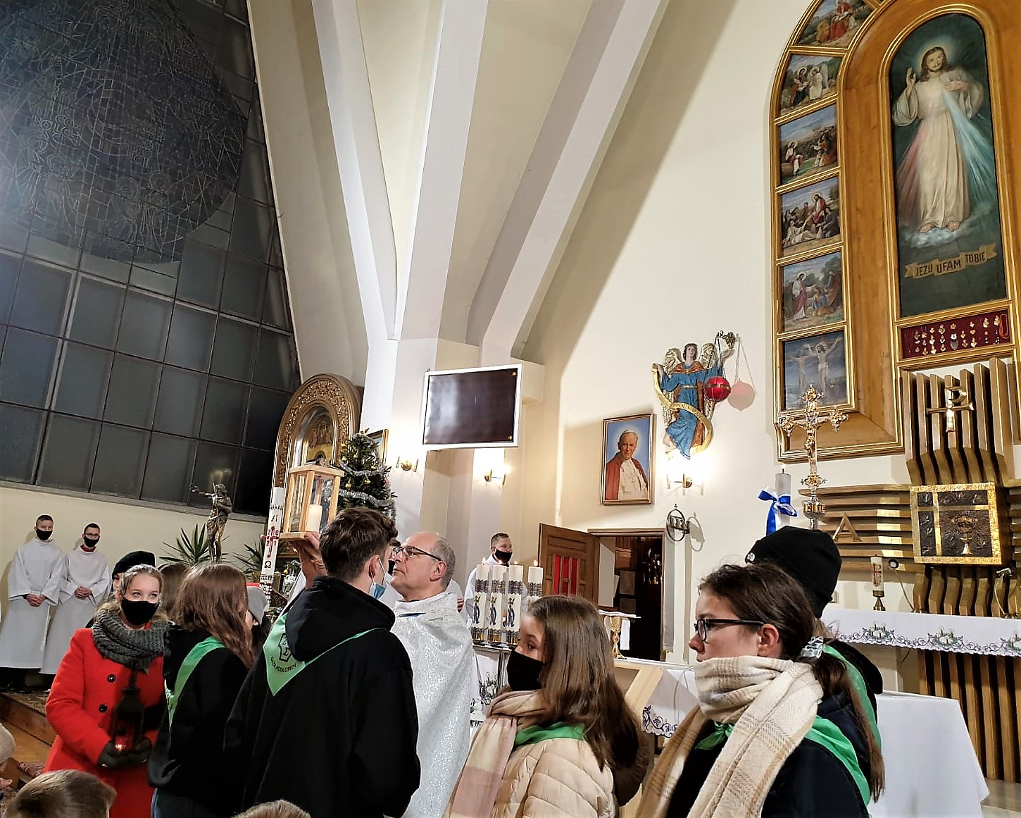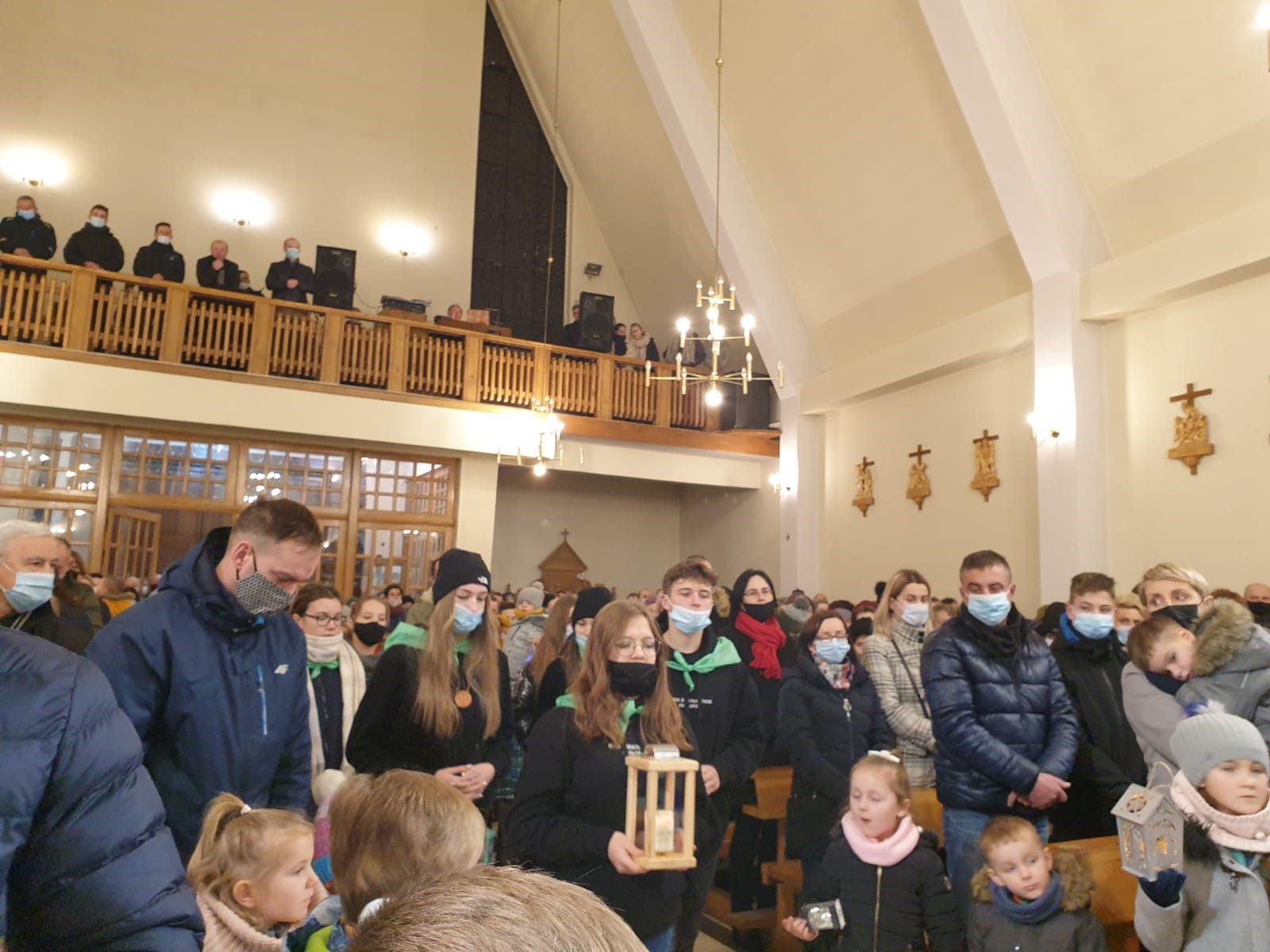 Dzisiaj rano, podczas ostatnich Rorat 2021, młodzież z OAZY Ruch Światło Życie przekazała księdzu proboszczowi Wiesławowi Orwatowi Światełko Betlejemskie. Wierni, po zakończonej Mszy świętej, mogli Światełko „pobrać” i zanieść do swoich domów, aby towarzyszyło im podczas Wigilii i Świąt Bożego Narodzenia.