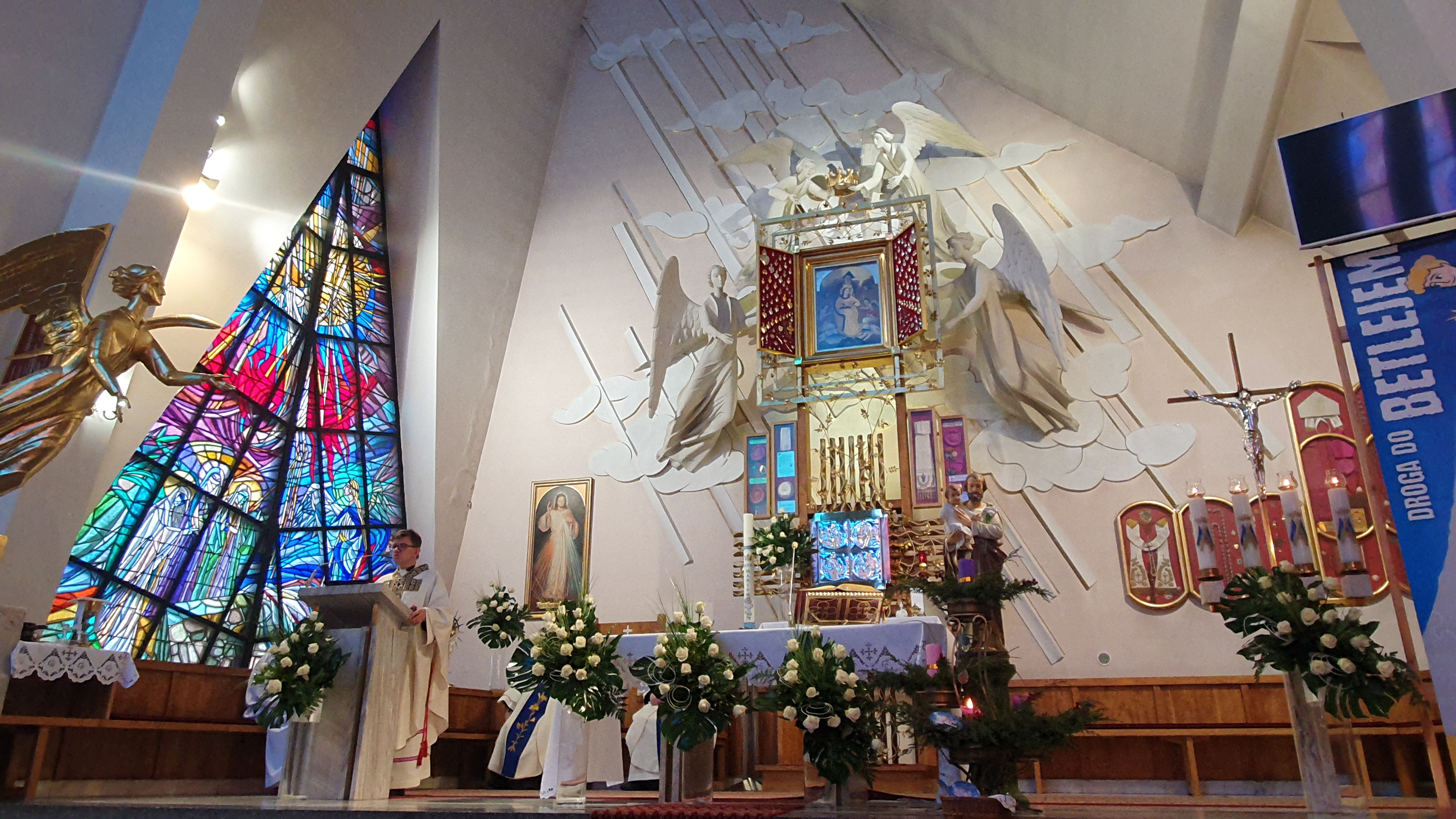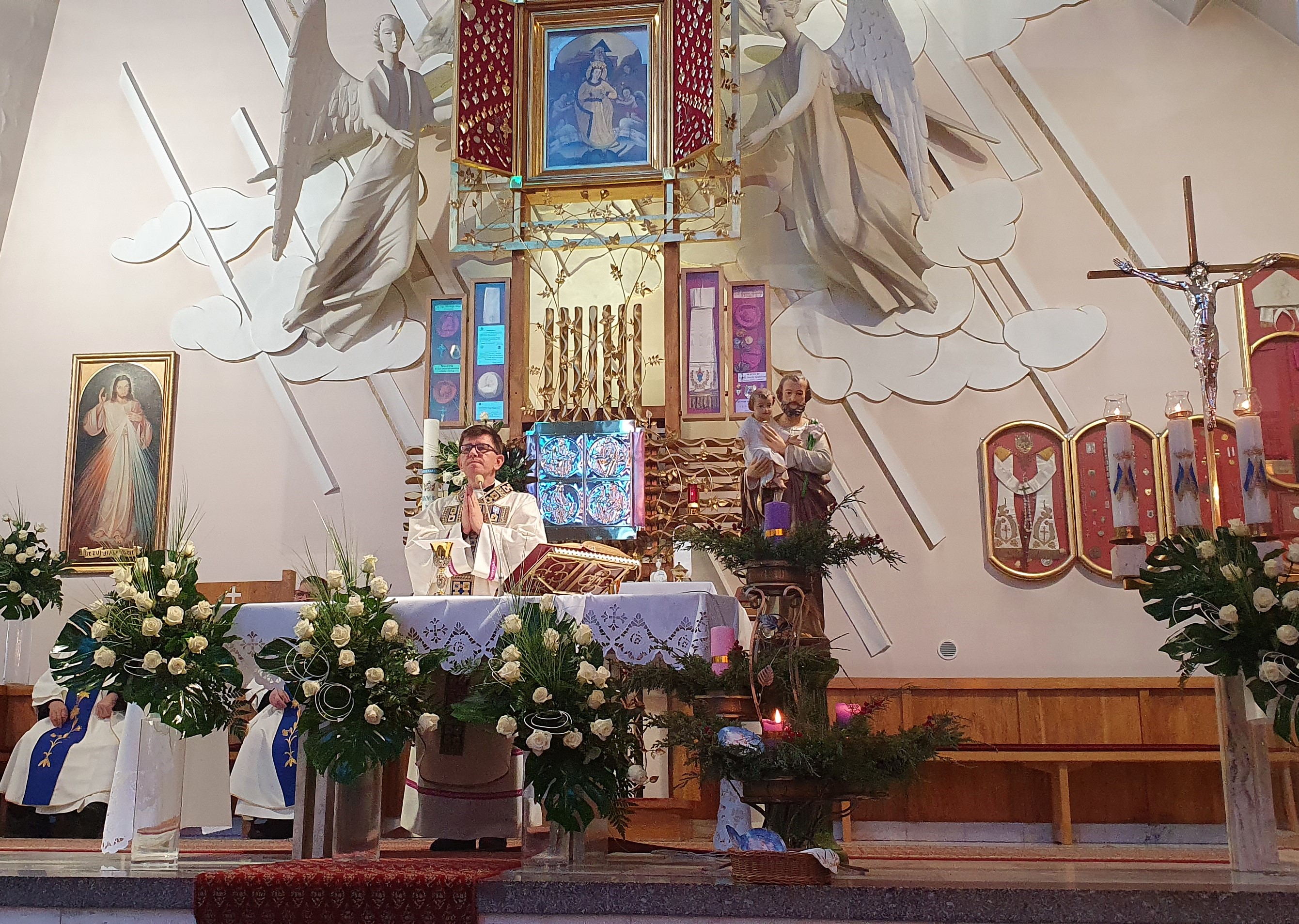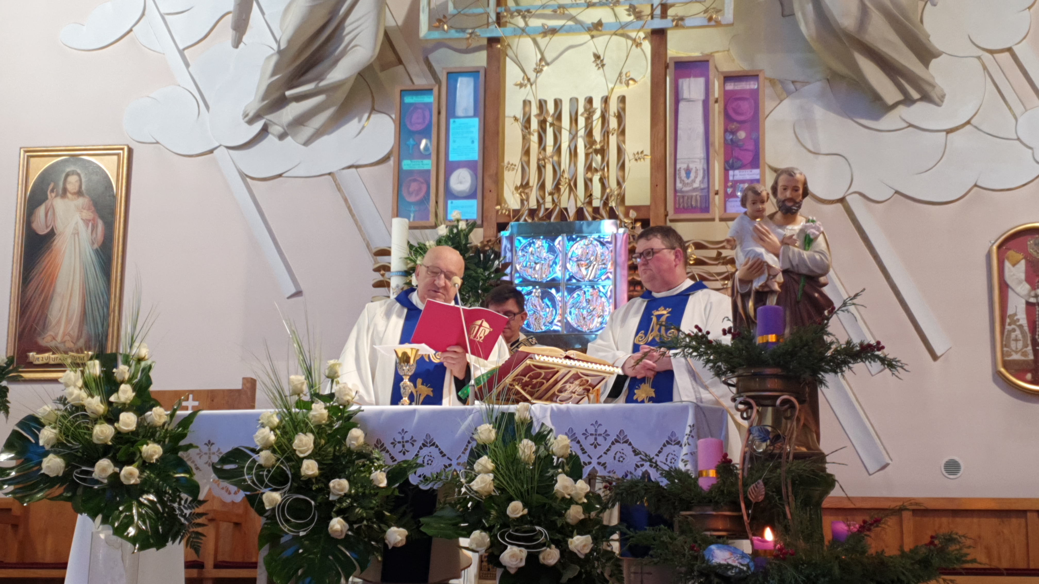 Mszy św.o godz.11 , koncelebrowanej, przewodniczył ks.Józef Młyński, który też wygłosił kazanie. Eucharystię sprawowali też ksiądz Józef Waśniowski (były proboszcz) oraz kustosz Sanktuarium ks.Bogdan Stelmach.