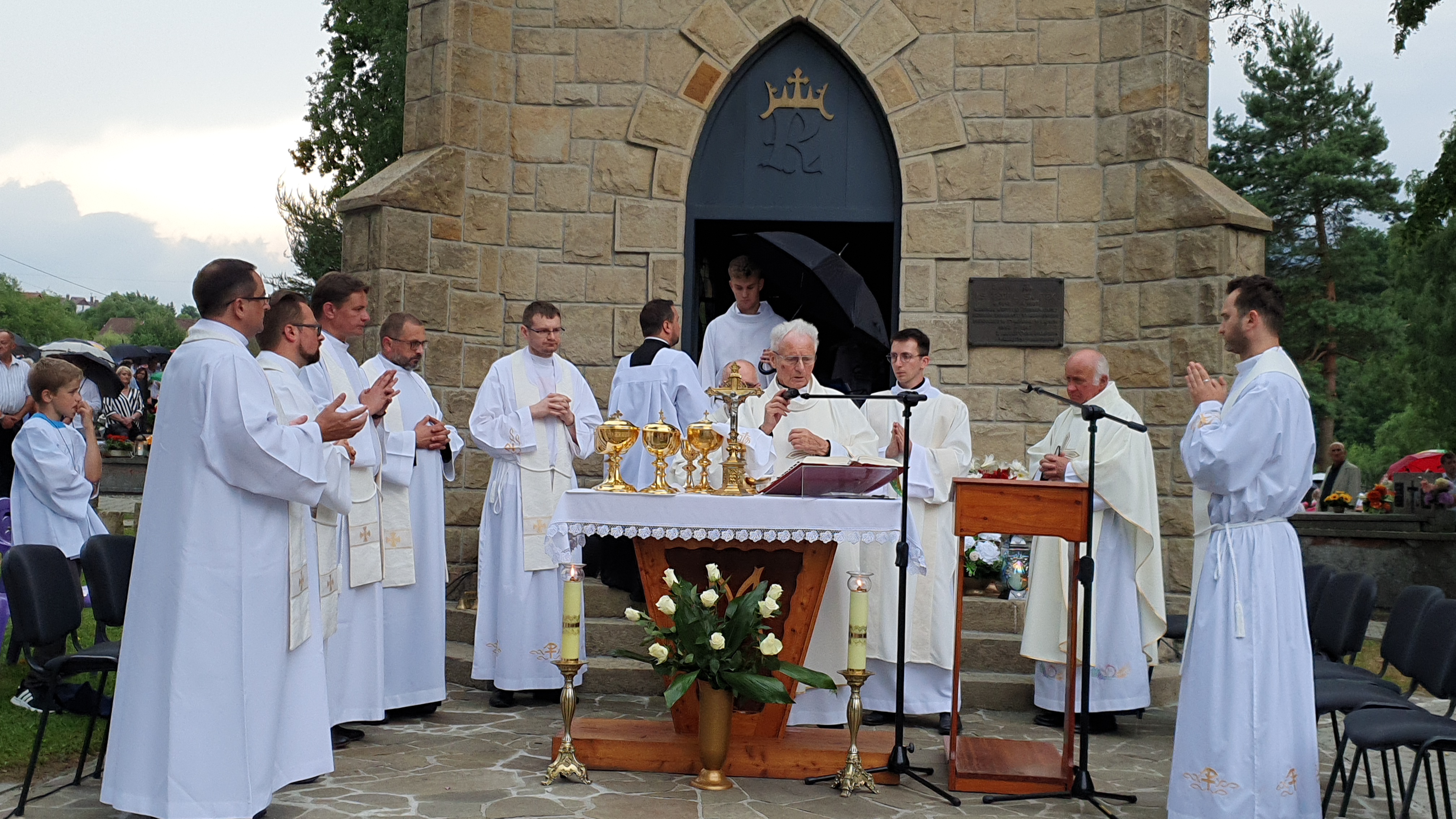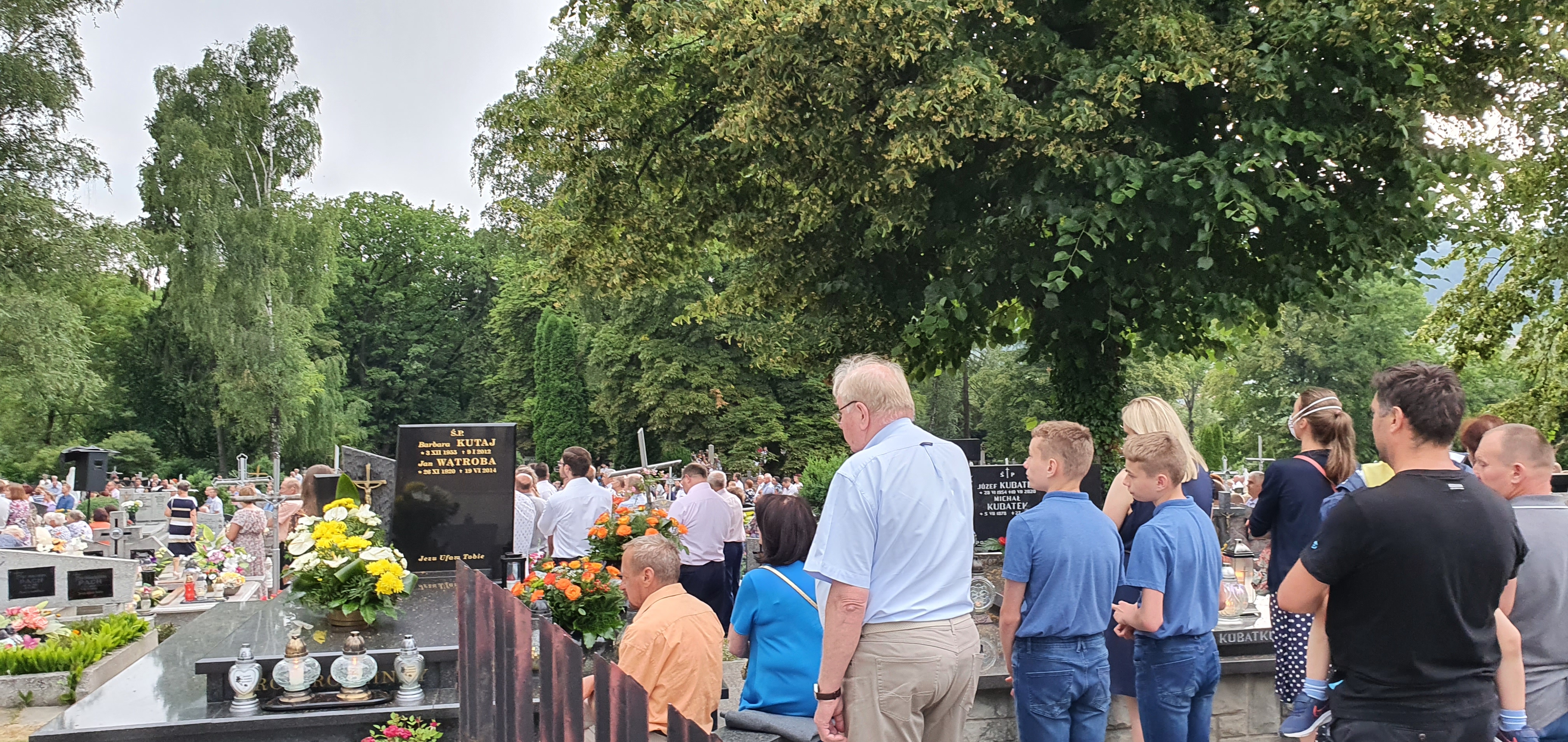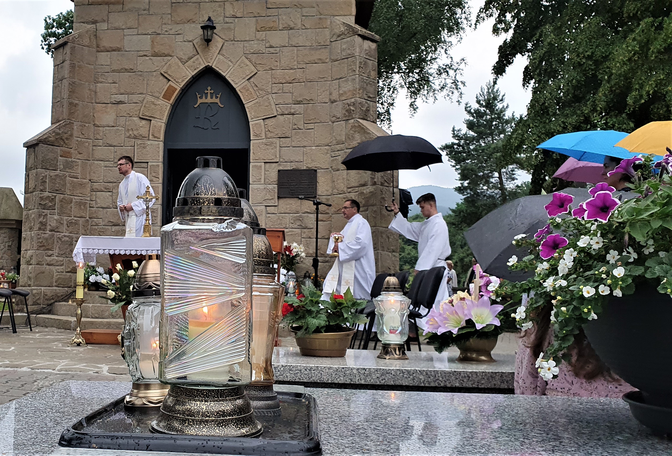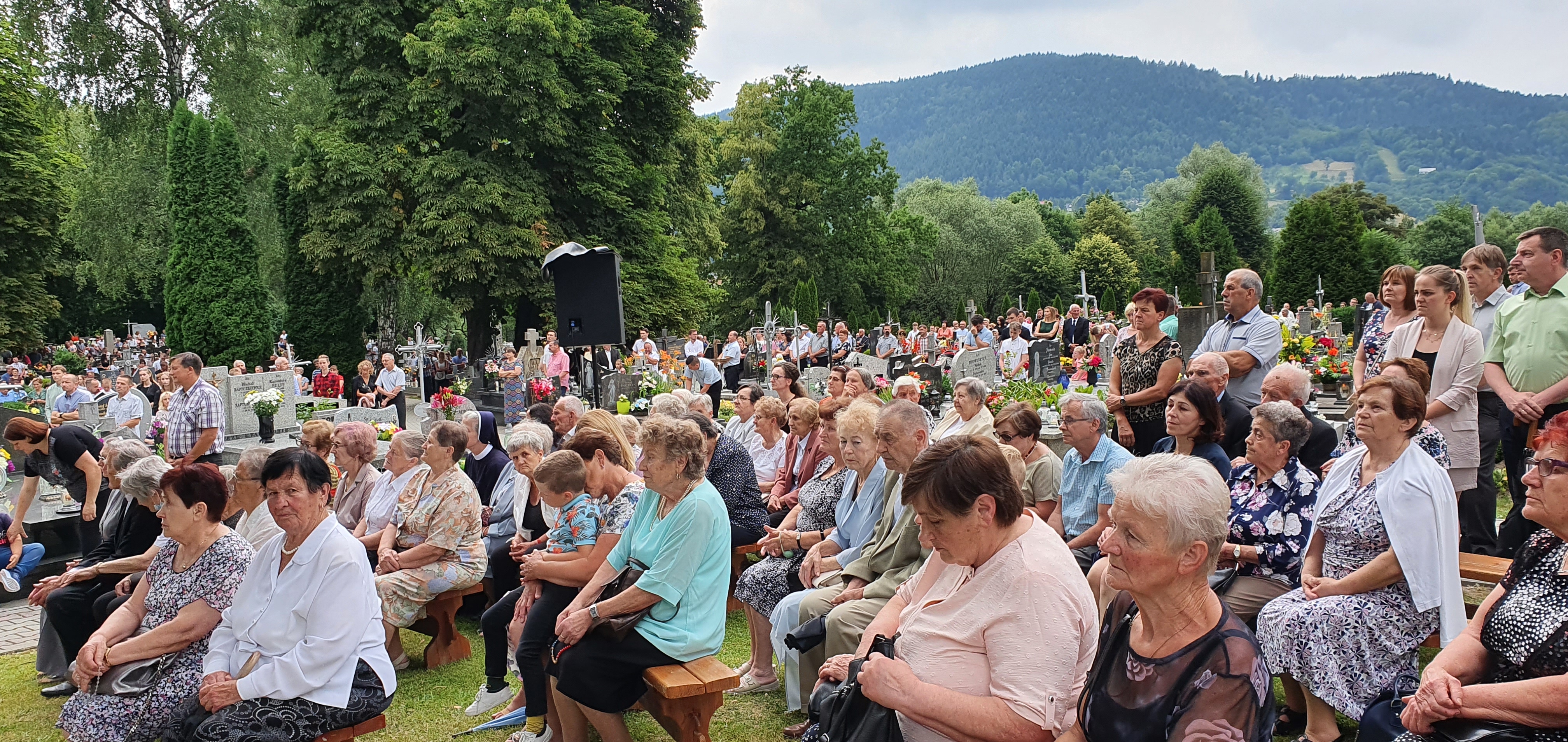 We Mszy świętej wzięło udział bardzo, bardzo,  dużo osób, wypełniających cały obszar cmentarza. Od samego początku nadciągała  burza, deszcz był już tuż, tuż. Dzięki Bogu zaczął on trochę padać dopiero pod koniec Eucharystii, a już intensywnie rozpadało się po jej zakończeniu. Burza, jak to zwykle w Tymbarku bywa 🙂 ,  rozeszła się wokół.