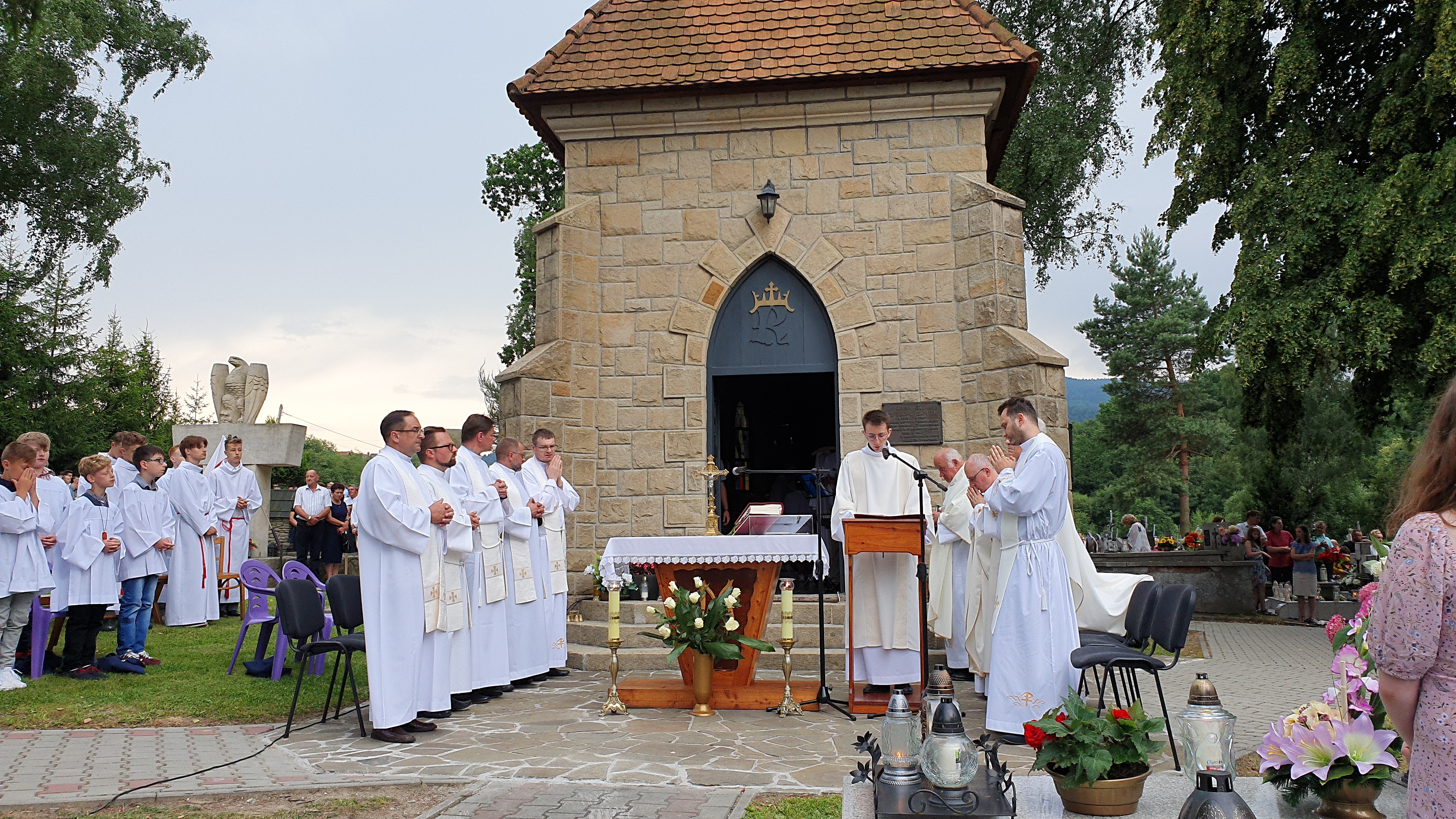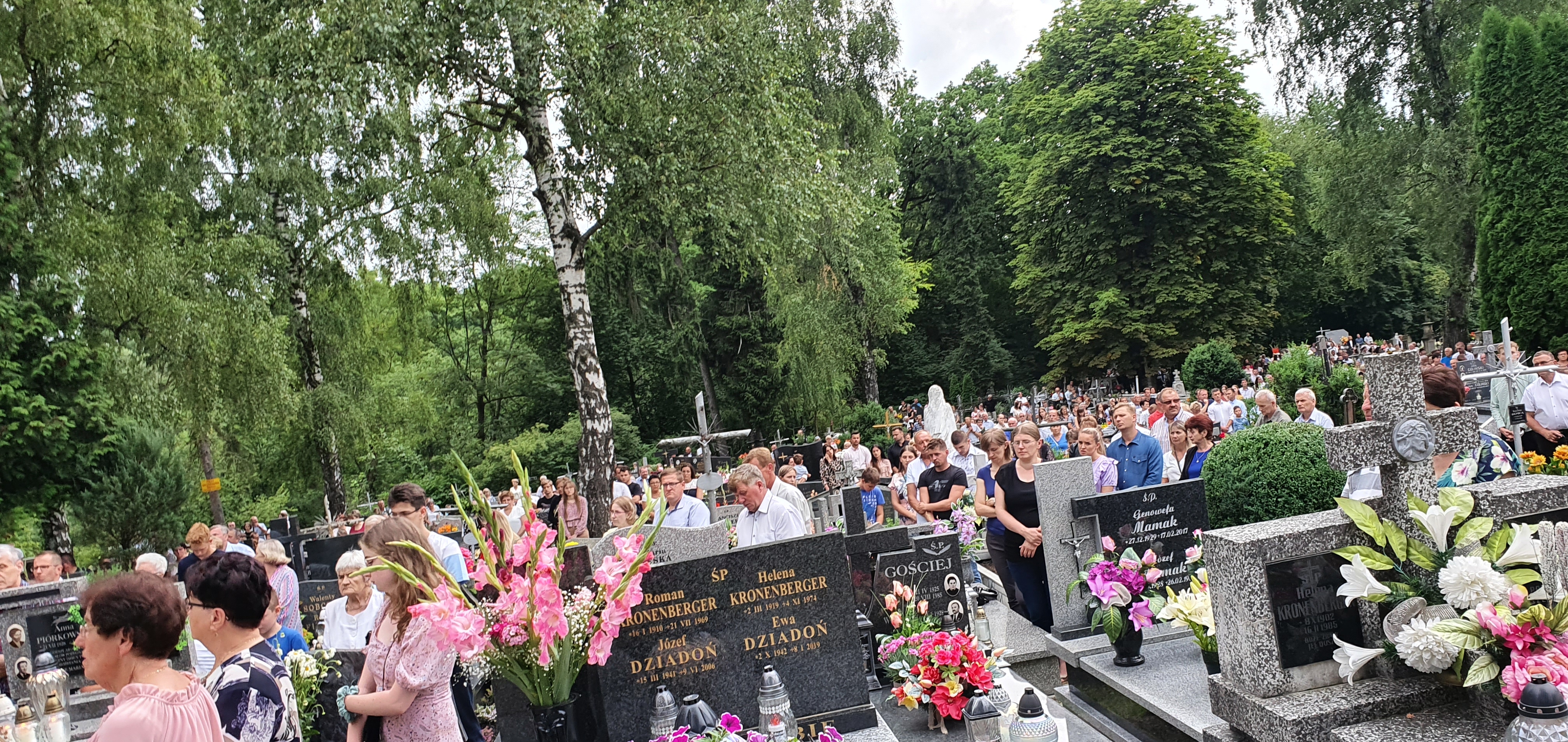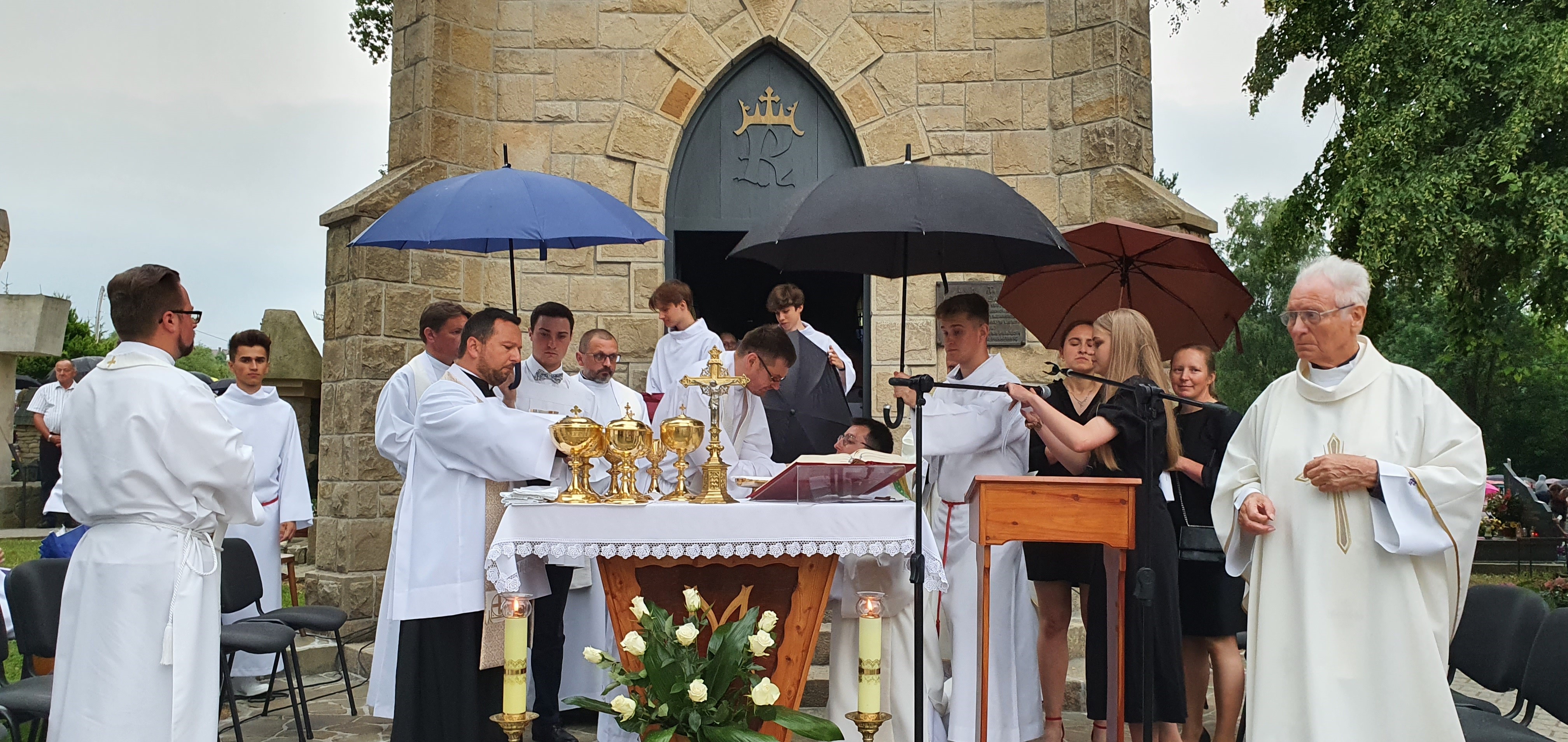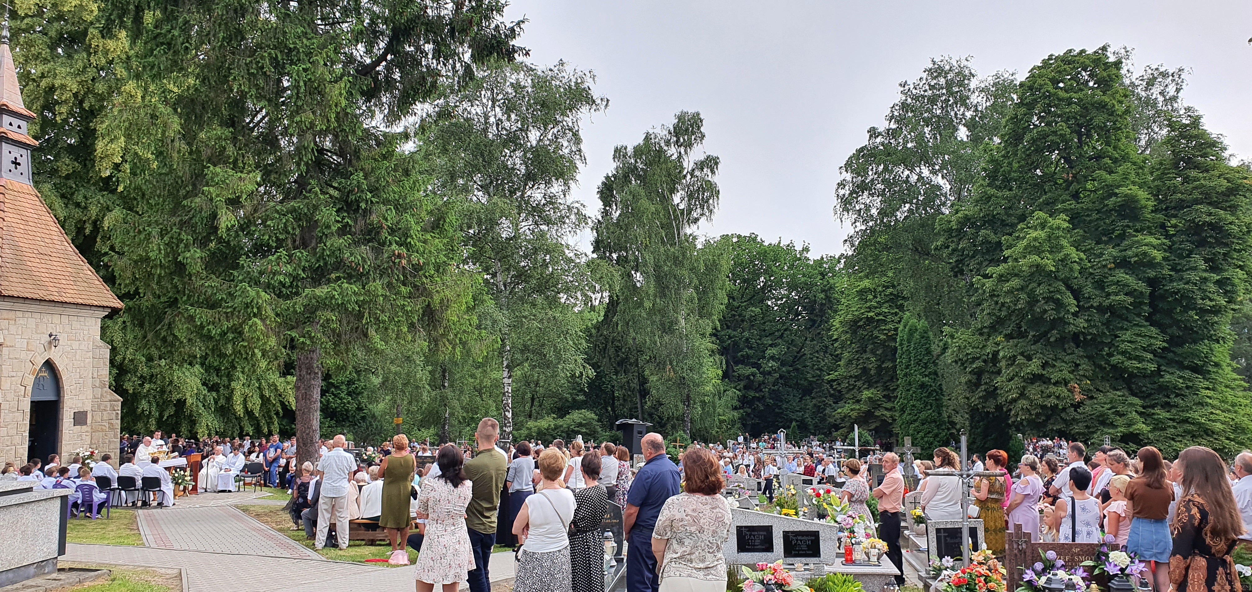 We Mszy świętej wzięło udział bardzo, bardzo,  dużo osób, wypełniających cały obszar cmentarza. Od samego początku nadciągała  burza, deszcz był już tuż, tuż. Dzięki Bogu zaczął on trochę padać dopiero pod koniec Eucharystii, a już intensywnie rozpadało się po jej zakończeniu. Burza, jak to zwykle w Tymbarku bywa 🙂 ,  rozeszła się wokół.