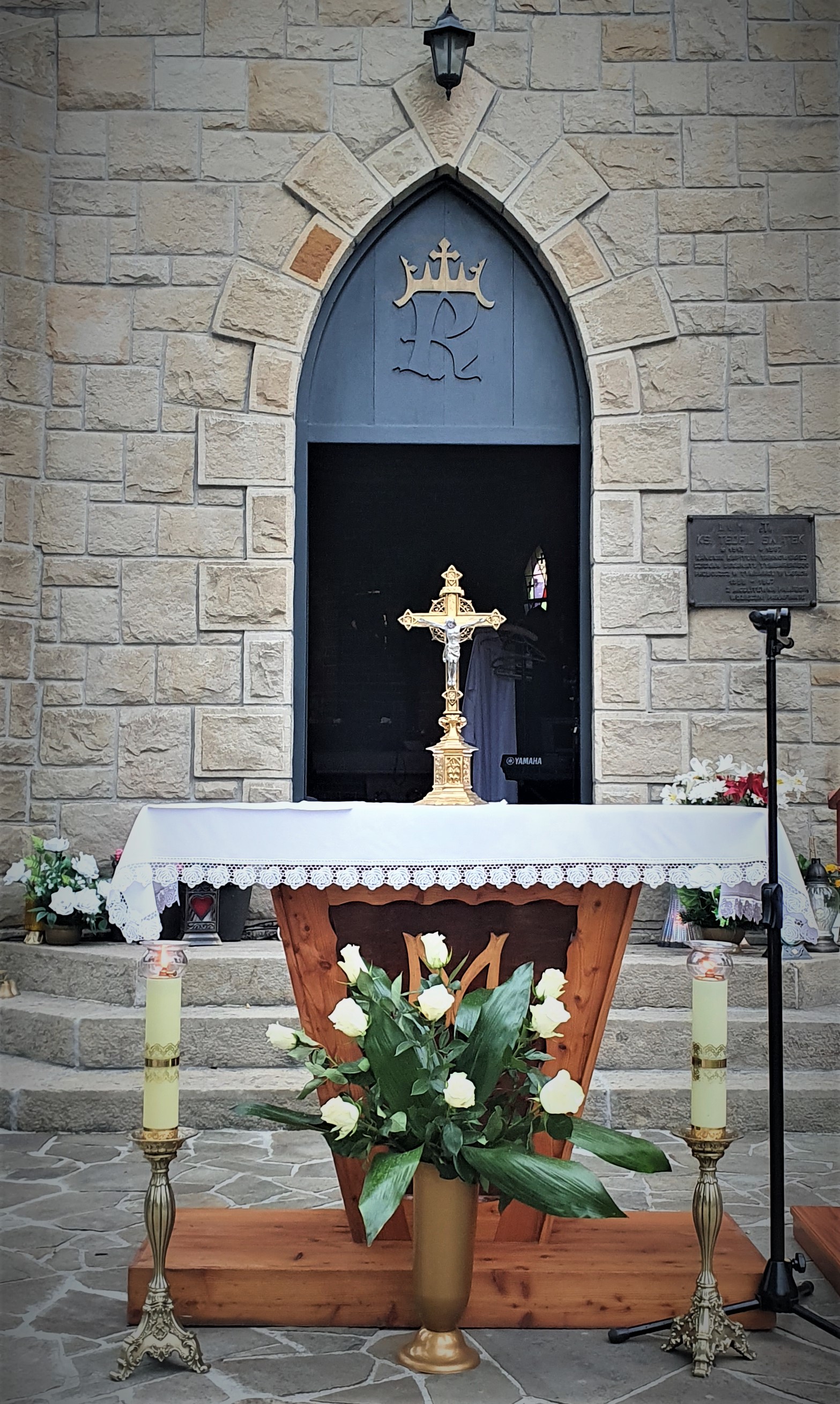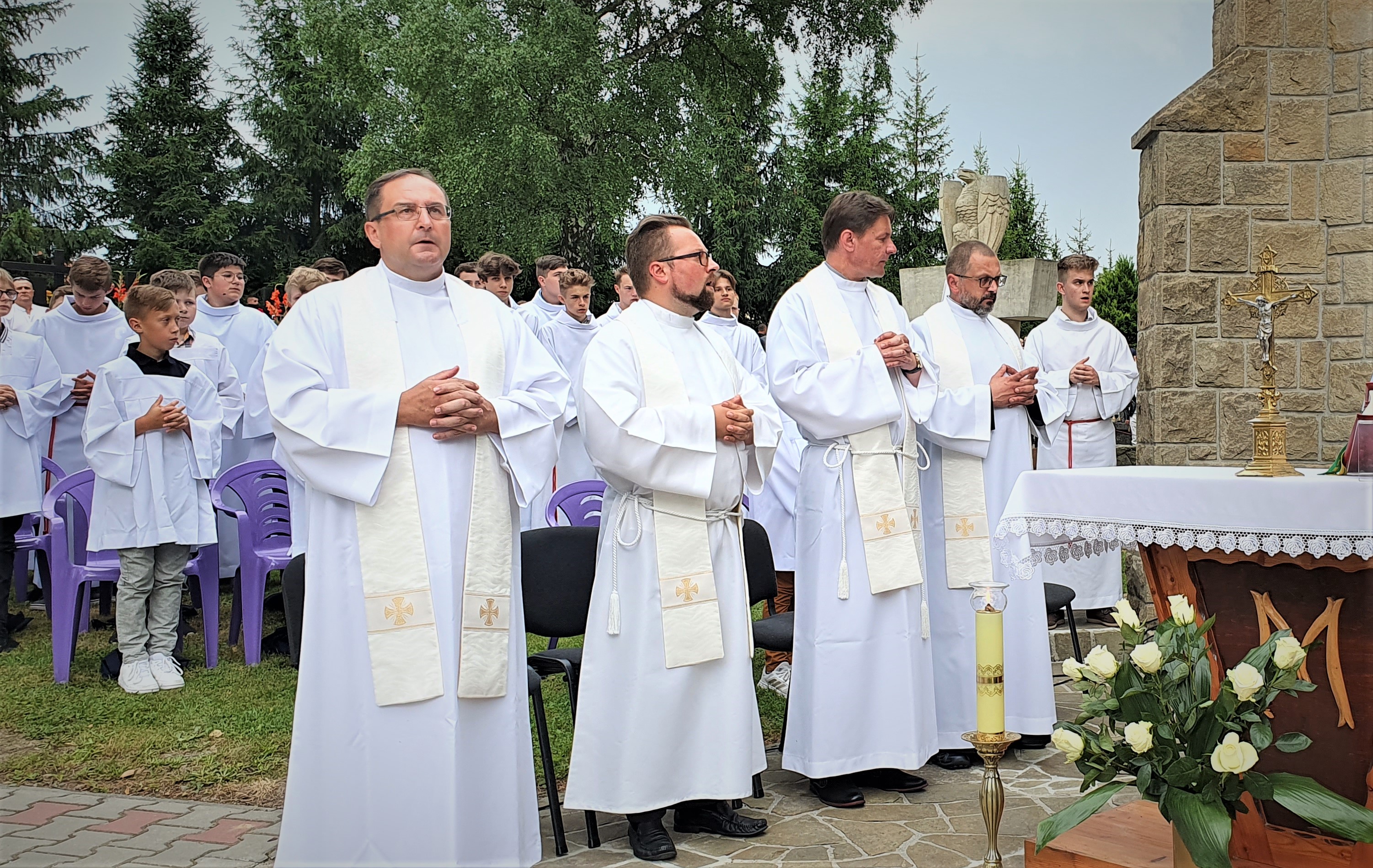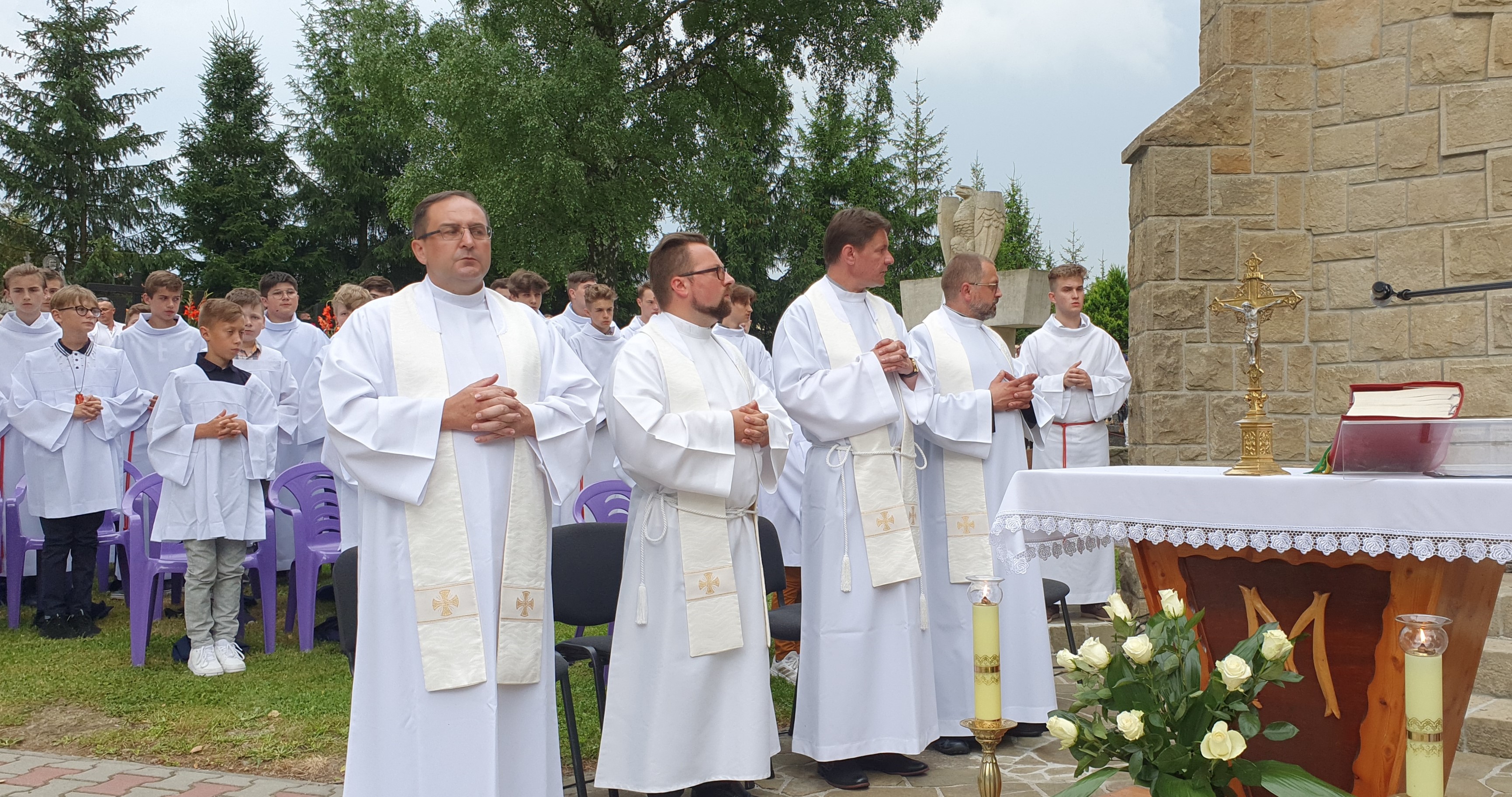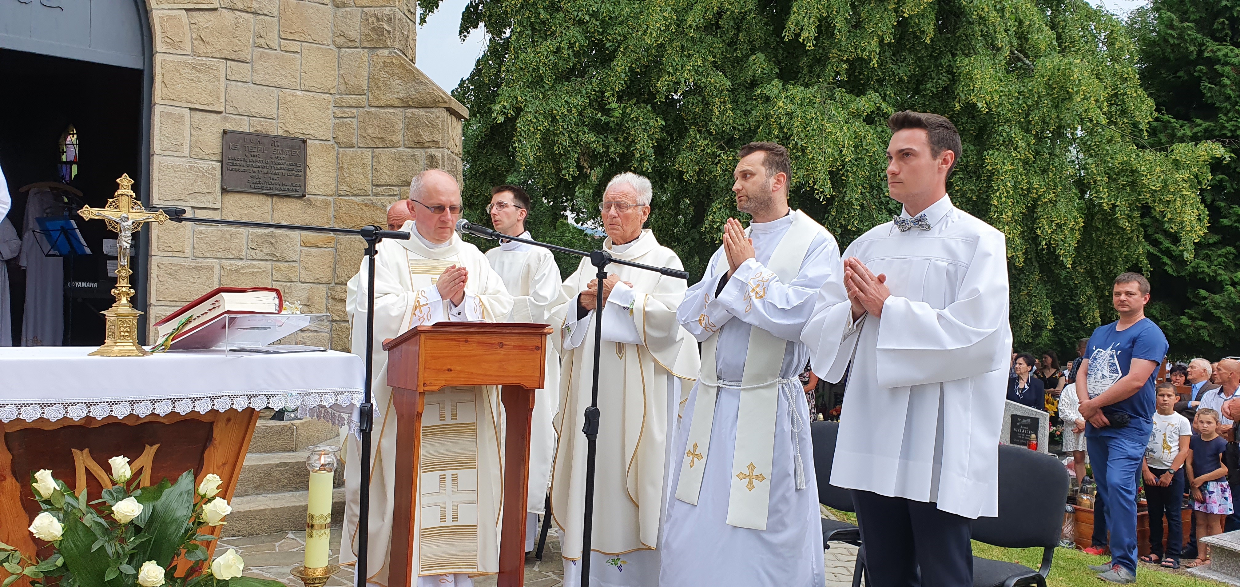 We Mszy świętej wzięło udział bardzo, bardzo,  dużo osób, wypełniających cały obszar cmentarza. Od samego początku nadciągała  burza, deszcz był już tuż, tuż. Dzięki Bogu zaczął on trochę padać dopiero pod koniec Eucharystii, a już intensywnie rozpadało się po jej zakończeniu. Burza, jak to zwykle w Tymbarku bywa 🙂 ,  rozeszła się wokół.