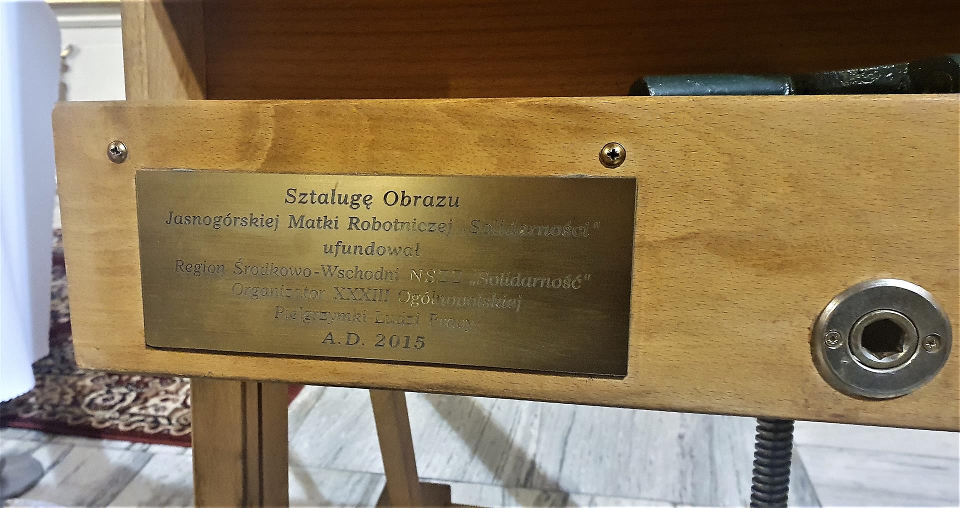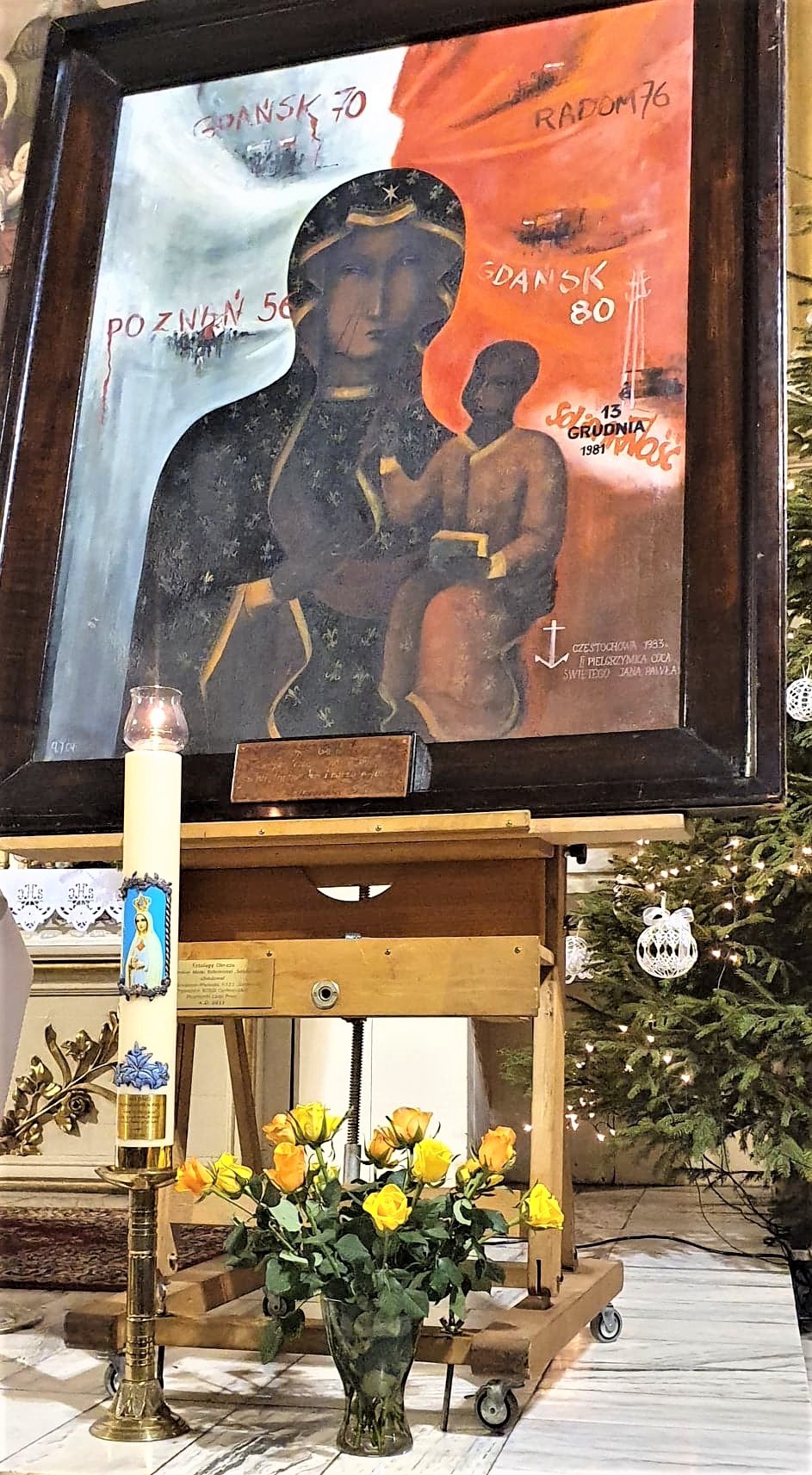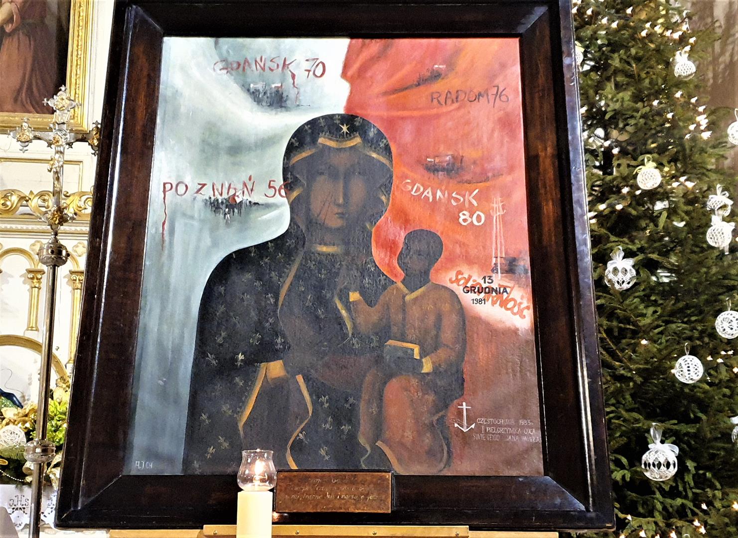 Tło obrazu, na którym widnieje wizerunek Matki Bożej Częstochowskiej stanowi biało-czerwona flaga upamiętniająca zrywy robotnicze. Obraz wykonano w trzech kopiach różnej wielkości. Najmniejszy z nich otrzymał na własność bł. ks. Jerzy Popiełuszko i w prywatnej rozmowie stwierdził, że dla niego jest to Matka Boża Solidarności. Drugi, nieco większy, trafił do kościoła św. Brygidy w Gdańsku. Natomiast największy obraz związkowcy podlaskiej Solidarności przekazali podczas II Pielgrzymki Ludzi Pracy na Jasną Górę w 1984 r., jako symbol spotkań u stóp Czarnej Madonny.