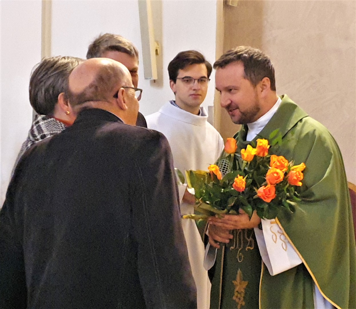 22 września obchodzone było wspomnienie św. Tomasza z Villanuevy, patrona księdza Tomasza Wrońskiego, od sierpnia pracującego w tymbarskiej parafii (ks.Tomasz pełni funkcję księdza- seniora w parafii). W związku z tym na Mszy św.koncelebrowanej o godz.11.30, której przewodniczył ks.proboszcz dr Jan Banach, a Eucharystię sprawował też ks.Tomasz, wspólnota parafialna modliła się w intencji ks.Tomasza. Po zakończonej Eucharystii przedstawiciele parafii oraz chóru parafialnego (który swoim śpiewem wzbogacił nabożeństwo) złożyli księdzu Tomaszowi życzenia: